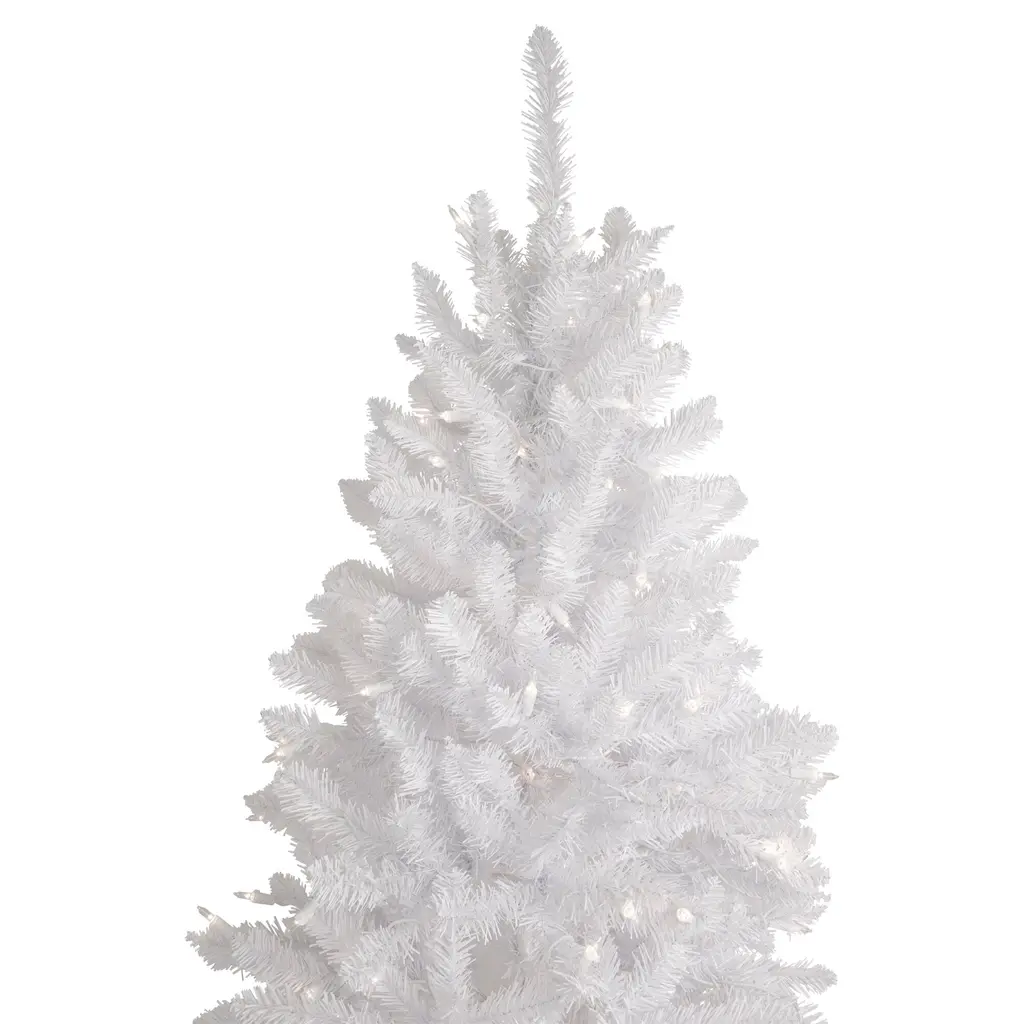 The Rapids White Pine offers an alternative to a traditional green Christmas tree. It comes with crisp white branches and a matching tree stand. Its slender profile is ideal for smaller spaces and corner displays. Designed with hinged branches that make for easy setup fluffing and takedown. The tree comes prestrung with clear incandescent mini lights that give a soft warm glow. Your family and friends can enjoy this durable and timeless addition to your holiday decor for many years to come! Product features: Pre-lit with 350 clear lights. Bulb size: mini. Bulb type: incandescent. 1075 branch tips. 1.5" wide tapered tips. 36" white lead cord. 4-piece easy assembly (including stand). Pencil profile tree. Additional product features: Hinged branch construction. Light sets on tree are UL certified and approved for indoor or outdoor use however the tree itself is recommended for indoor use only. If one bulb burns out the rest will stay lit. Lights are equipped with Lamp Lock feature which makes them replaceable interchangeable and keeps them from falling out. Comes with replacement bulbs and spare fuses. Includes a white metal tree stand. Wire gauge: 22. 120 volts 60 hertz .34 amps 40.8 watts. Dimensions: 7.5' high (from the base of stand to the top of the tree). 30" base diameter (at the widest point). Material(s): PVC/metal/glass bulbs/wire. Note: Branches are compressed for shipment and need to be fluffed out upon arrival to look like the photo.