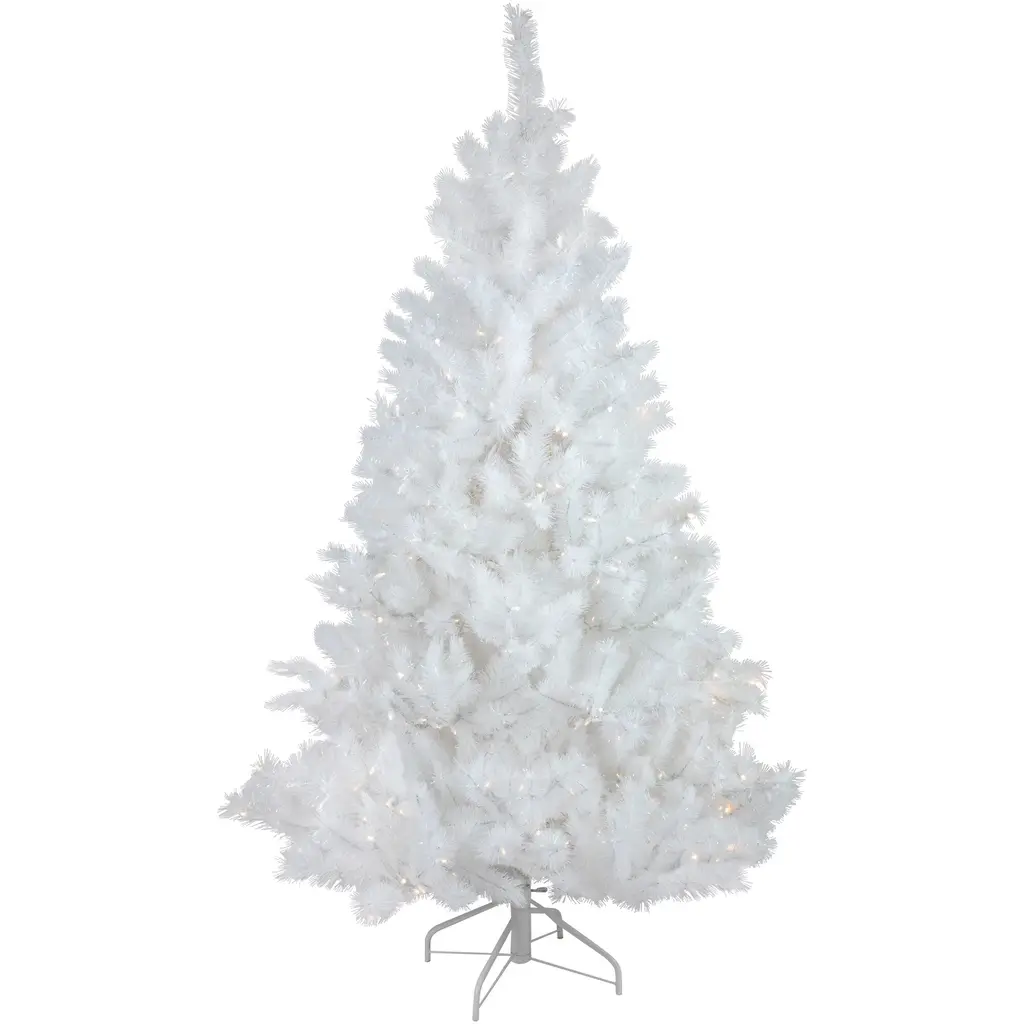 Transform your space into a winter wonderland with the beautiful iridescent white Alaskan pine tree. It is a designer-inspired alternative to a traditional green tree with its dazzling mix of iridescent and white pine needles, sure to reflect the light from the clear mini lights that it comes adorned with. The lush needles give the tree fullness, but it is slim enough to make it ideal for small spaces and allows it to fit perfectly in corners or on tabletops. Product Features: Pre-lit with 250 warm white lights Bulb size: concave wide angle Bulb type: LED 817 tips 1.5" wide tapered tips 14" white lead cord Additional Product Features: Medium profile tree Hinged branch construction Light sets on tree are UL certified and approved for indoor or outdoor use, however the tree itself is recommended for indoor use only If one bulb burns out, the rest will stay lit Lights are equipped with Lamp Lock feature, which makes them replaceable, interchangeable and keeps them from falling out 2-piece easy assembly (including stand) Comes with replacement bulbs and spare fuses Comes with a FREE white metal tree stand Dimensions: 7.5' high (from the base of the stand to the top of the tree) 54" base diameter (at the widest point) Material(s): PVC/metal/glass bulbs/wire