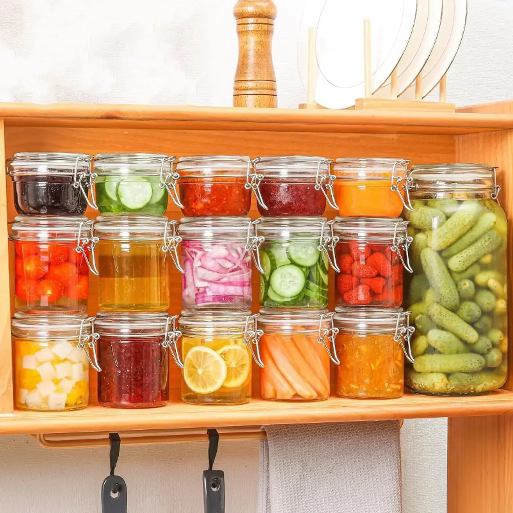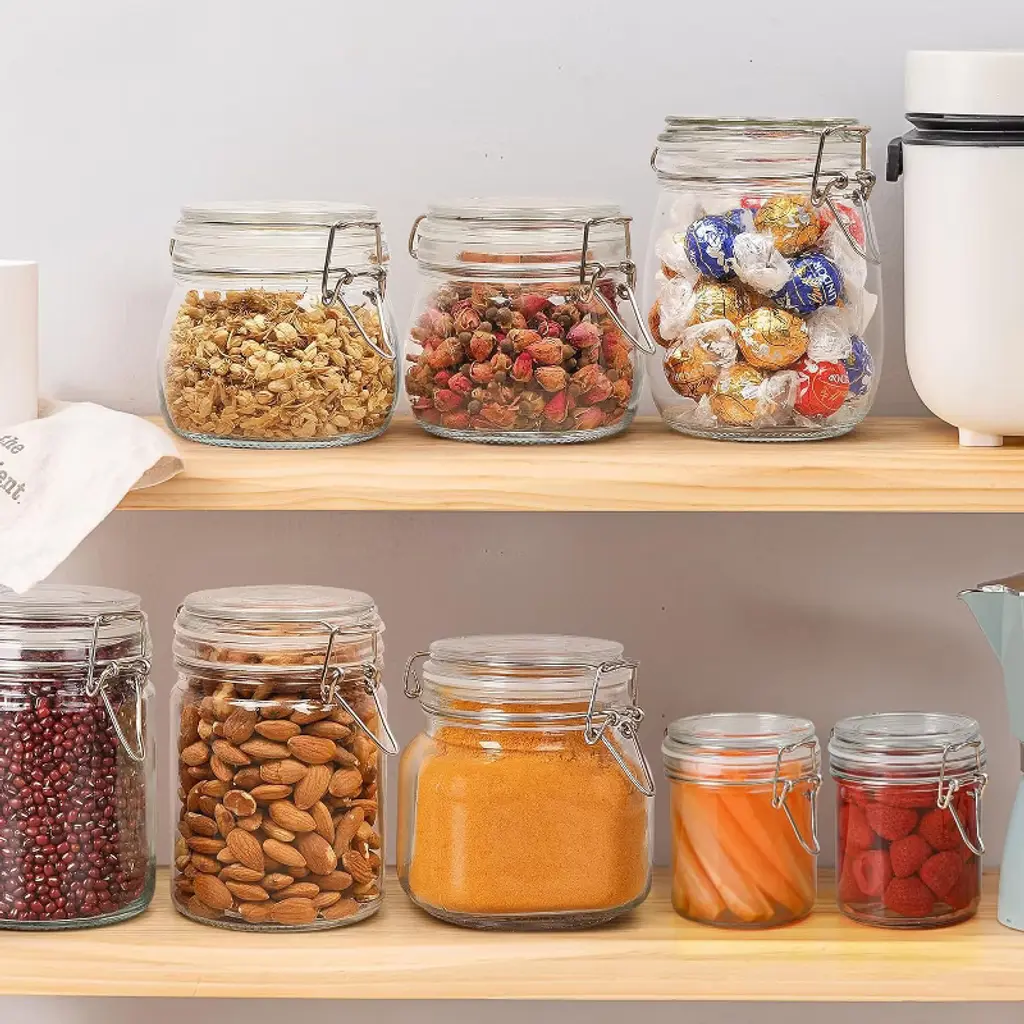 This set of 6 small airtight glass jars, each holding 8oz and featuring a round shape, is a practical addition to any kitchen for food storage, canning, and organizing. Crafted from food-graded glass, each jar is equipped with an airtight lid that includes a silicone gasket and a stainless iron locking clamp—this secure sealing system ensures your food stays clean, fresh, and safe throughout storage, preventing spoilage or contamination. The jars are highly versatile: they work perfectly as canning or pickling jars for home use, and are ideal for preserving a wide range of foods, from jams and chutneys to dry goods like flour, cereal, sugar, spices, nuts, and tea, as well as your favorite snacks such as biscuits. Their transparent, clear design enhances kitchen organization by allowing you to effortlessly monitor food levels at a glance—this lets you track how much of each item you have left and quickly assess the storage condition of your food, eliminating the need to open jars unnecessarily. Additionally, the jars are easy to fill and clean: they have a wide enough mouth for convenient refilling, and their smooth inner walls ensure no food residue is left behind after cleaning. The overall design also makes them easy to grasp, adding to their everyday usability in the kitchen.