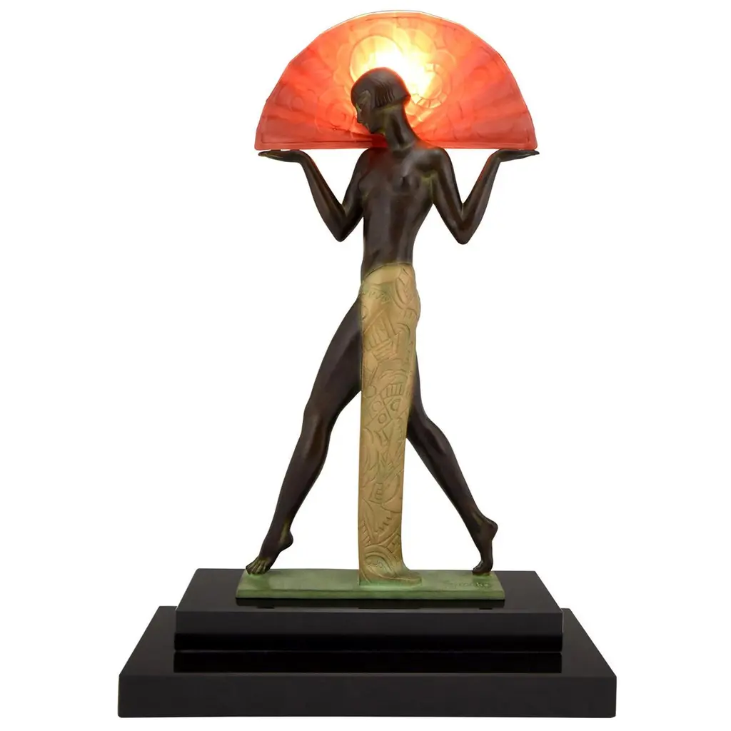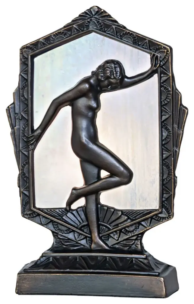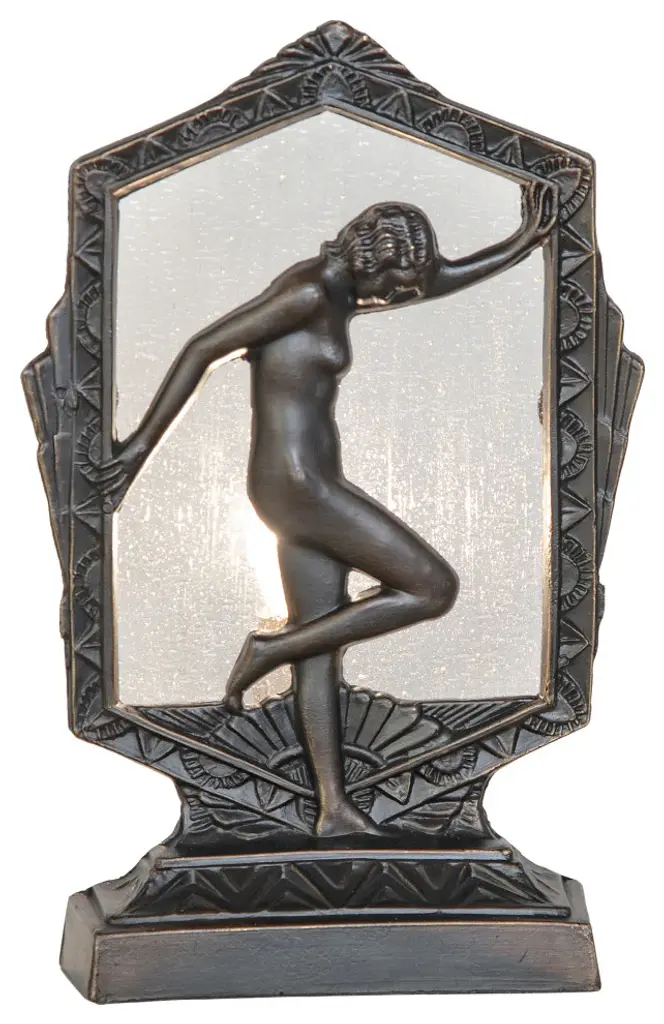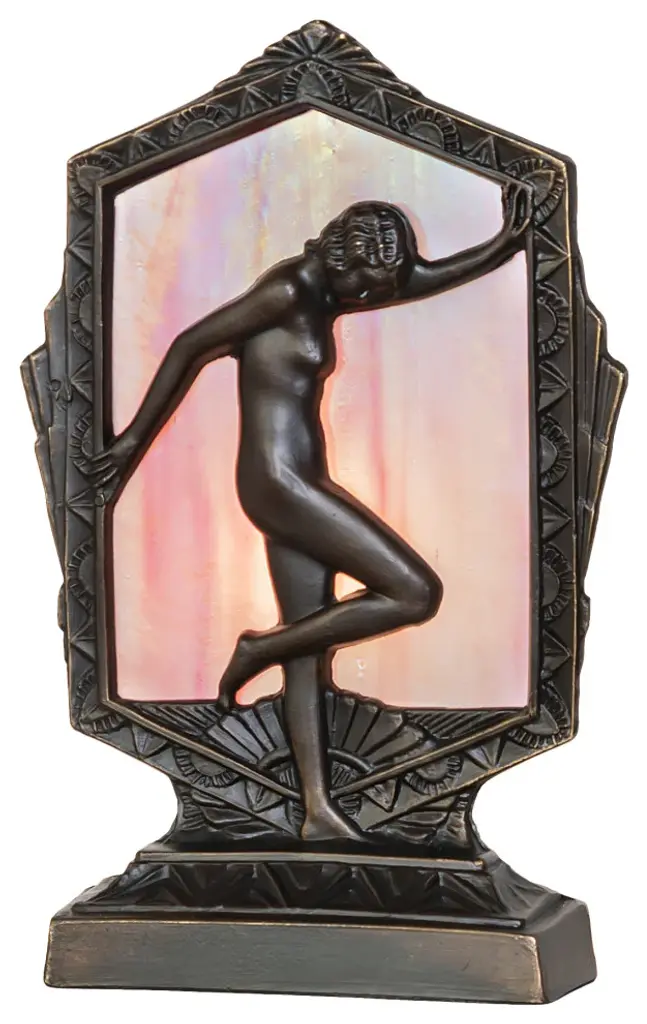A graceful posing lady is highlighted on this Deco-styled accent lamp. The elegant metal statuette is finished in Antique Brass and complemented with a stunning Beige Iridescent Glass lens that is illuminated from the back. The accent lamp is perfect for lighting desktops; tabletops; and other spaces in various residential and hospitality settings; from Newport; Rhode Island; to Raleigh; North Carolina; to Fort Worth; Texas. The Posing Deco Lady Accent Lamp is included in our American-designed; handcrafted Art Deco Collection. UL and cUL listed for dry locations.