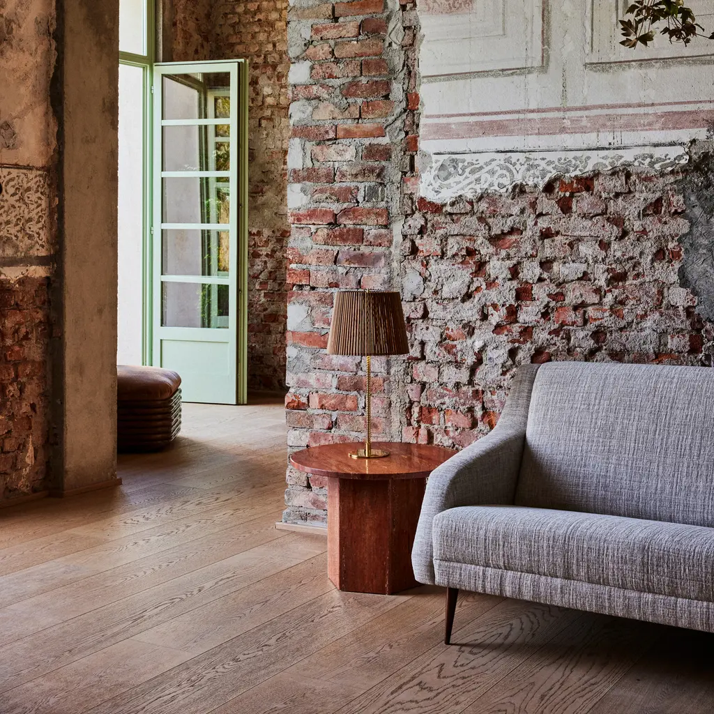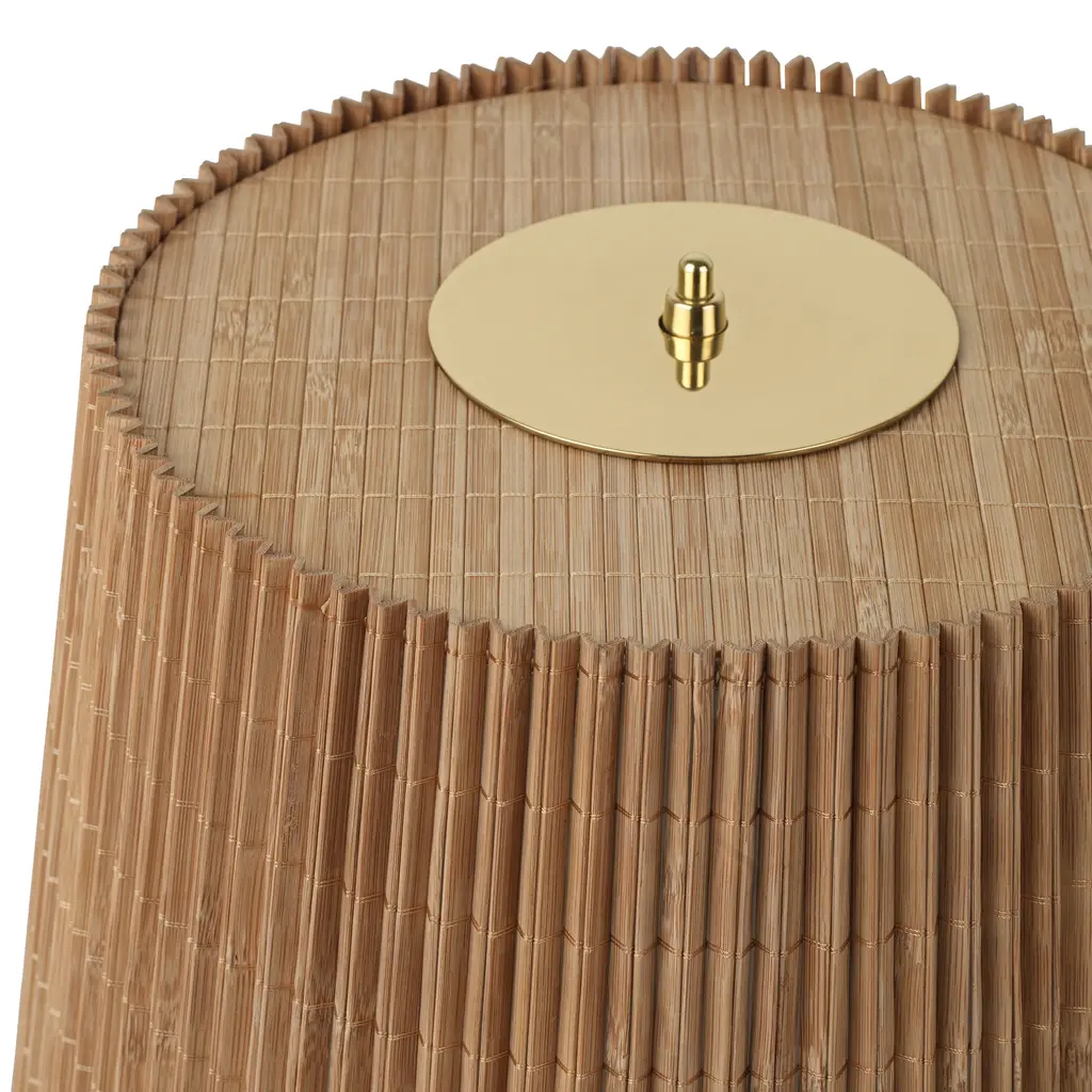 Originally crafted circa 1950, Paavo Tynell’s sleekly elegant table lamp’s aura of simplicity belies a masterful display of craftsmanship as downward light lends a warm, 360-degree glow. Offered with either a smooth canvas or ridged bamboo shade, the brass stem is milled with a rattan-like pattern, created by a metalsmith using a lathe with great precision to mimic the effect of a series of overlapping strips, as it sits on the polished disc base