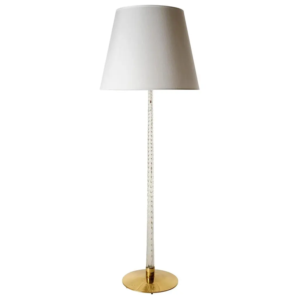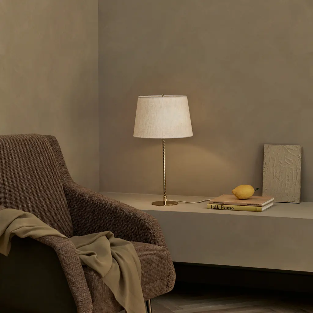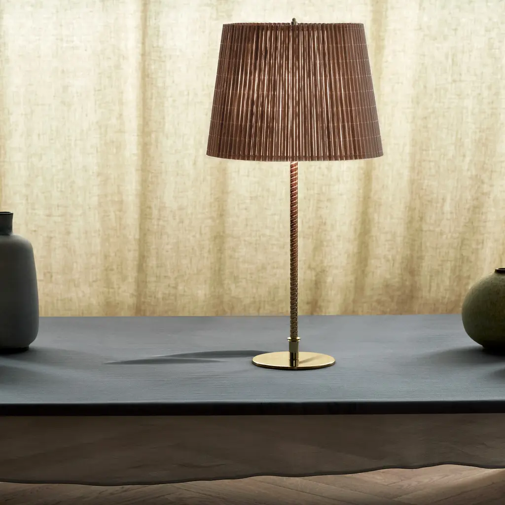 Originally crafted circa 1950, Paavo Tynell’s sleekly elegant table lamp’s aura of simplicity belies a masterful display of craftsmanship as downward light lends a warm, 360-degree glow. Offered with either a smooth canvas or ridged bamboo shade, the brass stem is milled with a rattan-like pattern, created by a metalsmith using a lathe with great precision to mimic the effect of a series of overlapping strips, as it sits on the polished disc base