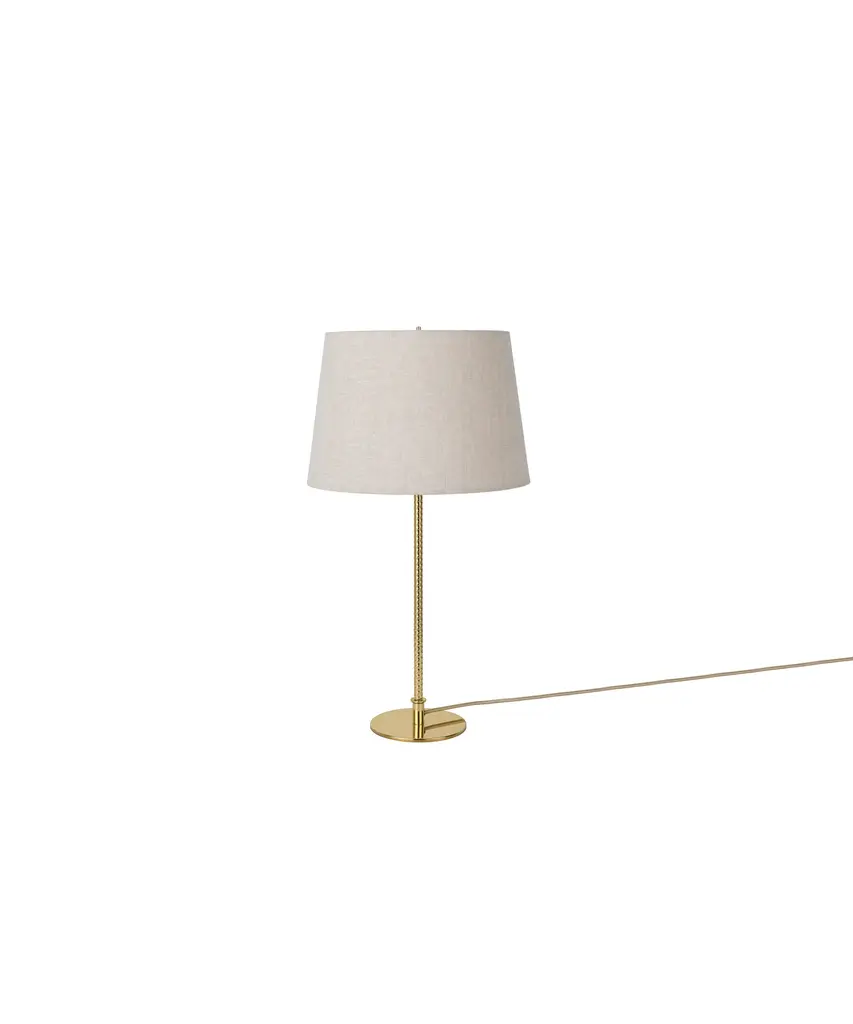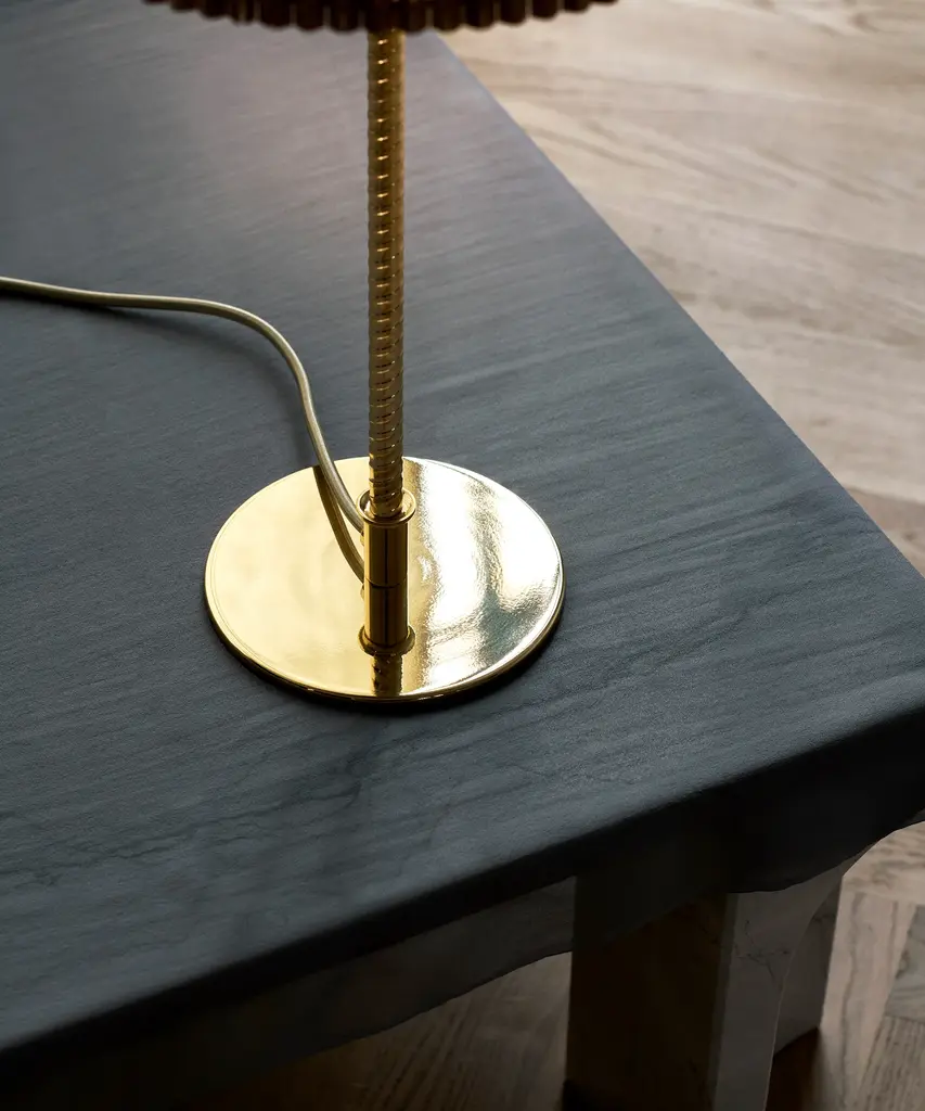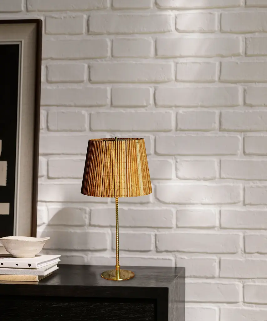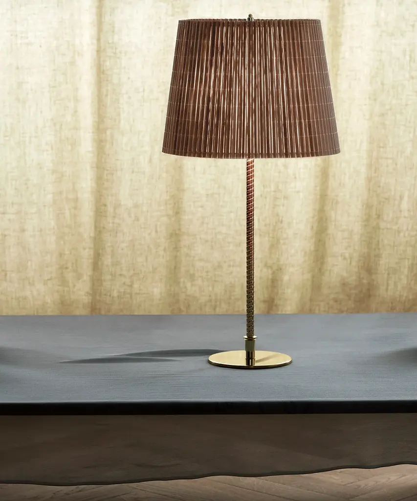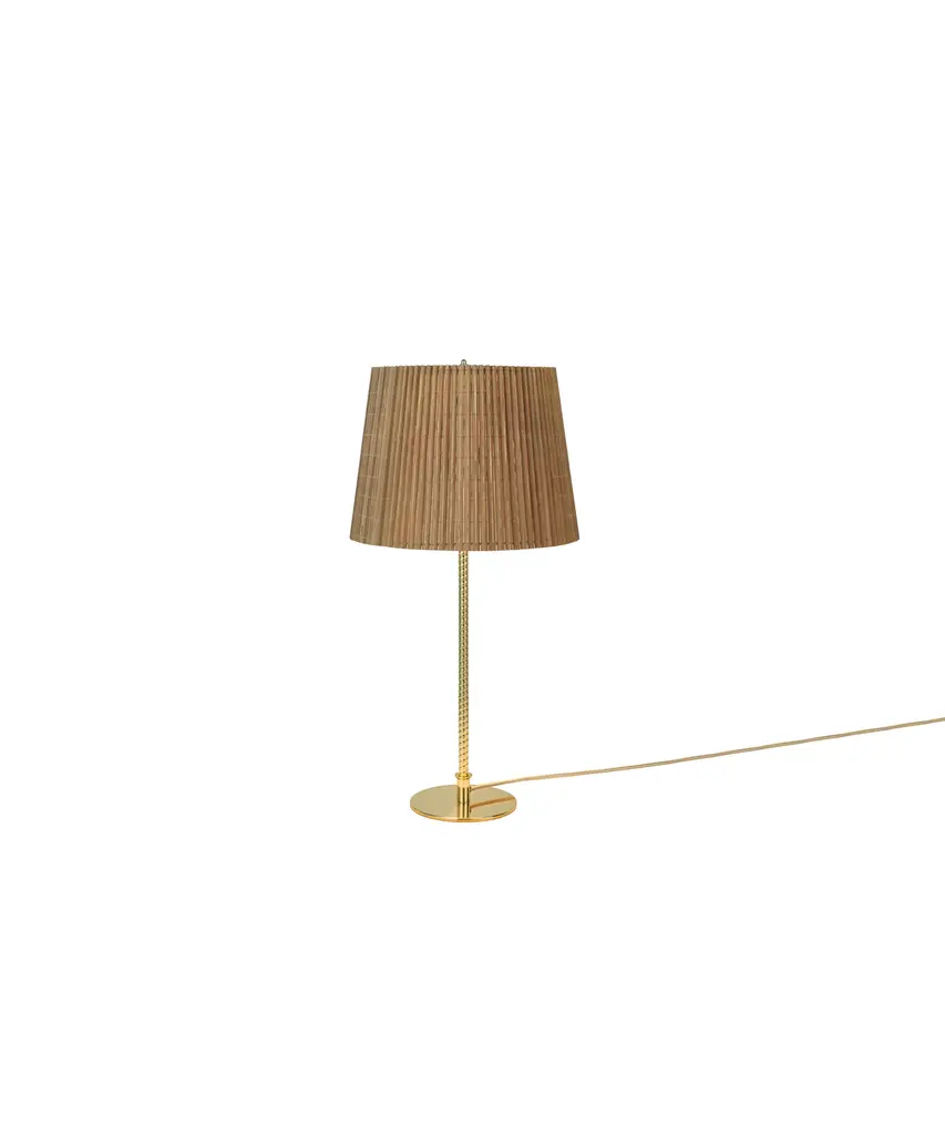 First produced around 1950, the 9205 is a classic, almost archetypal, table lamp with an unmistakable Tynell aesthetic. Elegant and slender, the lamp’s apparently simple form conceals an extraordinary degree of craftsmanship and highly skilled hand-making. The canvas model's shade is constructed by attaching the fabric to a liner, which is then manually fixed onto a wire frame, while the bamboo is made from a series of slats first sewn together by hand to form a pleated mat before being connected to the liner and frame – a contemporary update to the ryegrass cane used in Taito’s original model. The stem is milled with a rattan-like pattern, created by a metalsmith using a lathe with great precision and attention to detail to mimic the effect of a series of overlapping strips. A brass plate, screwed into the stem, keeps the shade in place.Produced by Danish design publisher, Gubi.