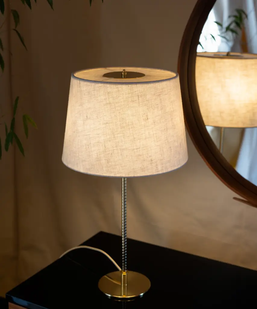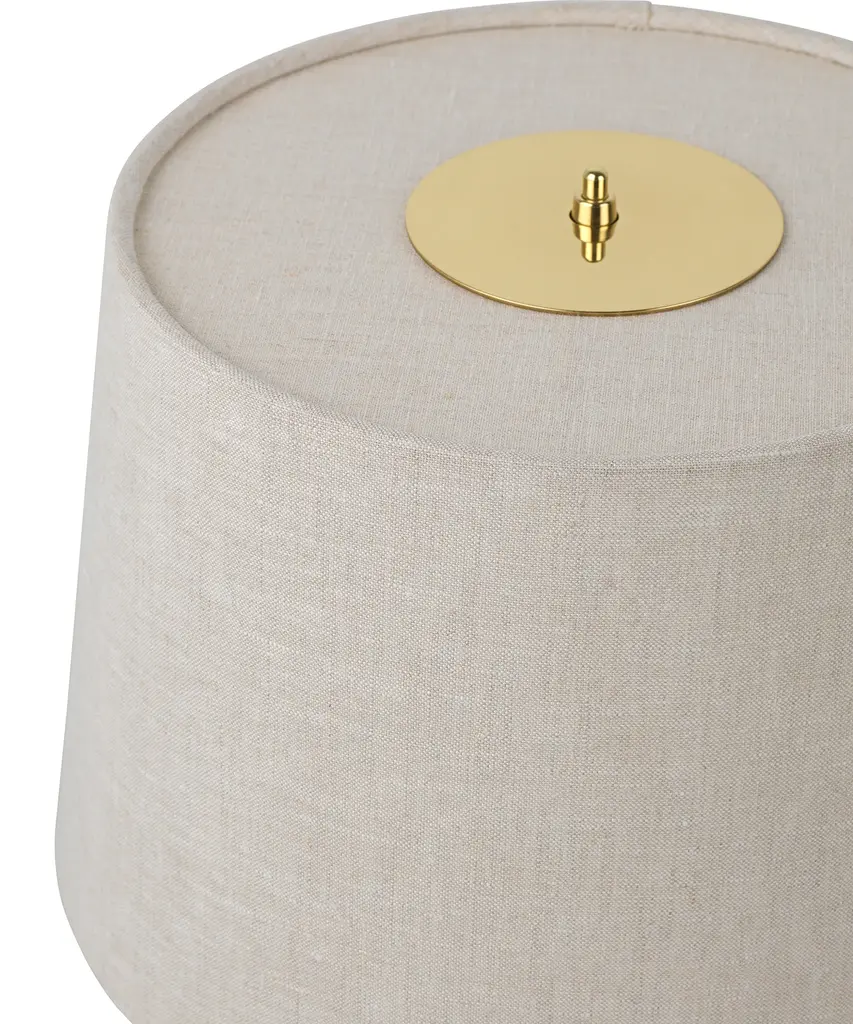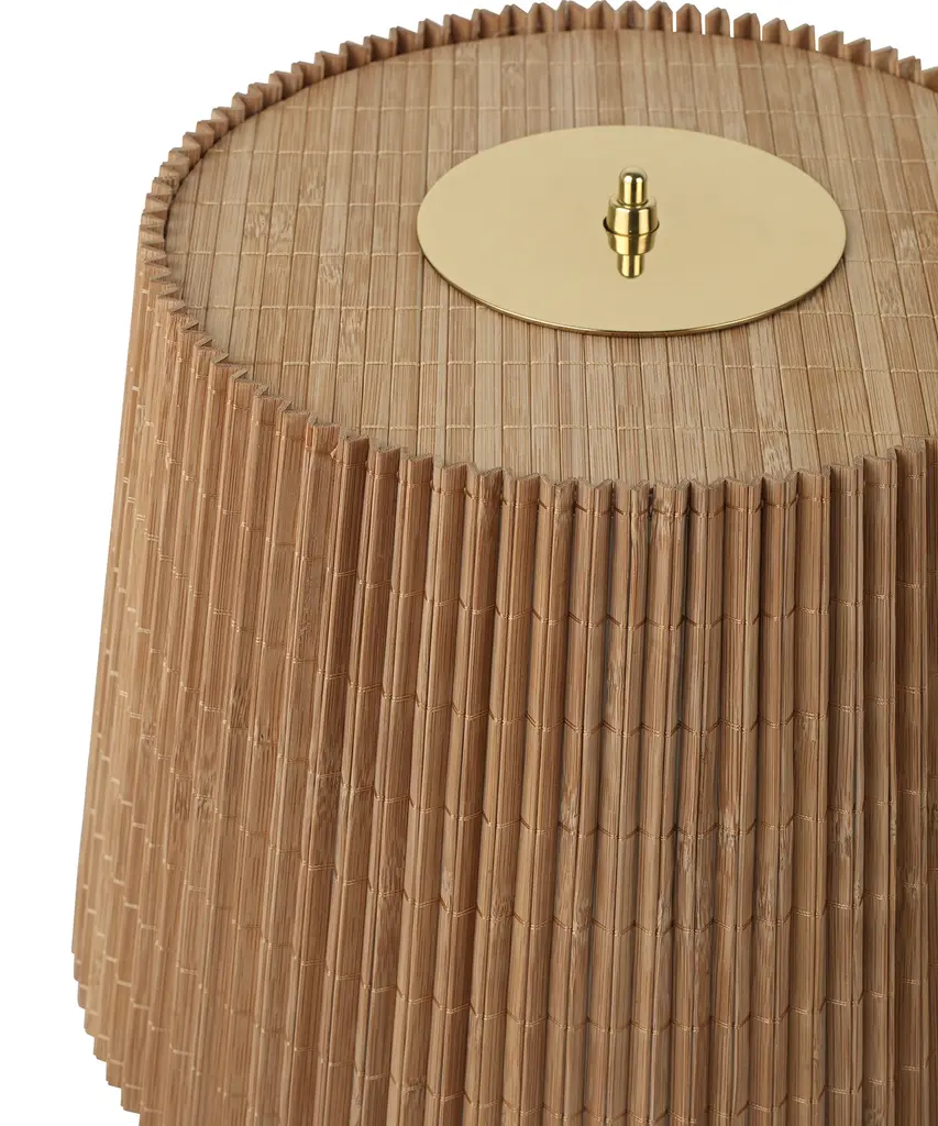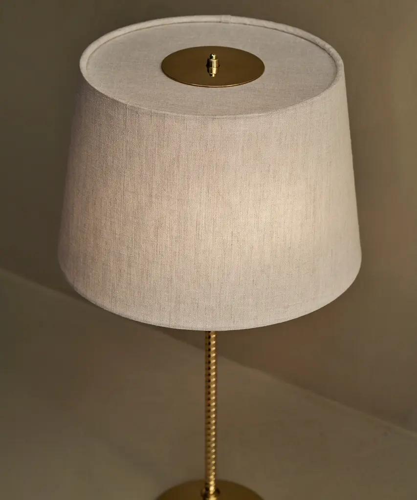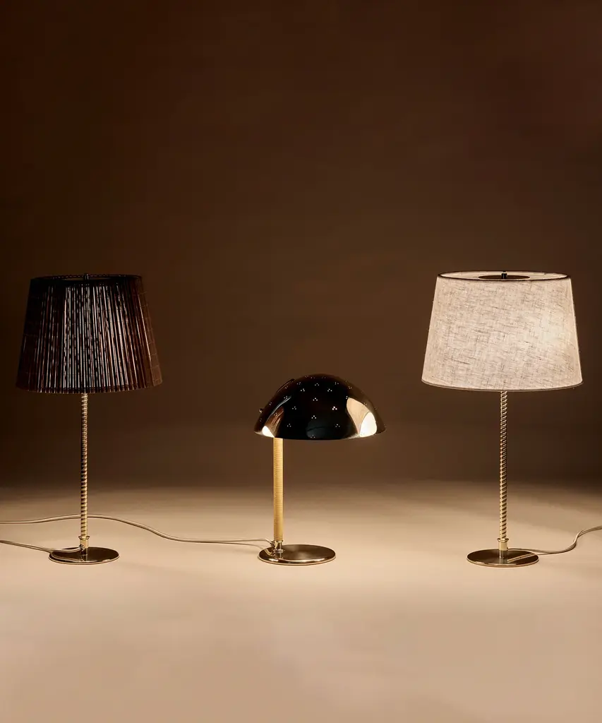 First produced around 1950, the 9205 is a classic, almost archetypal, table lamp with an unmistakable Tynell aesthetic. Elegant and slender, the lamp’s apparently simple form conceals an extraordinary degree of craftsmanship and highly skilled hand-making. The canvas model's shade is constructed by attaching the fabric to a liner, which is then manually fixed onto a wire frame, while the bamboo is made from a series of slats first sewn together by hand to form a pleated mat before being connected to the liner and frame – a contemporary update to the ryegrass cane used in Taito’s original model. The stem is milled with a rattan-like pattern, created by a metalsmith using a lathe with great precision and attention to detail to mimic the effect of a series of overlapping strips. A brass plate, screwed into the stem, keeps the shade in place.Produced by Danish design publisher, Gubi.