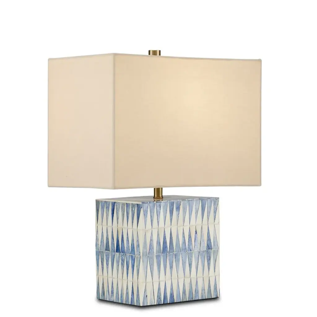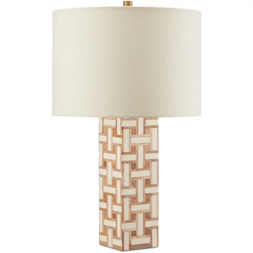 The Aarna Cream Table Lamp, with its basketweave pattern, is made of pieces of wood interspersed with strips of ivory composite. The contrast of the textural woodgrains and the sleek composite creates an interesting aspect to this design, as do the angular lines of the rectangular body that echo the scale of the elongated pieces on its surface. The drum shade contributes to the feeling of complexity that is obvious with this design.