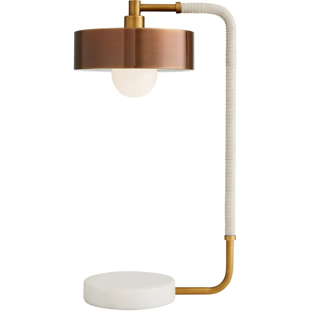 This contemporary lamp possesses modern sensibility defined by a sleek style and masterly materials. An antique brass steel frame wrapped in cream-colored leather seamlessly blends into a circular white marble base—a beautiful balance between natural and refined elements. The taupe cloth cord features a dimmable switch to create an ambiance that suits you. A heritage brass metal drum shade tops this modish luminescent. Marble will vary.