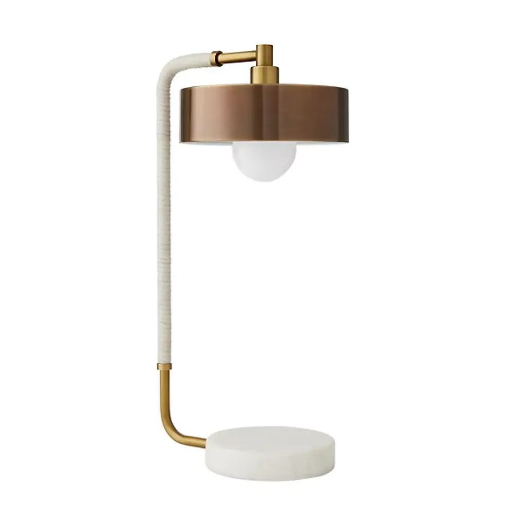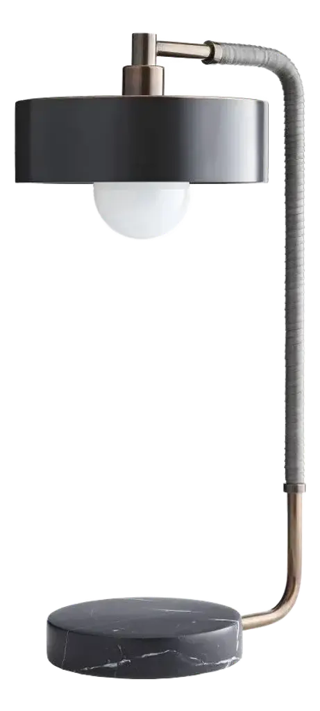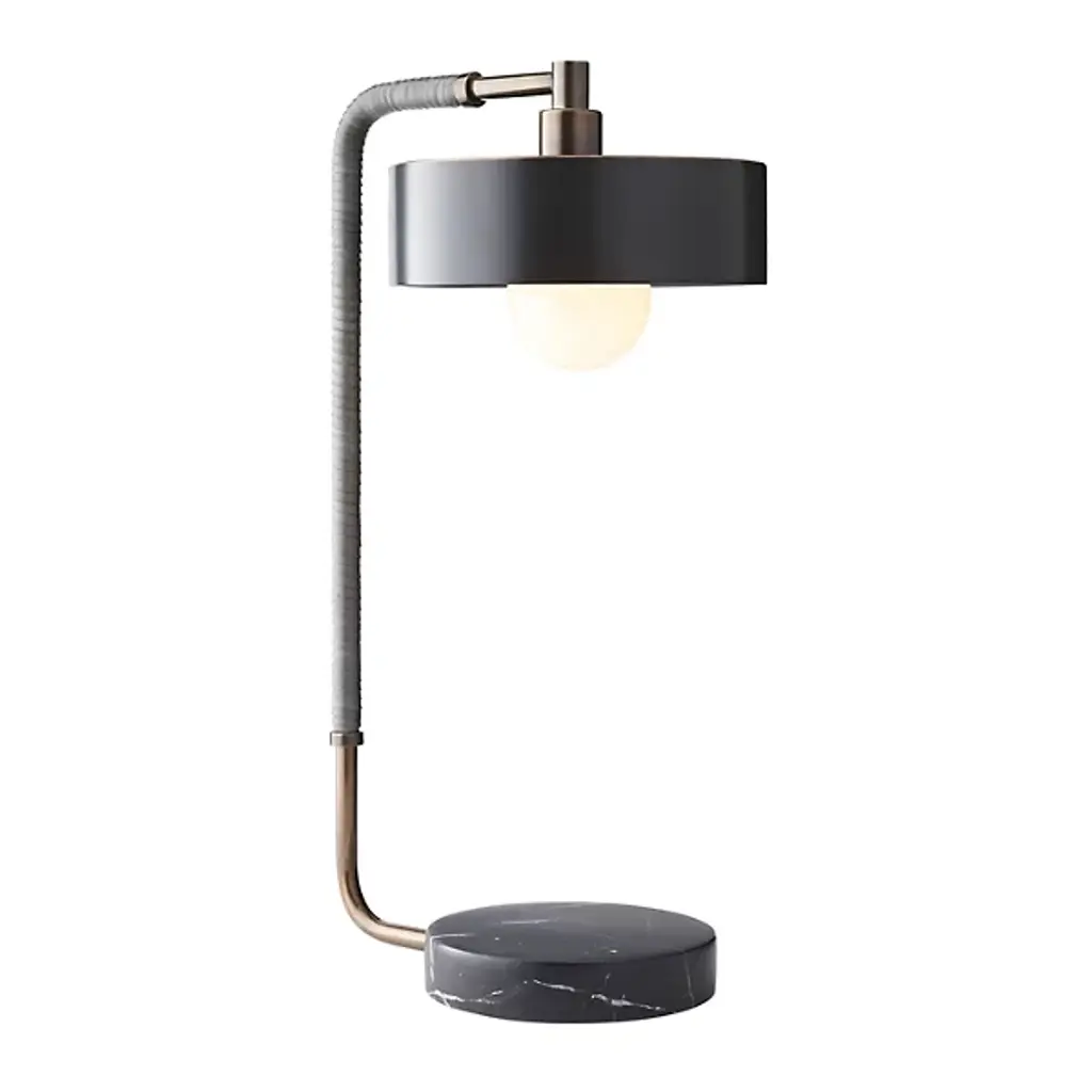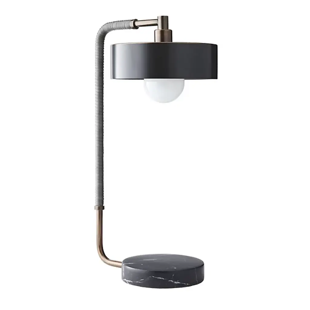 Adorn your space with a soothing, symmetrical silhouette. The Aaron Table Lamp from Arteriors elevates your favorite space with a refined touch, a delicate balance between contrasting materials. The base and metal drum shade positioned in line with each other seamlessly match as the smooth arm wrapped in gray leather connects them. A single bulb rests under the drum shade, spreading a warm, ample glow ideal for lighting evening tasks.