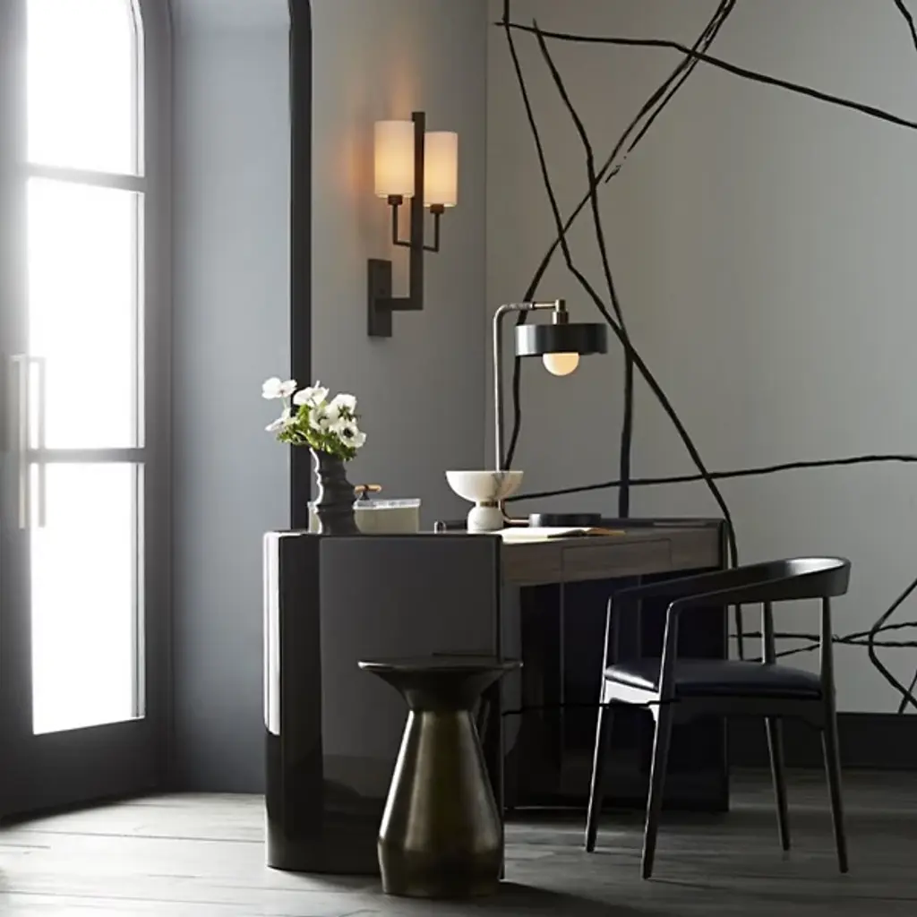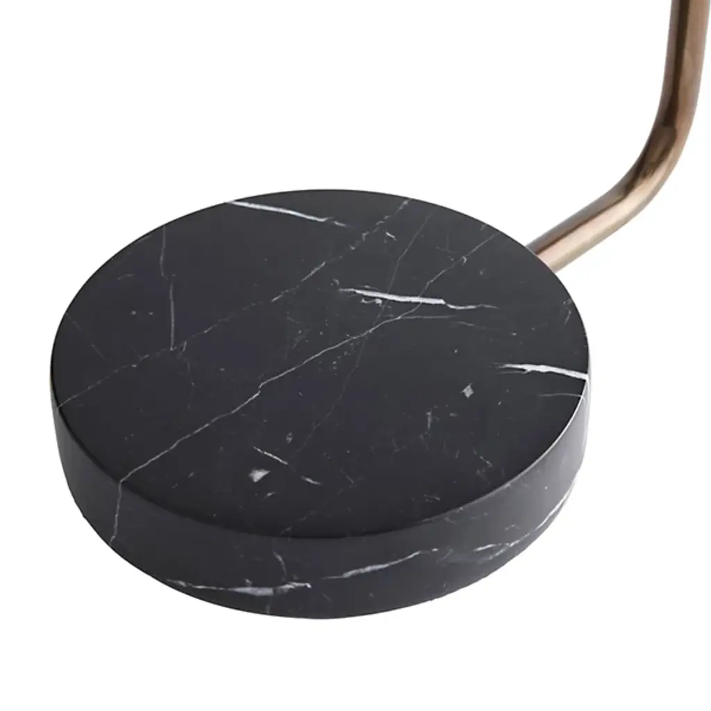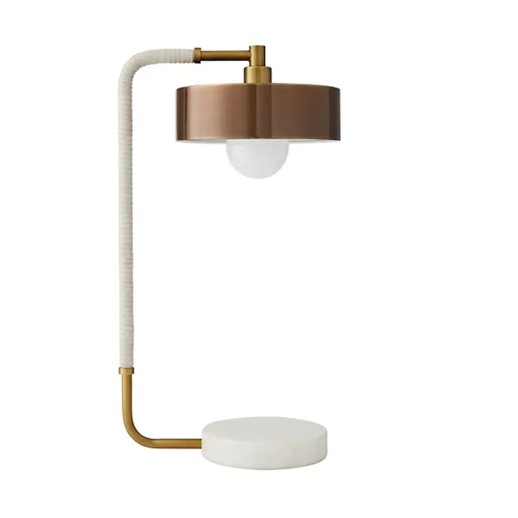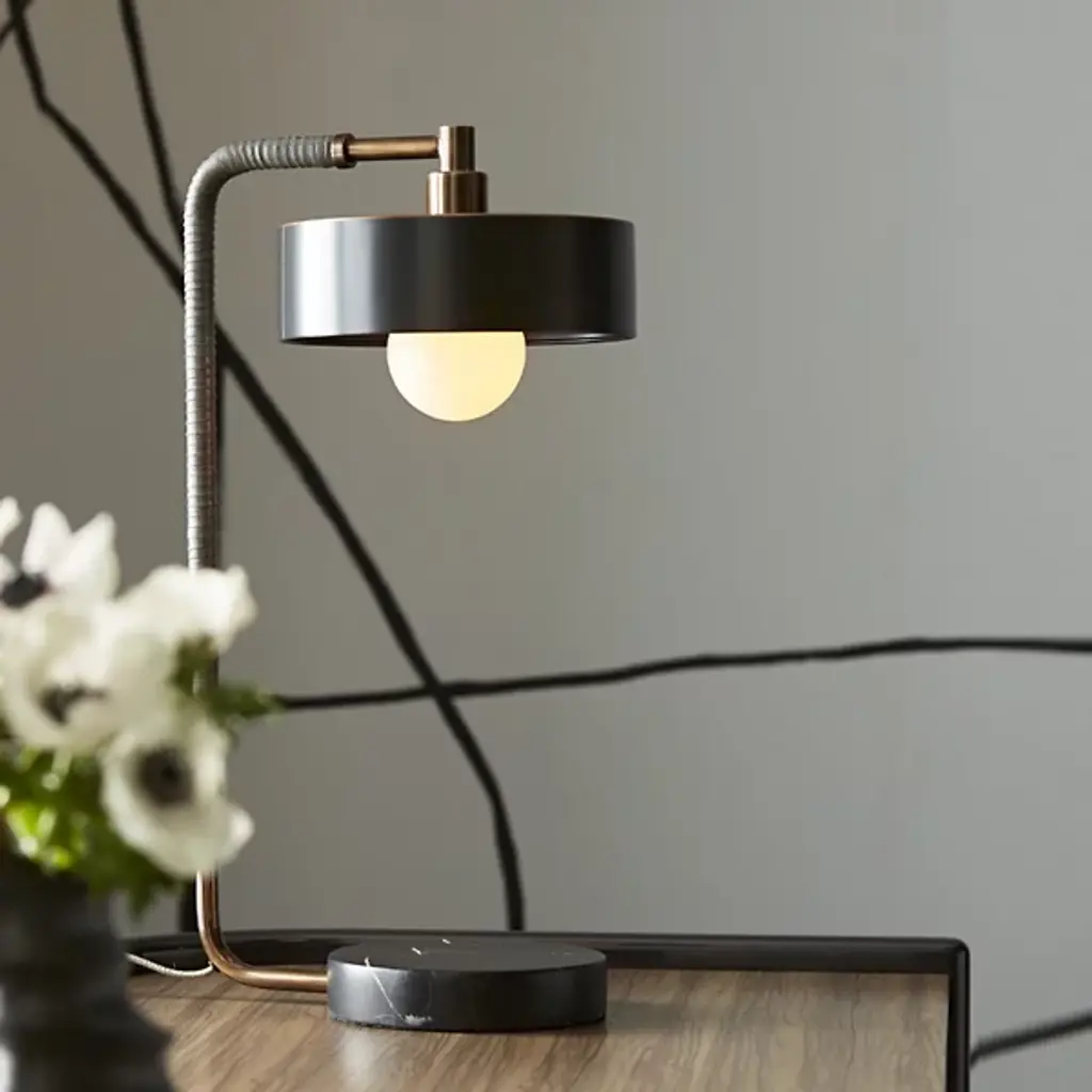 Adorn your space with a soothing, symmetrical silhouette. The Aaron Table Lamp from Arteriors elevates your favorite space with a refined touch, a delicate balance between contrasting materials. The base and metal drum shade positioned in line with each other seamlessly match as the smooth arm wrapped in gray leather connects them. A single bulb rests under the drum shade, spreading a warm, ample glow ideal for lighting evening tasks.