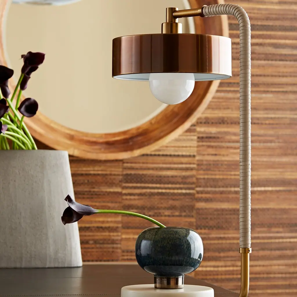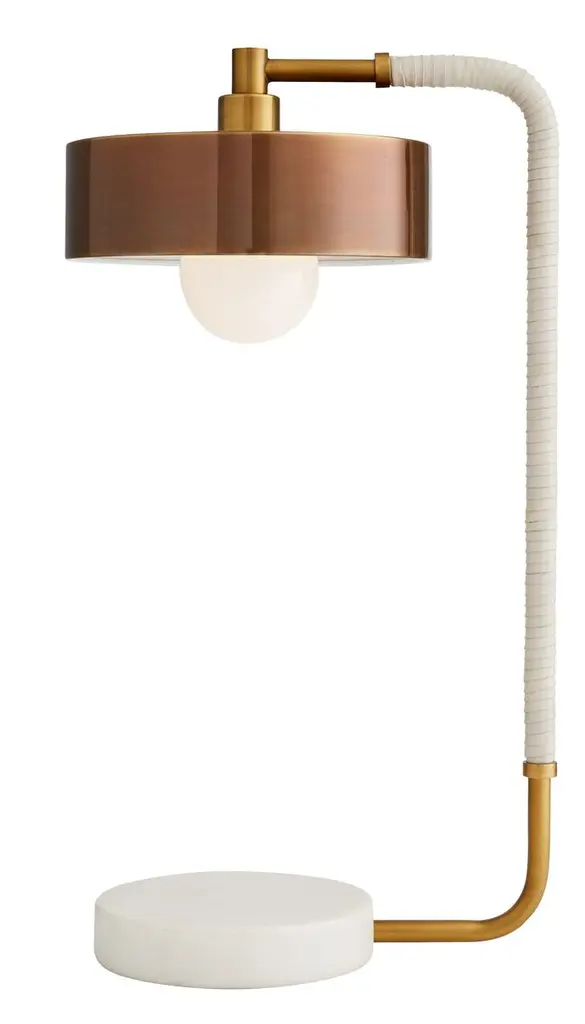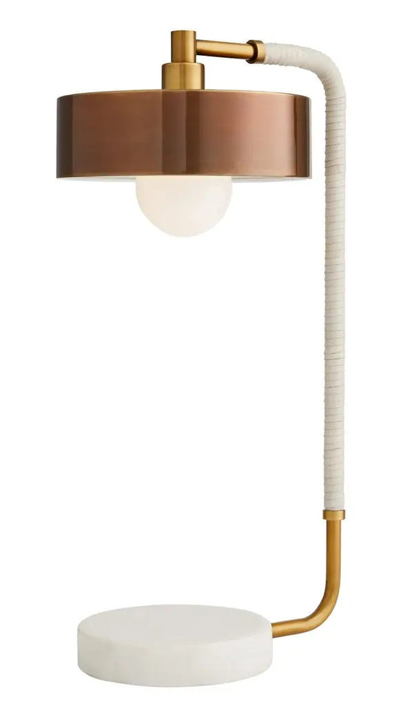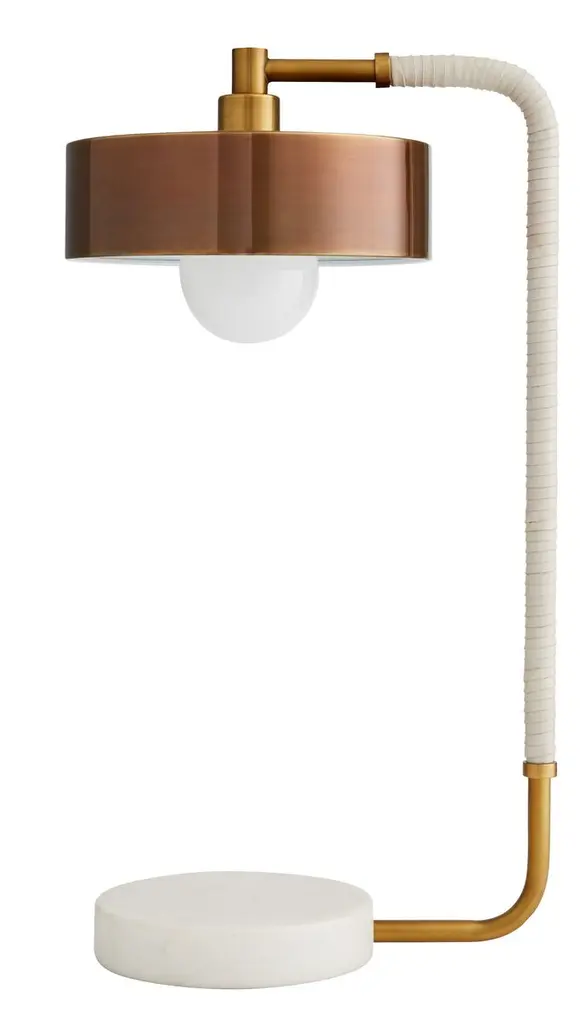 Cream-color leather wrapped around most of the stem complements this table lamp's white marble base. The brass finish of the shade and the unwrapped segments of the stem add to the sense of luxury.