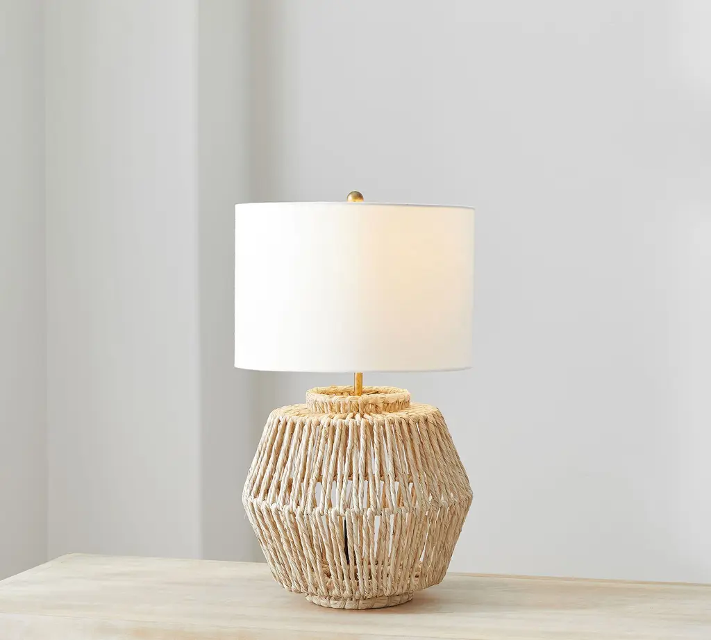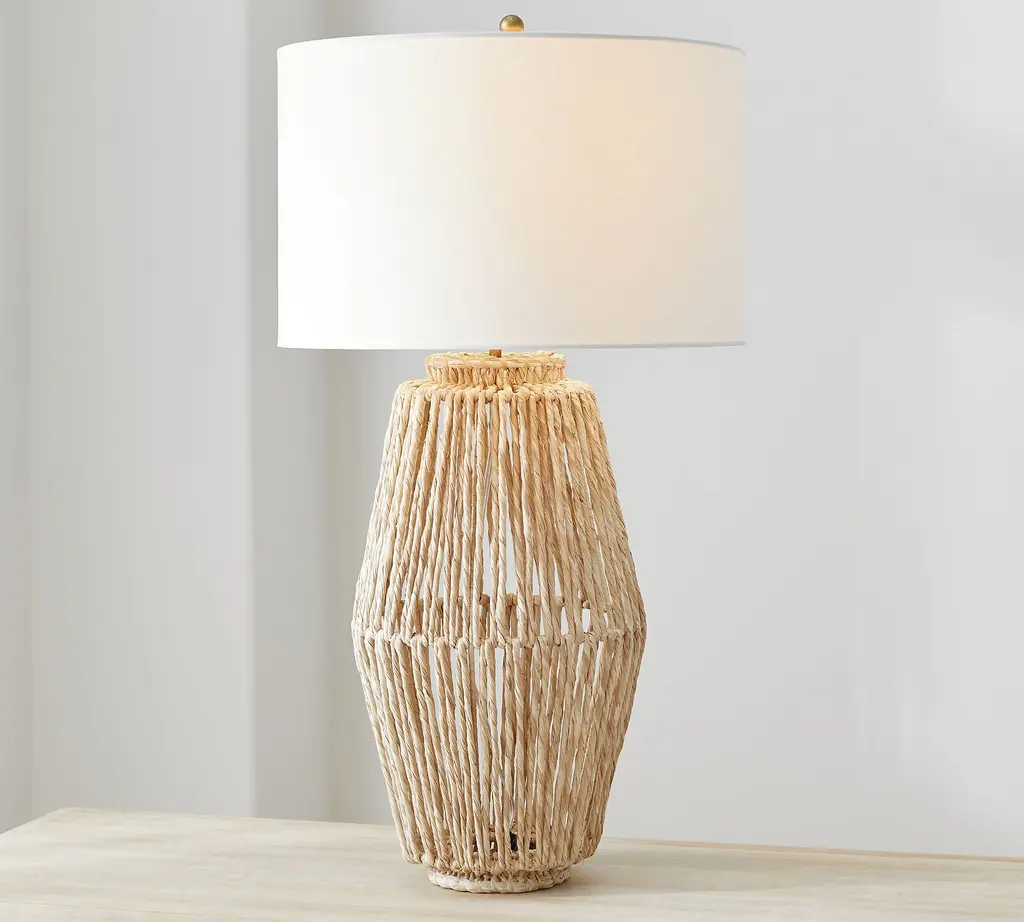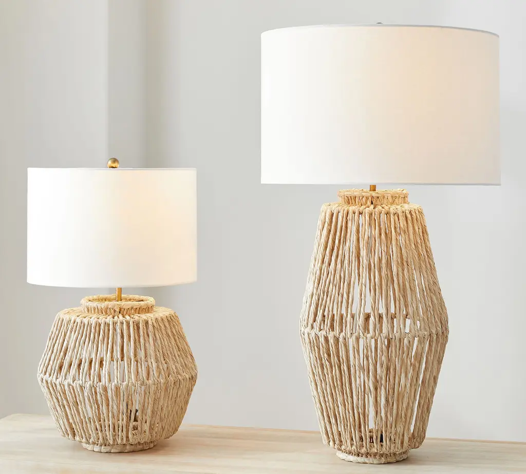 In this series of fixtures, the natural warmth of abaca rope meets the airy look of a generously open weave. These versatile pieces can shine, whether clustered above the dining table, standing alone in a reading nook, or relaxing the look of any desktop. Woven and hand-twisted by basket-makers in the Philippines, the organic material and handwork make each light unique. "