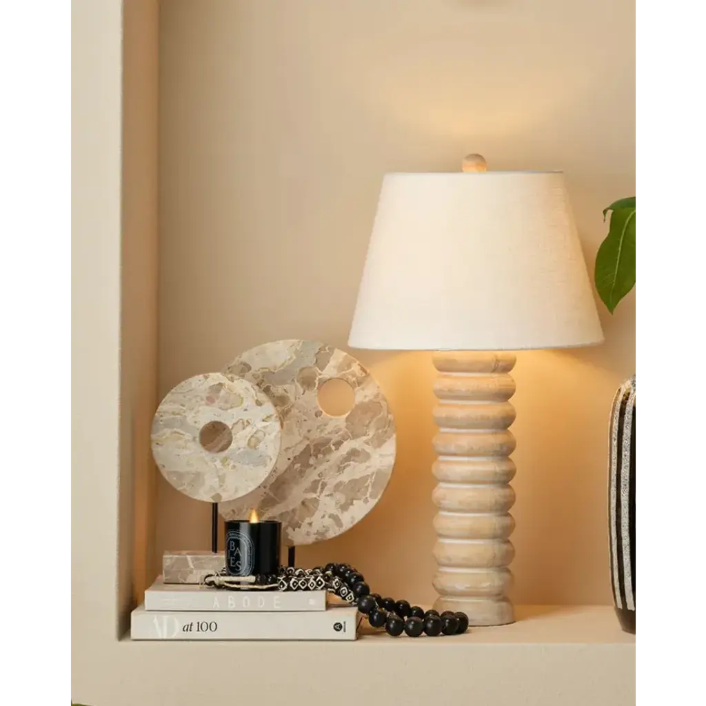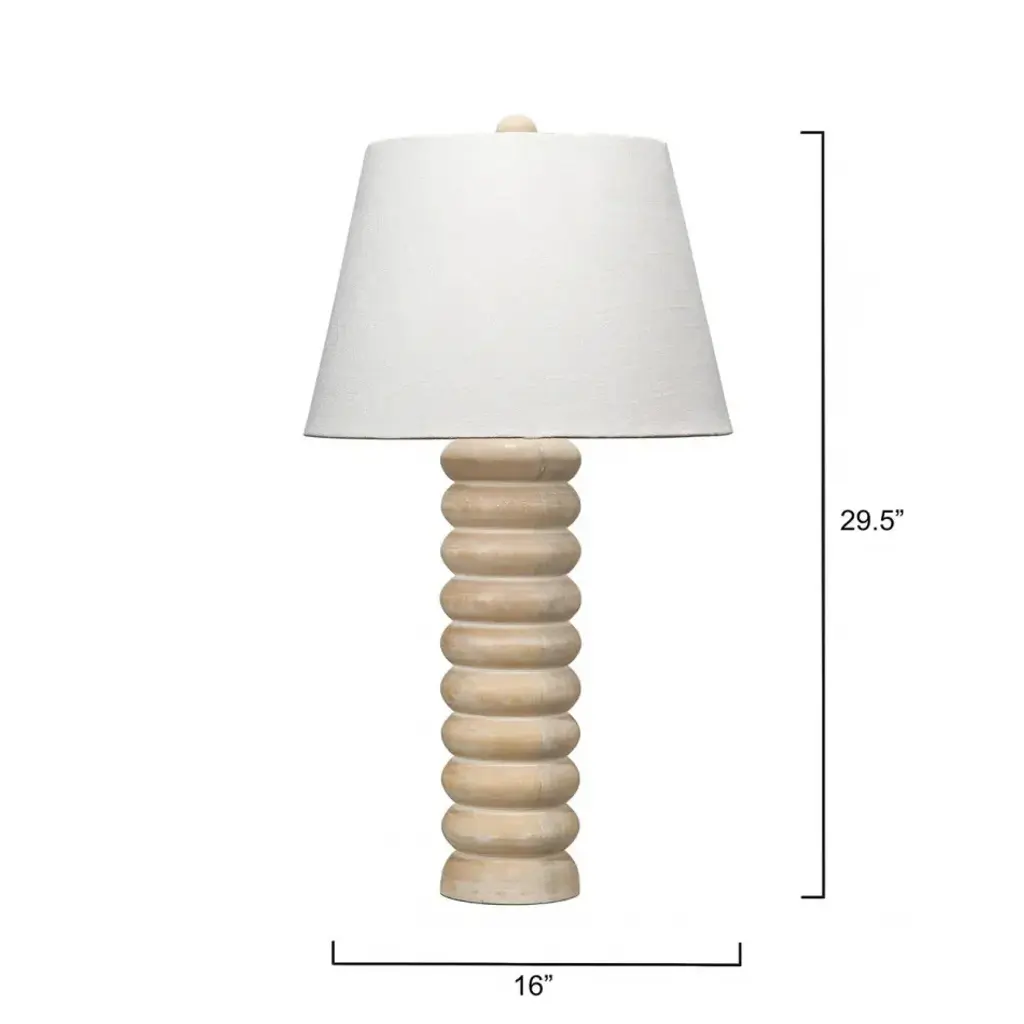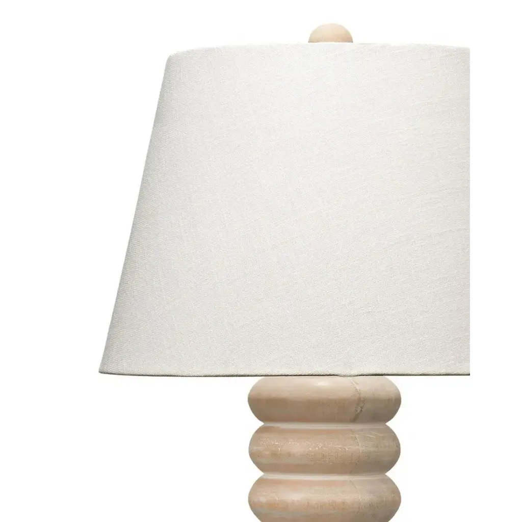 Masterfully carved of mango wood, this attractive, uncomplicated table lamp was inspired by the beads on ancient counting devices. The finish on the wood base is slightly textured and semi sheer, revealing the beauty of the sustainable hardwood beneath. Each is topped with a tapered shade in creamy linen and a coordinating wood finial.
