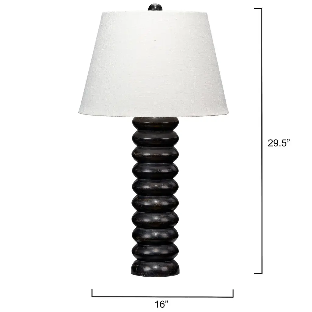 Masterfully carved of mango wood, this attractive, uncomplicated table lamp was inspired by the beads on ancient counting devices. The finish on the wood base is slightly textured and semi sheer, revealing the beauty of the sustainable hardwood beneath. Each is topped with a tapered shade in creamy linen and a coordinating wood finial.