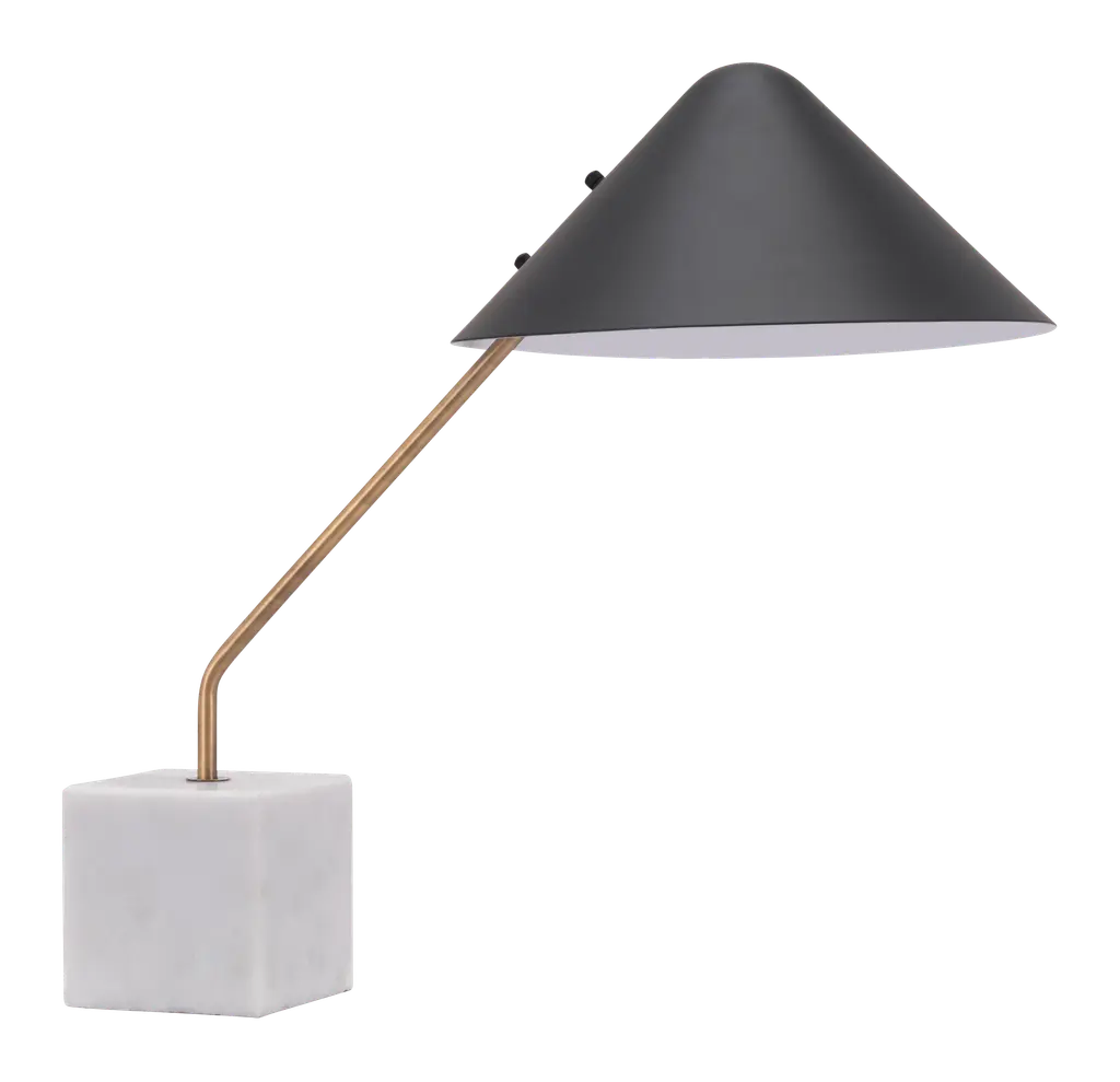 Divergent design forms make the modern shape of this decorative table lamp a true stand out. Two iron arms support a cylindrical metal lampshade thats seemingly suspended in mid-air above a block of black marble that serves as the cubic lamp base. A gunmetal gray finish gives the glamorous light fixture metallic luster thats undeniably elegant.