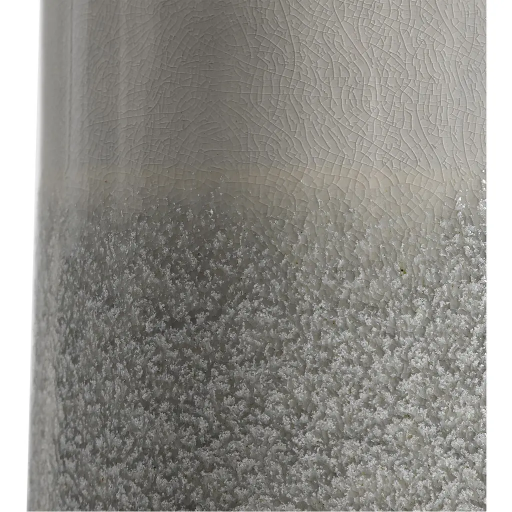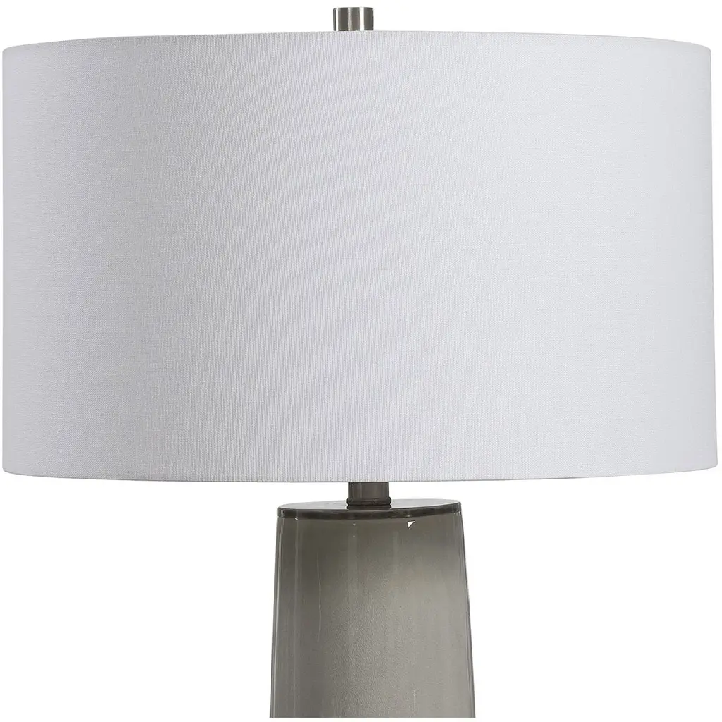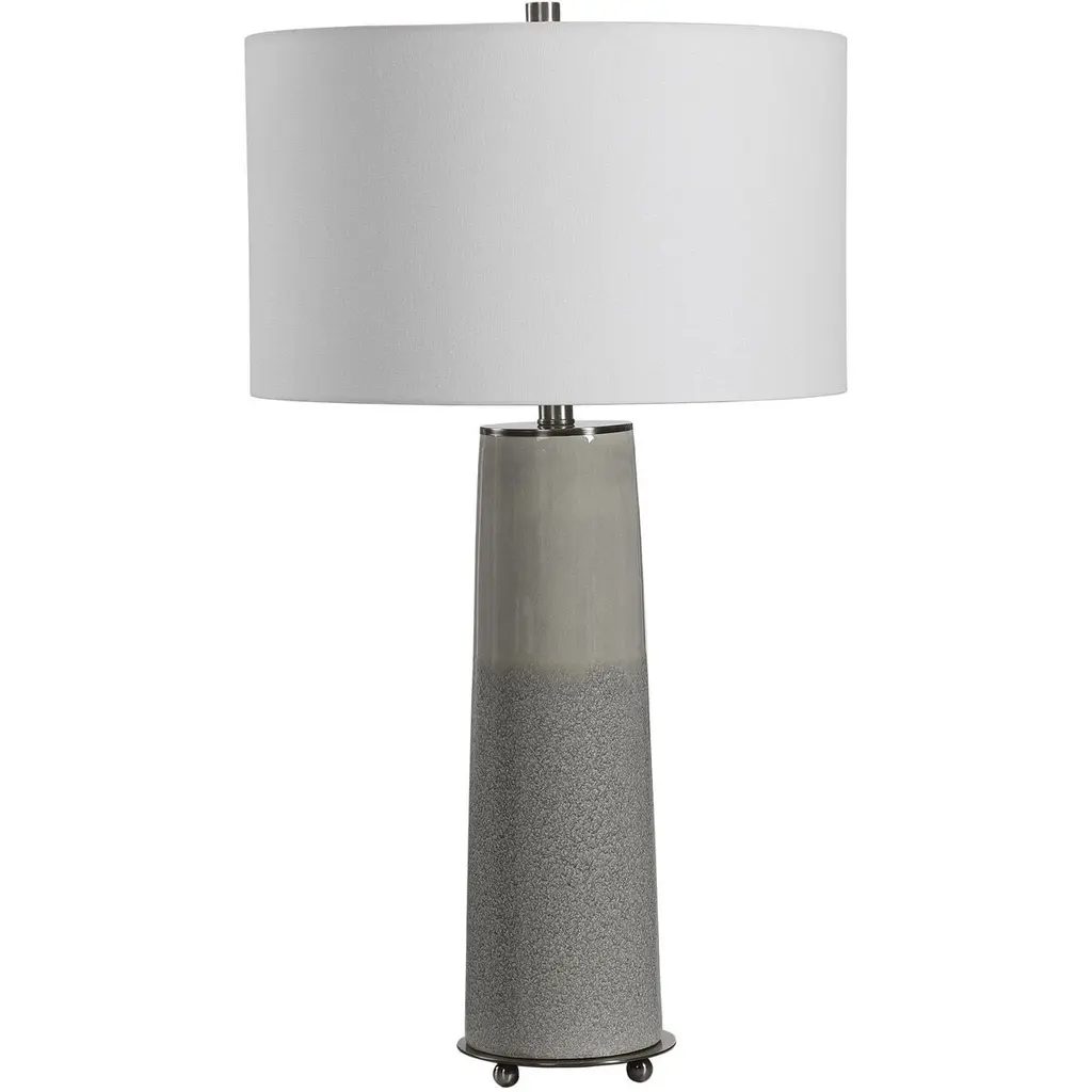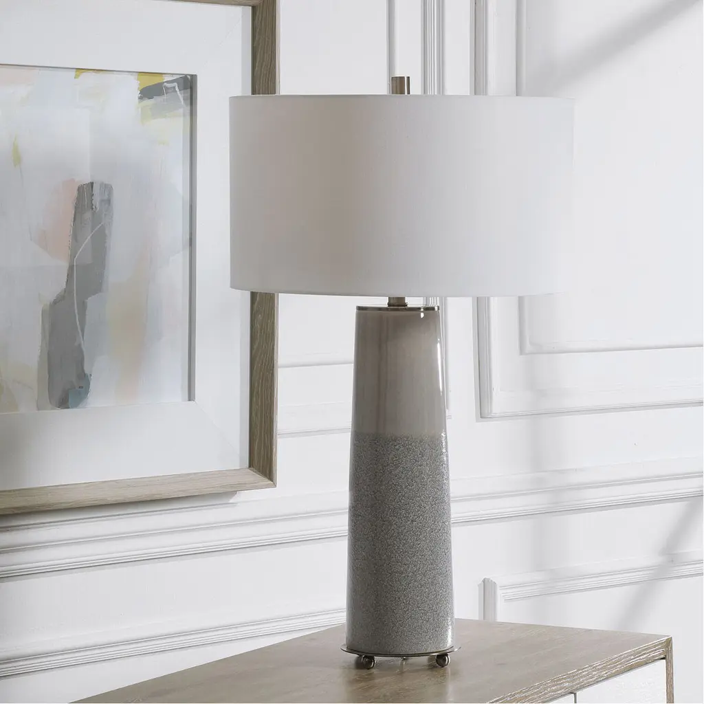 Sleek And Contemporary, This Ceramic Table Lamp Showcases A Two Tone Light Gray Glaze With A Gloss Sheen Top Half And A Textured Bottom Half, Complimented By Gunmetal Plated Accents. An Off-white Fabric Drum Shade Completes The Piece.