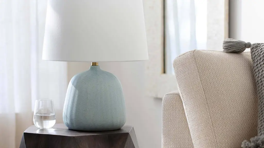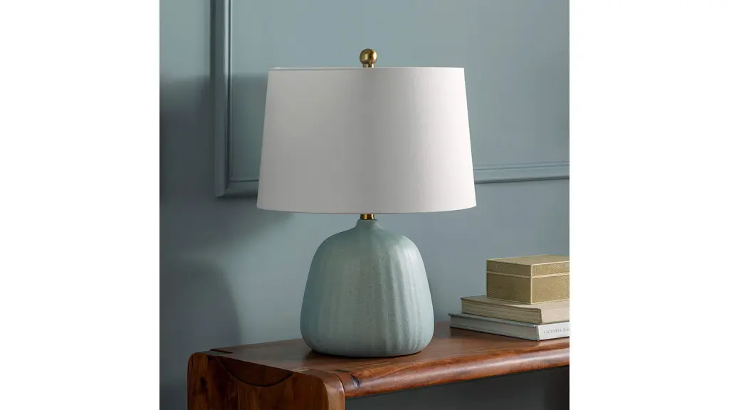 The Abelone Table Lamp features a soft blue hue that evokes the tranquil beauty of the ocean, bringing a sense of calmness and relaxation to any room. With its subtle texture and soothing color, the Abelone Table Lamp seamlessly blends into both classic and contemporary spaces. Features - Painted ceramic base with white linen shade - 6 ft. cord - On-off switch - Use with E-26 base bulb up to 100W (not included)