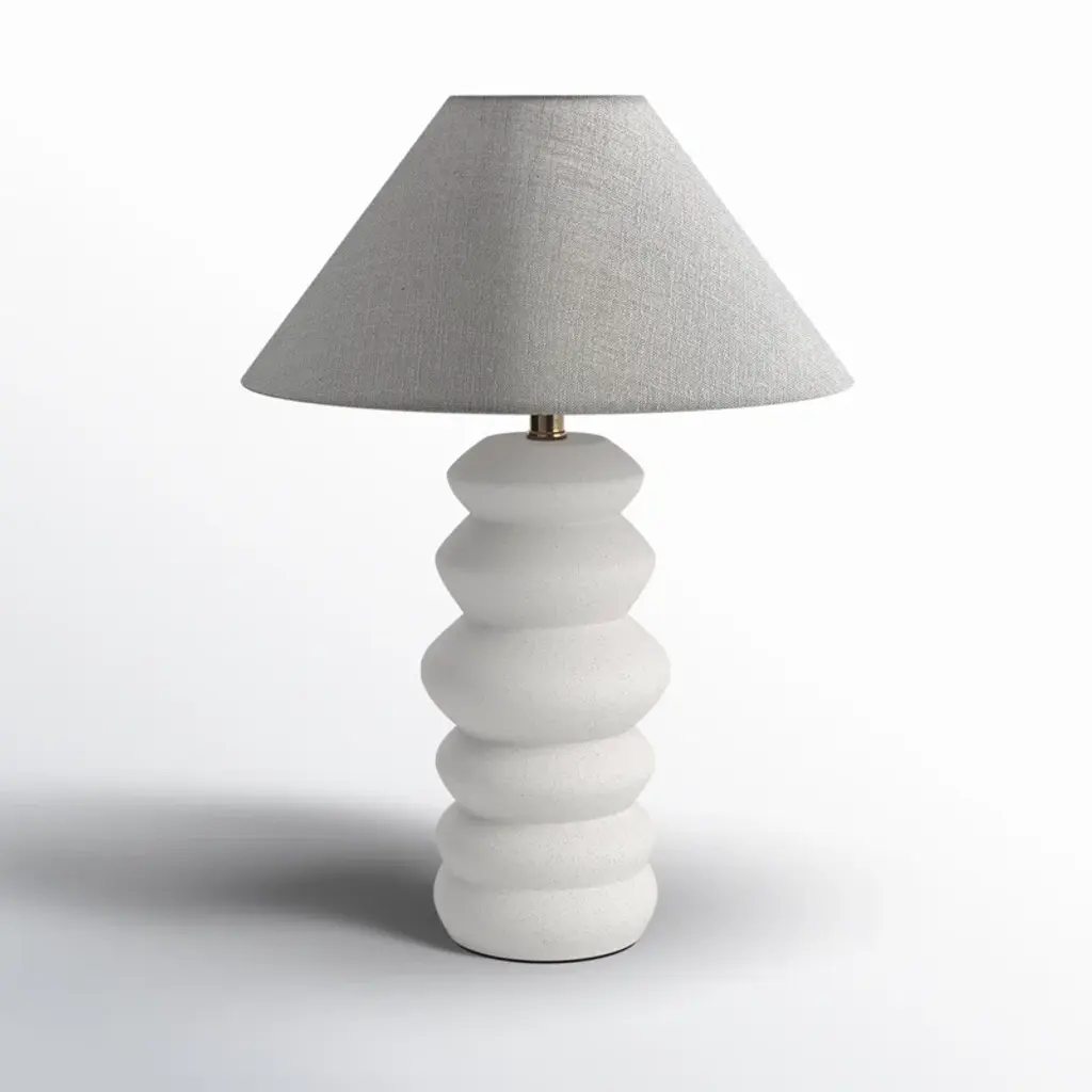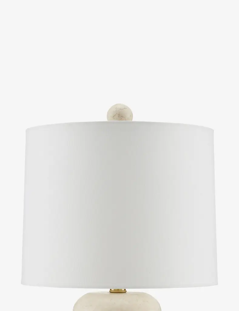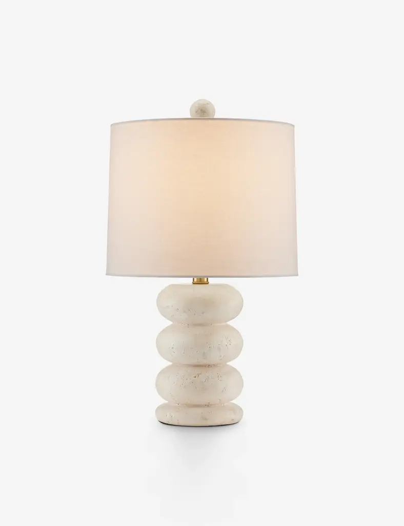 Carved travertine brings a timeless mineral texture to this shapely table lamp. Oval forms define its soft, undulating silhouette, striking a sculptural look that will elevate any tabletop decor. With its bone linen shade and neutral coloring, this stylish lamp is ready to mix into both transitional and modern designs with effortless poise.