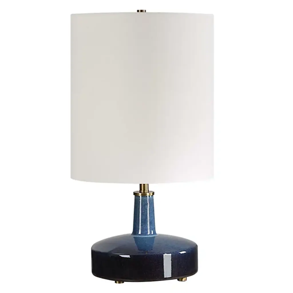 Elevate your decor with the slender, sculptural lines of the Abyss Table Lamp from Uttermost. A Carolyn Kinder design, this striking piece embodies Mid-Century Modern style. The ceramic body of the lamp features a mesmerizing ombre effect that shifts from light blue to deep midnight blue, enhanced by a unique granulated texture. Brass-finished accents add a touch of sophistication, while the tall white linen drum shade creates a clean finish. Each lamp’s glaze is individually fired, ensuring a one-of-a-kind look.