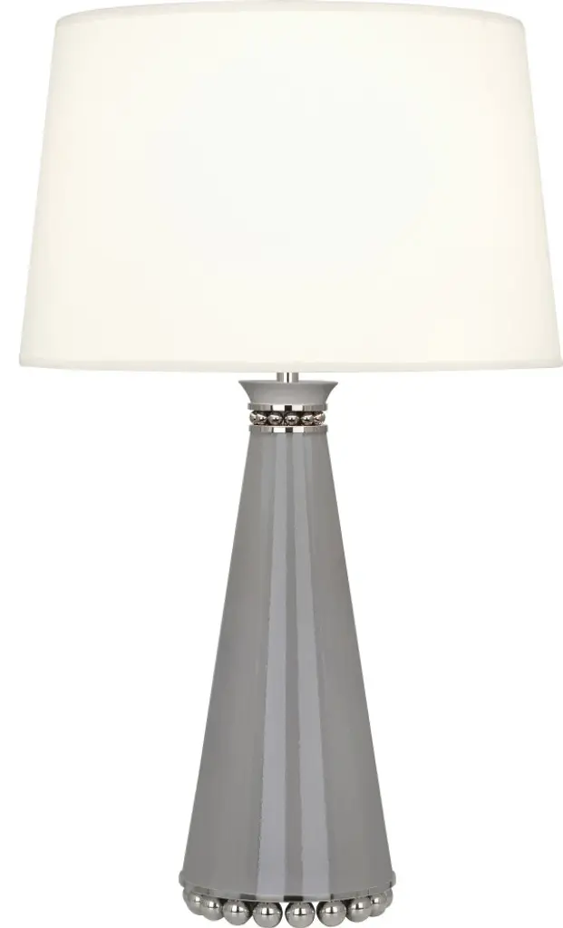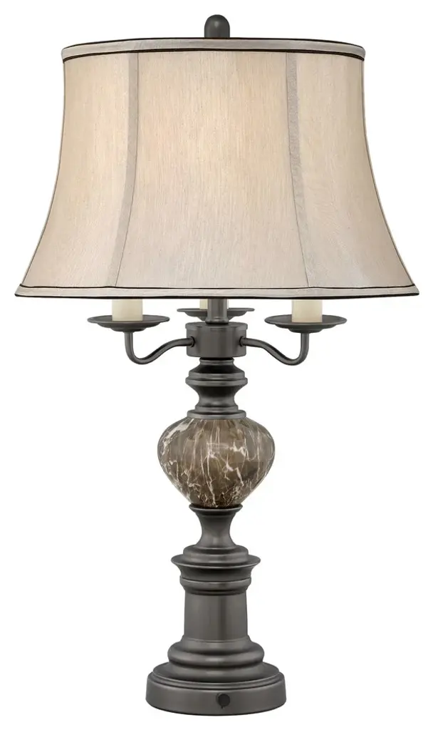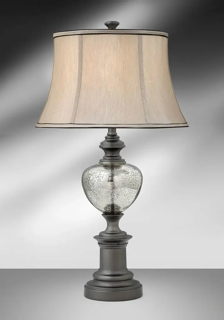 Standard Lamp Specifications for #GMG985:Product Type: Table LampHeight: 30"Finish: Gunmetal and Mercury GlassConstruction: Steel/GlassSocket: (1) Aluminum 3-way Med. Base Type A 150W Max socket(s). (Bulb(s) not included)Switching: (1) 3-way turn knob switch(es) located on the socket.Cord: 6''5'' (from base) long clear silver SPT-2 cord set with a 2 prong polarized plug.UL/CUL and/or ETL listed: YesHarp Size: 8.5 inches (including the saddle)Standard Packing: 2 per carton (shade packed separately).Lamps & Shades per SKU: 1Lamping: (1) Aluminum 3-way Med. Base Type A 150W Max socket(s).Shade Size and Description: Grey Silk Drum bell shade with Black underfold trim measuring 13" x 17" x 11" w/ .5" drop (Top x Bottom x Slant).Bulb Included: NoMaterial Description: constructed from polished, plated, and lacquered hand-spun steel with mercury glass fount.