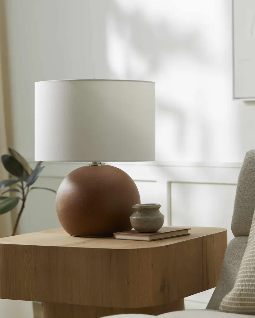 Collection: Acquaviva Colors: White, Metallic - Nickel, Translucent, Brown Material: Body: Ceramic / Base: Ceramic / Shade (Outside): Linen / Finial: Iron Styles: Transitional,Bohemian Made In: China Lighting Type: Accent Table Lighting Base: Ceramic Base Color: Brown Shade Material: Linen Shade Color: White Cord Length: 6' Switch Type: On/Off Number of Bulbs: 1 Socket Type: E-26 Bulb Wattage: 100W