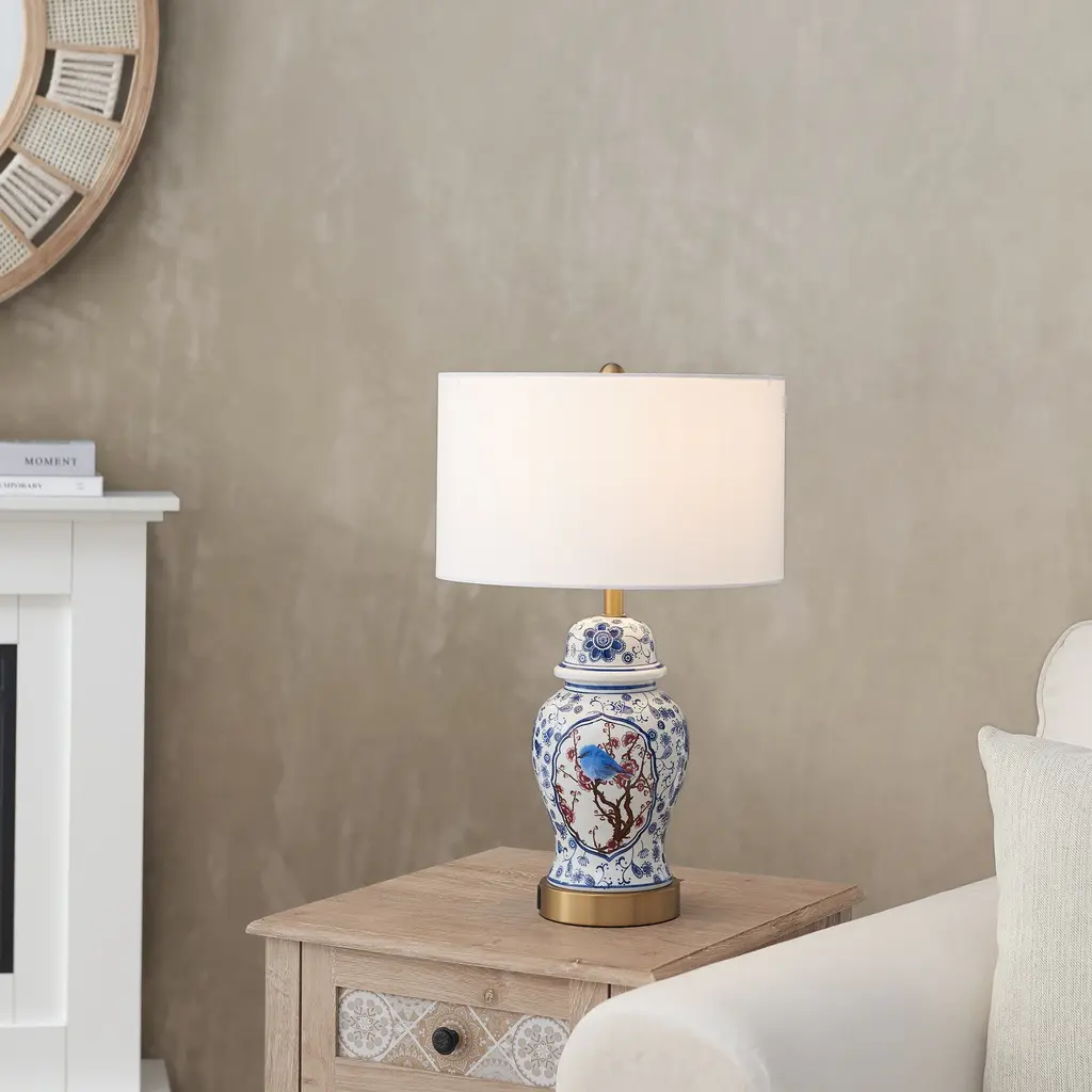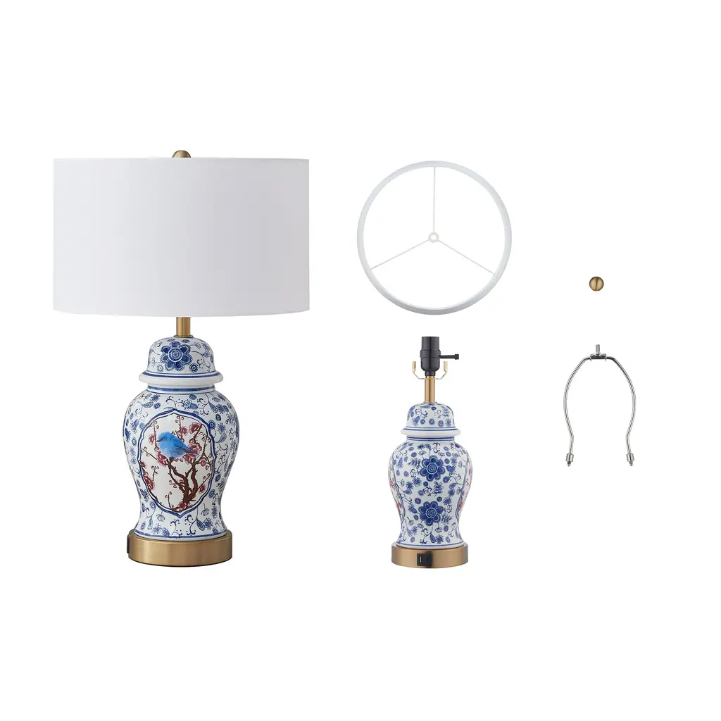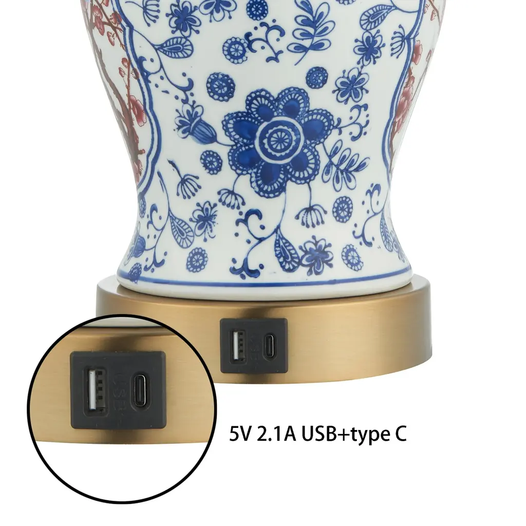 The overall tone of this table lamp base is mainly, and a bird stops on the plum branches in the front, which is classic and elegant. The bottle has a variety of flowers, interesting and beautiful. With white drum cloth lampshade, classic and elegant, can be used as a table lamp or as a work of art, placed in the living room, bedroom, kitchen, hallway and so on. Beautiful and practical. The base is made of ceramic material, thick and delicate, which will become a highlight of the home.Best of all,this table lamp features a 3-way switch that lets you adjust the light to your liking. Built-in 5V 2.1A USB ports included.Features:Blue&White porcelain design for classic and elegantBuilt-in 5V 2.1A USB ports for convenienceCan be installed on the dimmer or smart controllerMounting hardware and detailed instructions includedUL certified for durable and safety use on dry locationSpecifications:Material: Ceramic, fabric, metalOverall: 21.5'' H X 13.5'' W X 13.5'' DBase: 16.01'' H X 6.1'' W X 6.1'' DShade: 7.87'' H X 13.4'' W X 13.4'' DPower Cord Length - End to End: 82.5''Overall Product Weight: 9.02 lb.Bulb Requirement: E26/Medium (Standard)/ max 60w (Not included)Bulb recommend: LED/ Edison/ IncandescentDimmable: Yes, depends on bulbs and switchCertification: UL certifiedWarranty: 1-year limited manufacturer
