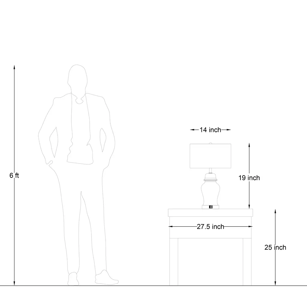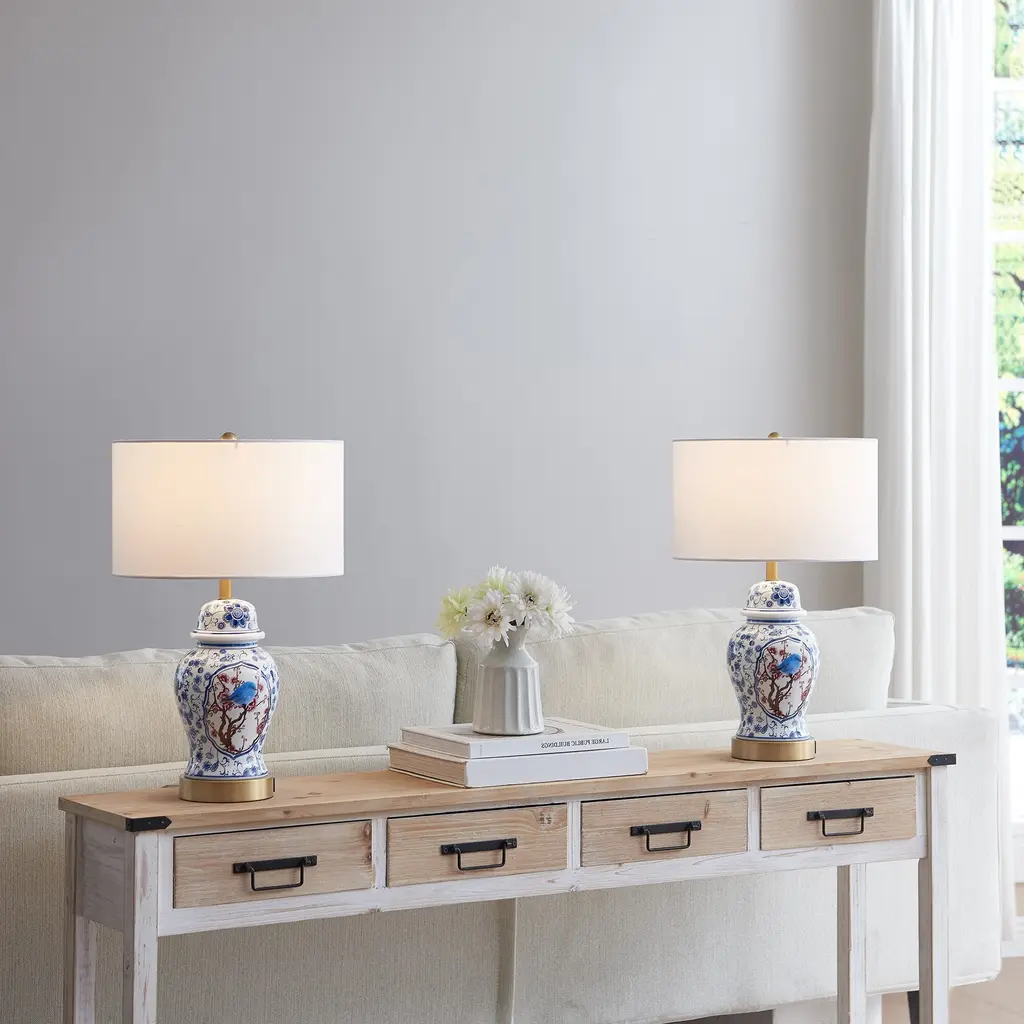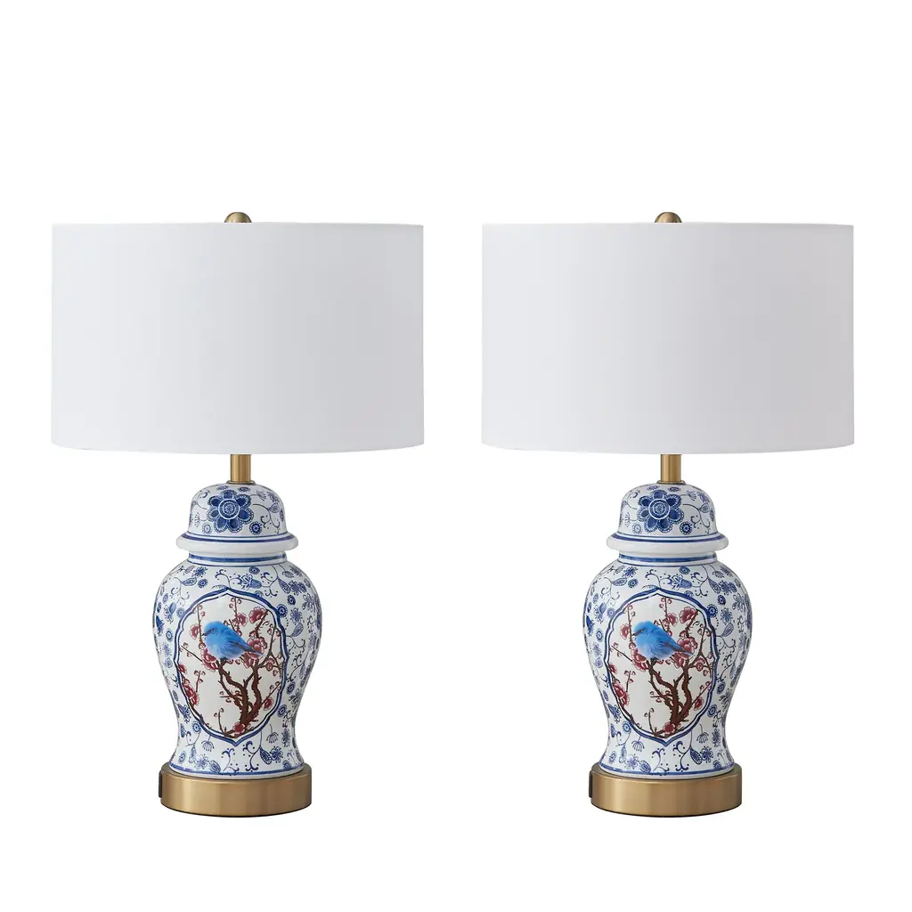 The overall tone of this table lamp base is mainly, and a bird stops on the plum branches in the front, which is classic and elegant. The bottle has a variety of flowers, interesting and beautiful. With white drum cloth lampshade, classic and elegant, can be used as a table lamp or as a work of art, placed in the living room, bedroom, kitchen, hallway and so on. Beautiful and practical. The base is made of ceramic material, thick and delicate, which will become a highlight of the home.Best of all,this table lamp features a 3-way switch that lets you adjust the light to your liking. Built-in 5V 2.1A USB ports included.Features:Blue&White porcelain design for classic and elegantBuilt-in 5V 2.1A USB ports for convenienceCan be installed on the dimmer or smart controllerMounting hardware and detailed instructions includedUL certified for durable and safety use on dry locationSpecifications:Material: Ceramic, fabric, metalOverall: 21.5'' H X 13.5'' W X 13.5'' DBase: 16.01'' H X 6.1'' W X 6.1'' DShade: 7.87'' H X 13.4'' W X 13.4'' DPower Cord Length - End to End: 82.5''Overall Product Weight: 9.02 lb.Bulb Requirement: E26/Medium (Standard)/ max 60w (Not included)Bulb recommend: LED/ Edison/ IncandescentDimmable: Yes, depends on bulbs and switchCertification: UL certifiedWarranty: 1-year limited manufacturer
