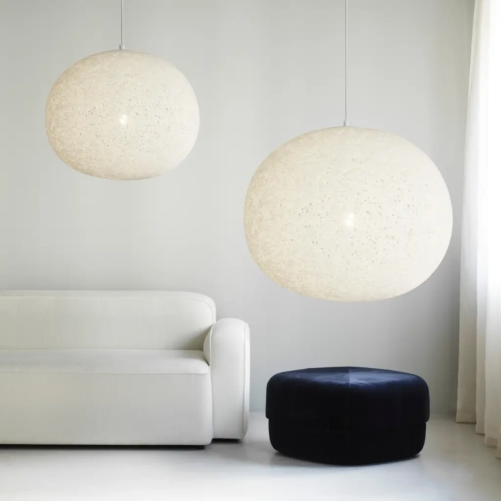 The Amp Table Lamp is inspired by 1960s tube amplifiers. It combines marble and glass, giving it a distinctive character that balances past and present influences. The large, colored glass shade showcases the visible carbon filament bulb, casting a warm glow in all directions.