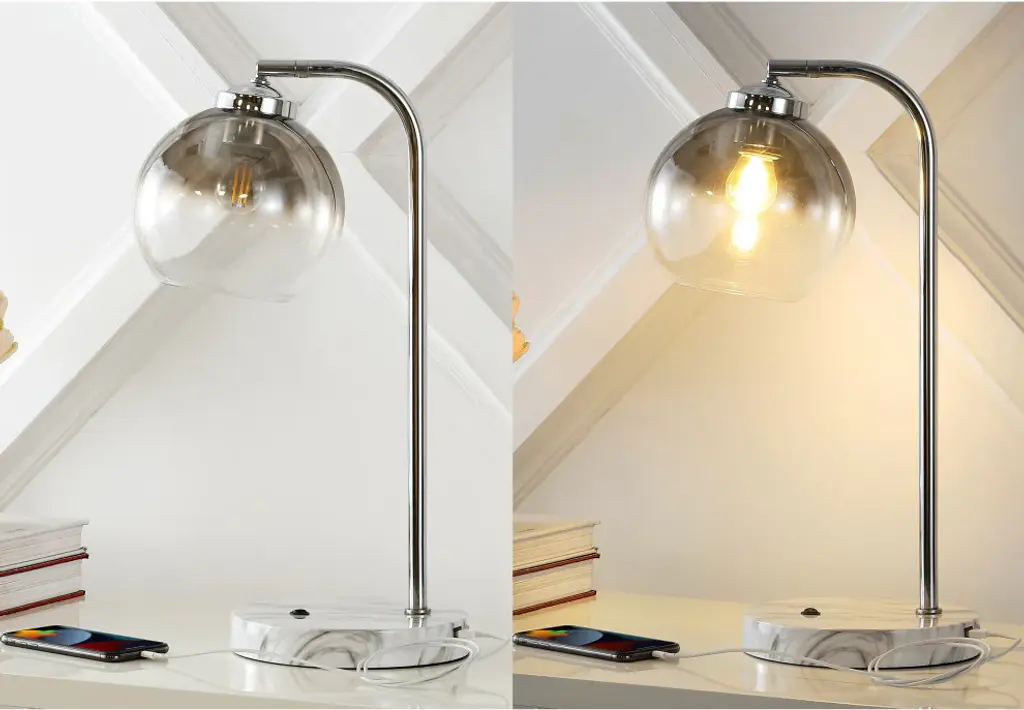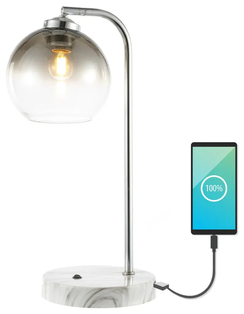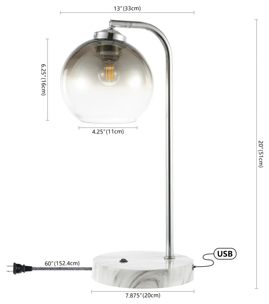 Art Deco style meets modern, minimalist design in this glass orb table lamp. The sleek finish and smoked glass globe create moody accent lighting for a living room or bedroom. An Edison-style LED bulb provides warm, bright light; a USB charging port makes this a handy accent lamp for any room. So stylish, you''ll want a pair!Features:• This minimalist lamp adds a touch of glam with its smoked glass orb, marbled base and sparkling chrome finish• Pivotable lamp head with a built-in USB charging port for modern convenience• Versatile 20" height is perfect for modern, ambient lighting on a table, desk or console• Eco-friendly 4W LED bulb included• Takes 1 bulbs and compatible with TYPE "A" 40W or CFL 13W or LED 9W• Color: Chrome with Smoke Gray/Clear Shade• Body Material: Metal• Includes: One (1) lamp• Assembly RequiredDimensions:• Lamp: 20 inches high x 13 inches wide x 7.875 inches deepAbout us:You see a lamp.We see a decorative work of art.A perfectly curved shade casts a dramatic shadow on a floor. Compatible with LED lightbulbs: as easy on the environment as they are on the eyes. The JONATHAN Y Lighting collection considers every detail from impeccably sourced materials to designer styling. And our prices are so attractive, we''ve transformed a functional necessity into a fashion accessory.JONATHAN Y Lighting - a fashion revolution in home decor.