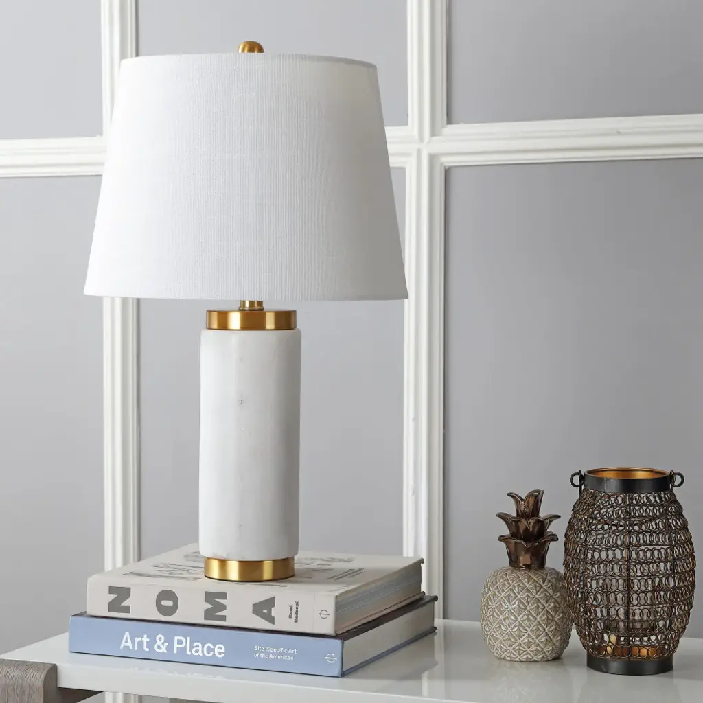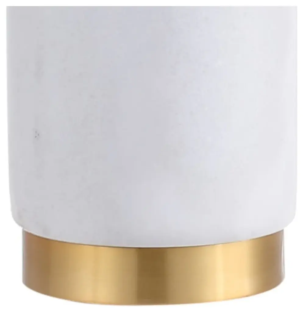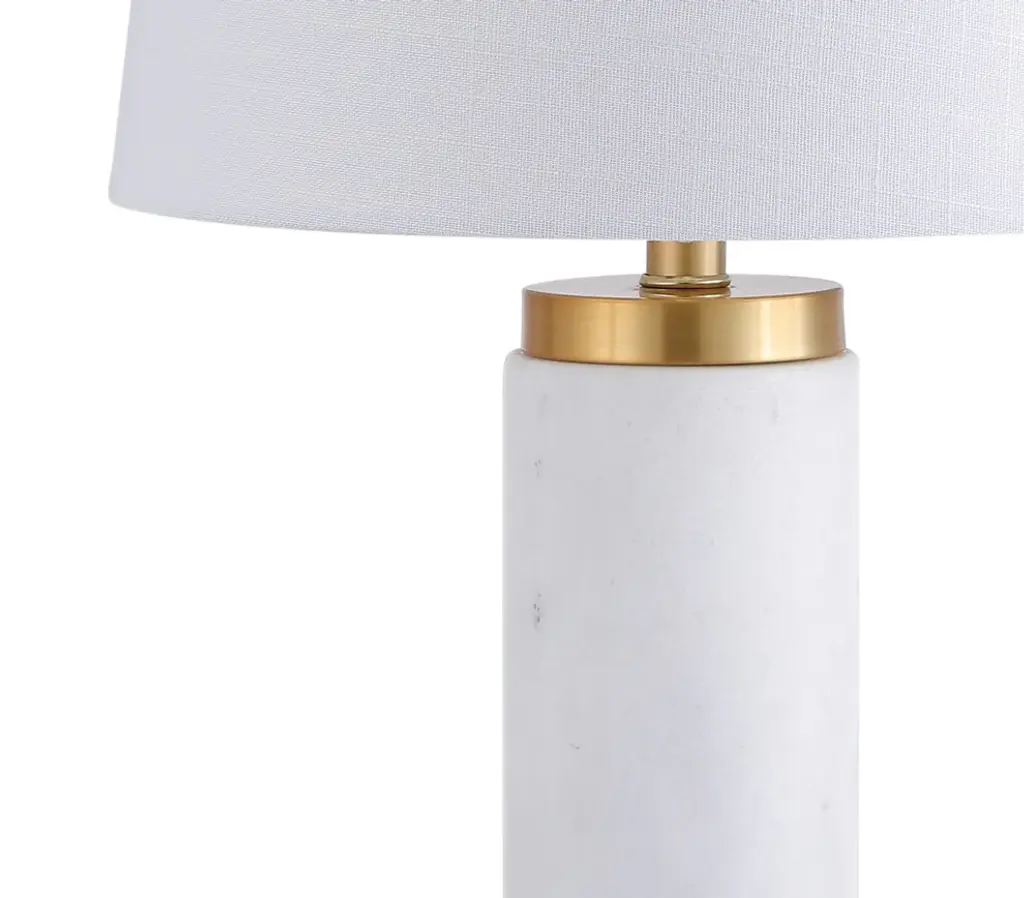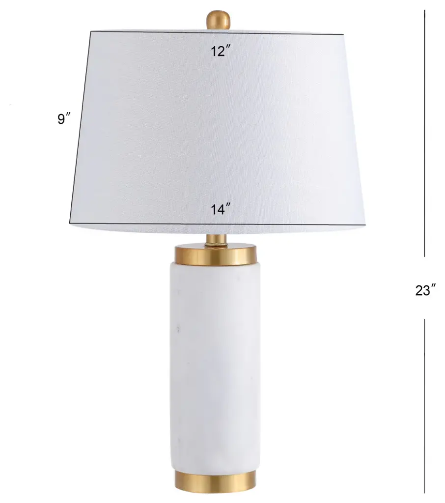 Marble has long been prized for its durability and beauty, and in this classic column base, both shine. Capped in brass accents and a slightly tapered drum shade, the contemporary styling of this column lamp would be even more perfect positioned in a pair. Finished with a silk-wrapped cord and brass finial, this piece will add style and light to your decor for years to come. -Marble and brass accents make this classic column lamp a stunning addition to your home-100% cotton hardback drum shade with a slightly tapered shape-60" silk cord with standard USA 2-prong plug -On-off switch on socket-Takes one maximum 100 watt or equivalent bulb -Eco-friendly 9W LED bulb included-UL Listed-Color: White/Gold Base with white shade-Body Material: Marble / Metal-Base Material: Iron-Finial Material: Metal-Finial Color: Brass Gold-Harp Color: Gold-Includes: One (1) lamp(s)-Minor Assembly Required-Lamp: 23 inches high x 14 inches wide x 14 inches deep-Shade: 9 inches high x 14 inches wide x 14 inches deepAbout us: You see a lamp.We see a decorative work of art.A perfectly curved shade casts a dramatic shadow on a floor. A silk cord you never want to hide. LED lightbulbs: as easy on the environment as they are on the eyes. The JONATHAN Y Lighting collection considers every detail from impeccably sourced materials to designer styling. And our prices are so attractive, we''ve transformed a functional necessity into a fashion accessory.JONATHAN Y Lighting a fashion revolution in home dcor.