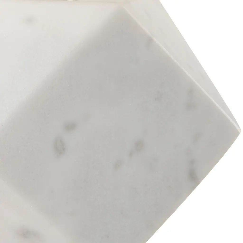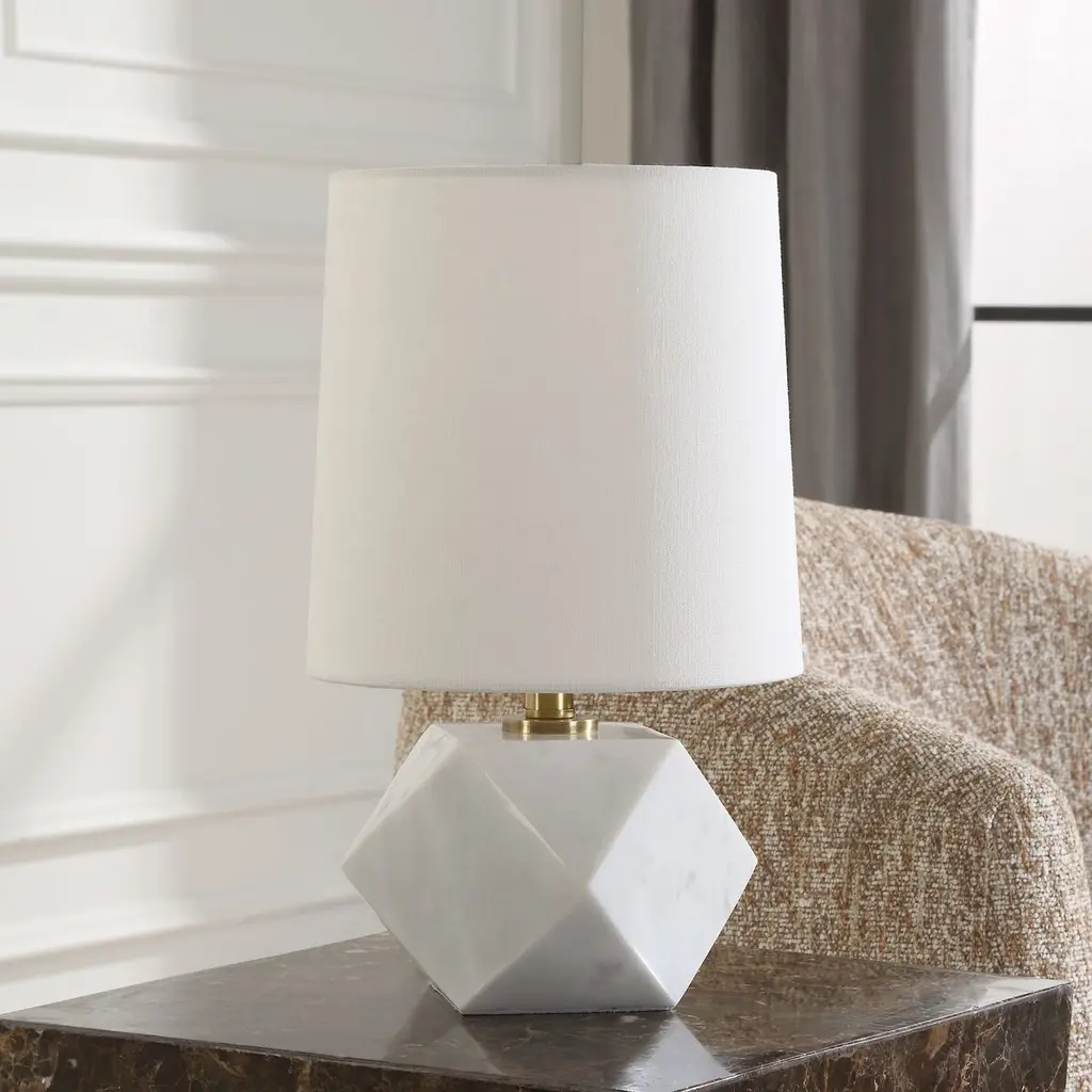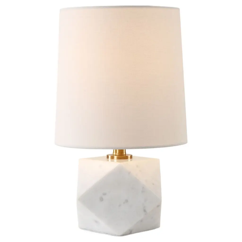 The Adela Table Lamp is a masterpiece of design, showcasing a striking faceted silhouette that exudes elegance and sophistication. Expertly crafted from exquisite marble, it features subtle veining that adds a touch of natural beauty. The lamp is complemented by antique brass hardware, lending a timeless charm to its overall aesthetic. Topping off this stunning piece is a slightly tapered round hardback shade, enveloped in luxurious white linen fabric with delicate slubbing, creating a soft and inviting glow. This lamp is not just a source of light, but a statement piece that elevates any space with its refined presence.