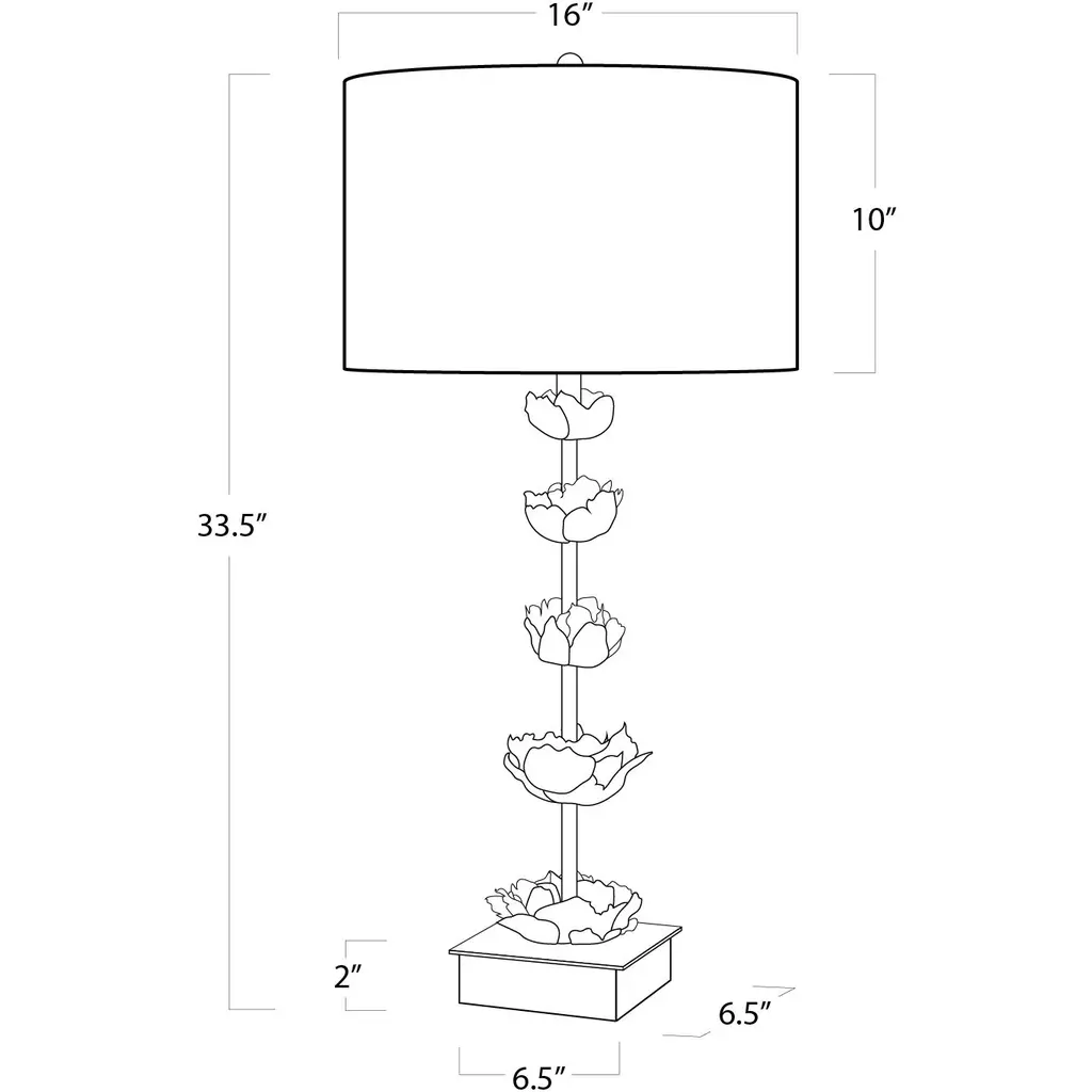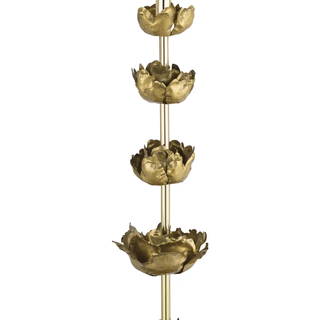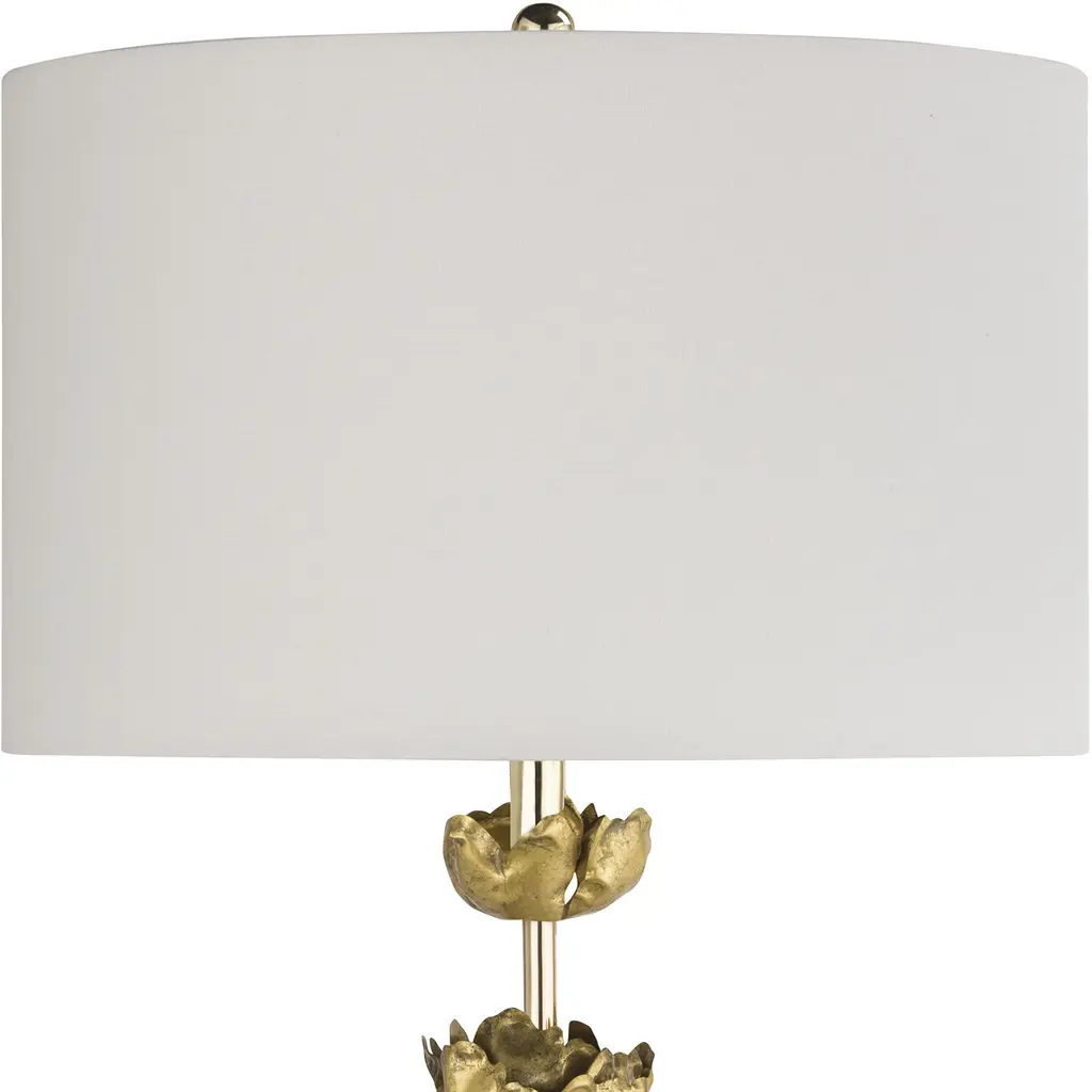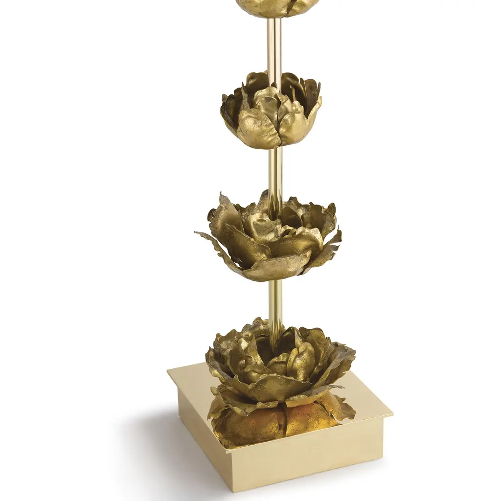 Boasting gold blossom-like accents throughout the base of the lamp and completed with a traditional shade, this piece is a forward-thinking work of art. Graduating metal flowers gilded in antique gold leaf sit atop a glamorous polished gold base.