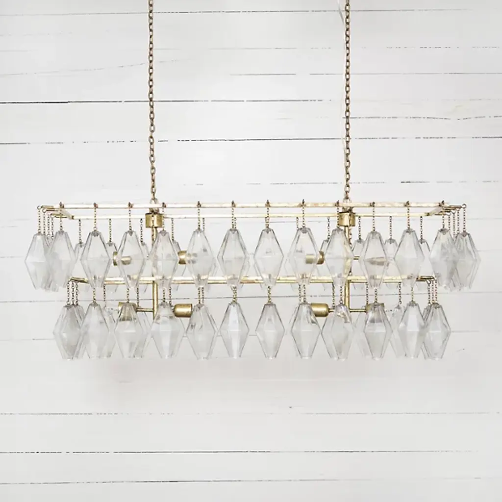 The Adeline Linear Suspension from Four Hands brings an expansive warmth to ceilings, its open design enhanced by an insistent, expressive intricacy. Starting with a low-profile rectangle canopy, it dispatches slim chains in parallel to a double-tiered shade structure draped around two vertical columns of lamping. Each element of the metal shade structure echoes the canopy, suggesting a glittering piece of spectacular jewelry by suspending faceted beads of iridescent glass from the edge of each metal frame via small lengths of chain, the inner lamping casting an individual reflection from each tiny facet.