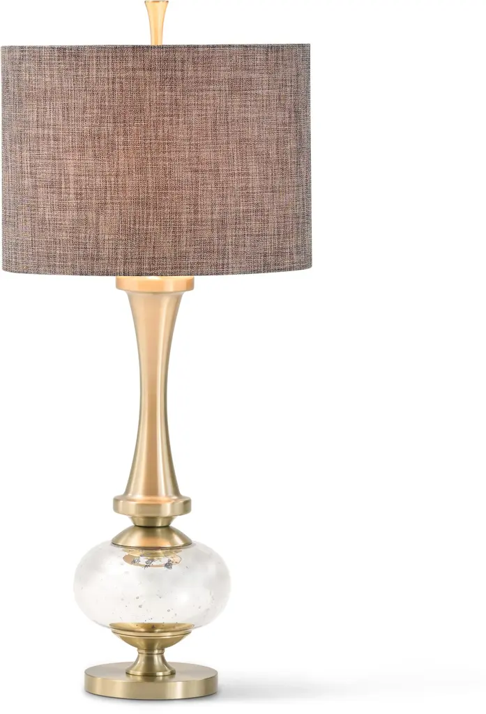 Shed light on your space with this exquisite lamp. Its graceful silhouette is bound to bring on the compliments. Featuring a chic mercury glass sphere and an antique brass finish.