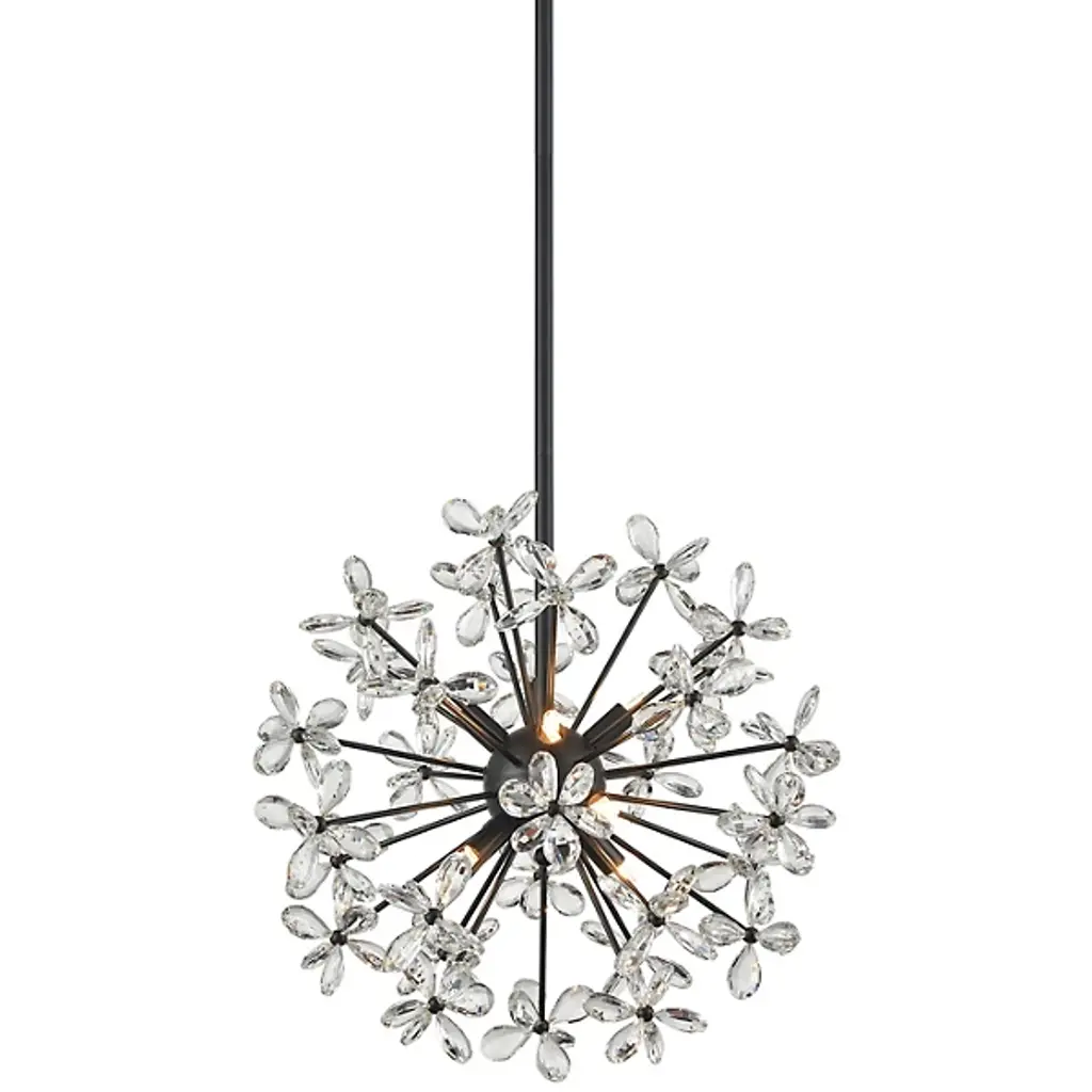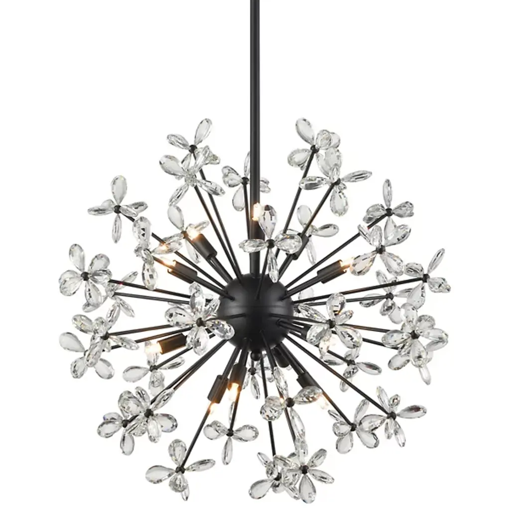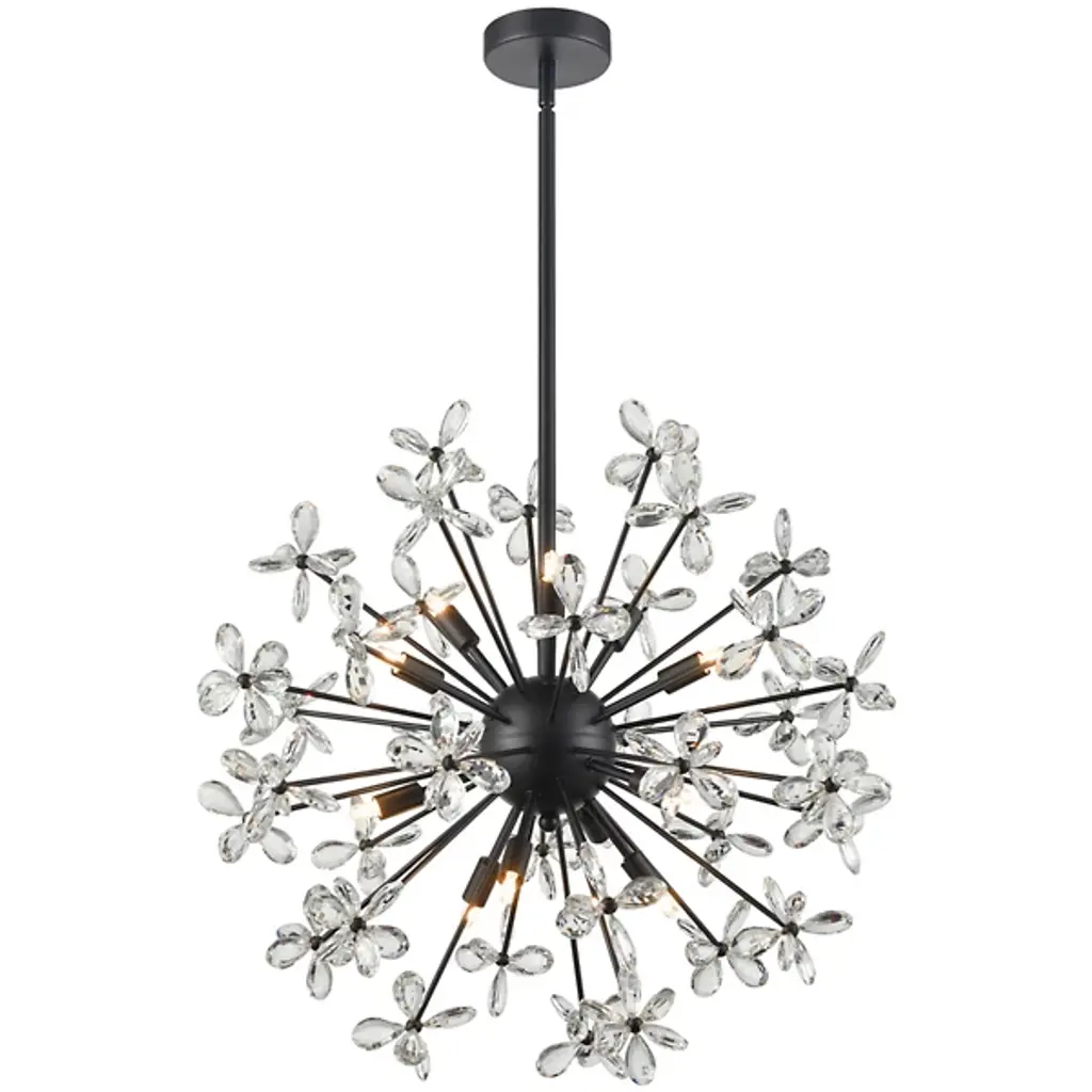 Say hello to the airy and open style of the Adelle Chandelier from Zeev Lighting. A sputnik-style fixture resembling a dangling dandelion puff, the light and well-considered design descends from a circular canopy via a thin stem. A central spherical hub extends open candelabra lamping amid a series of slim rods capped with small glass blossoms, glittering with reflected light amid a wash of even illumination cast in all directions.