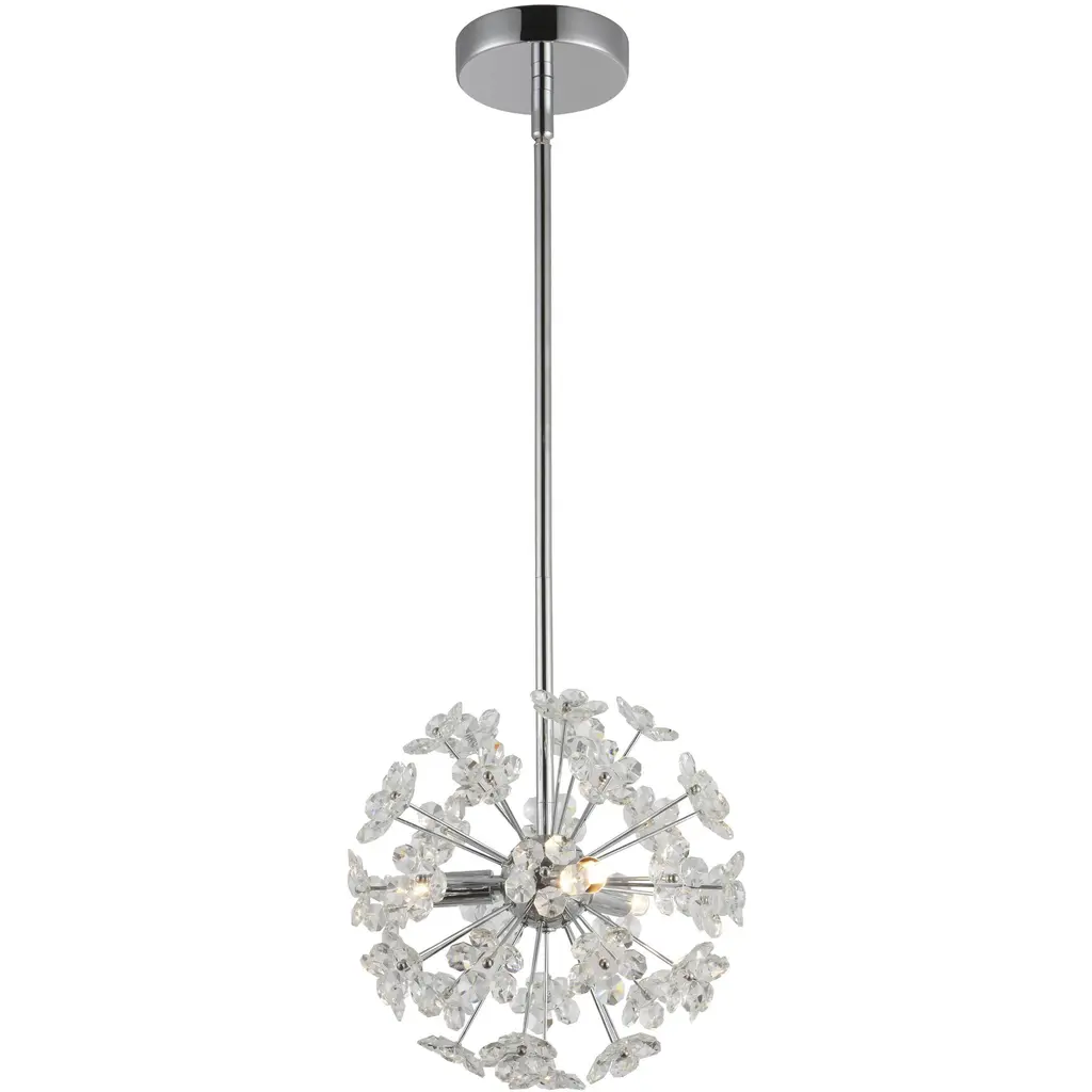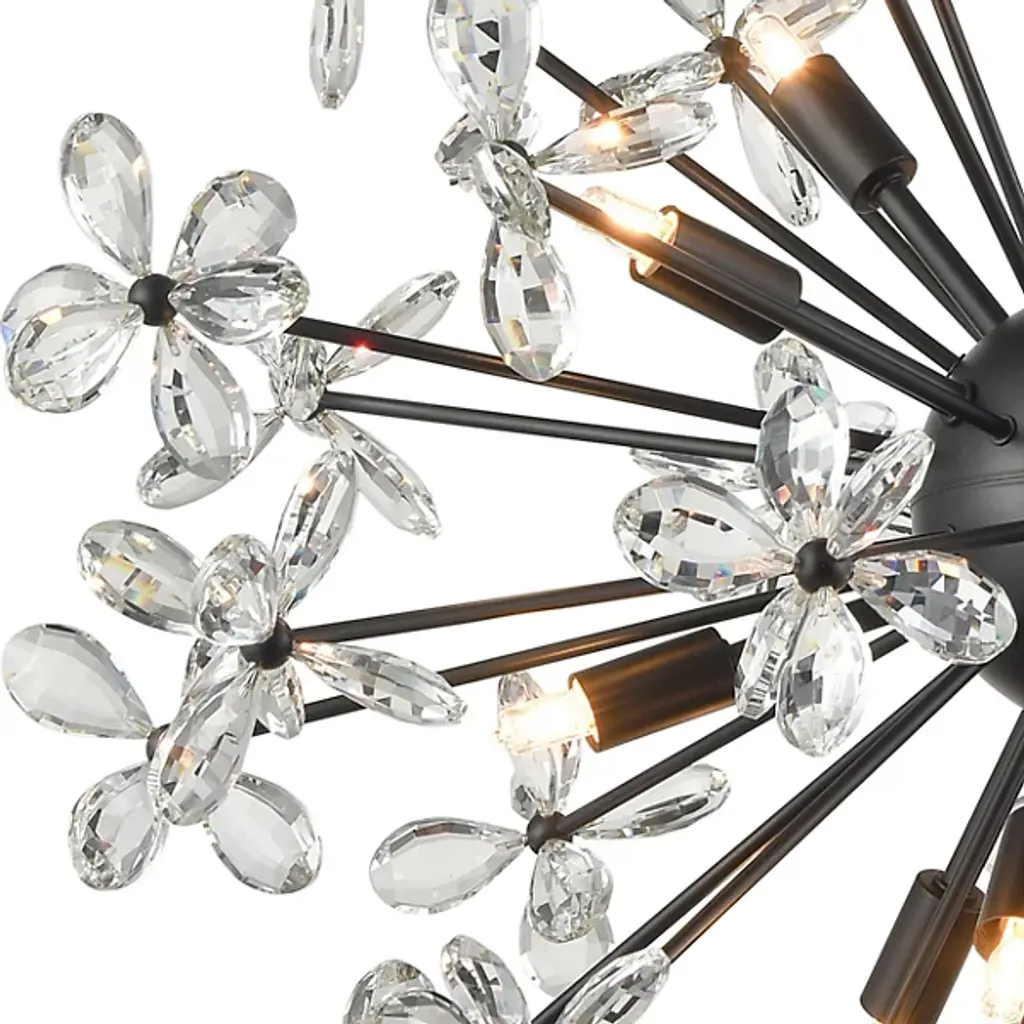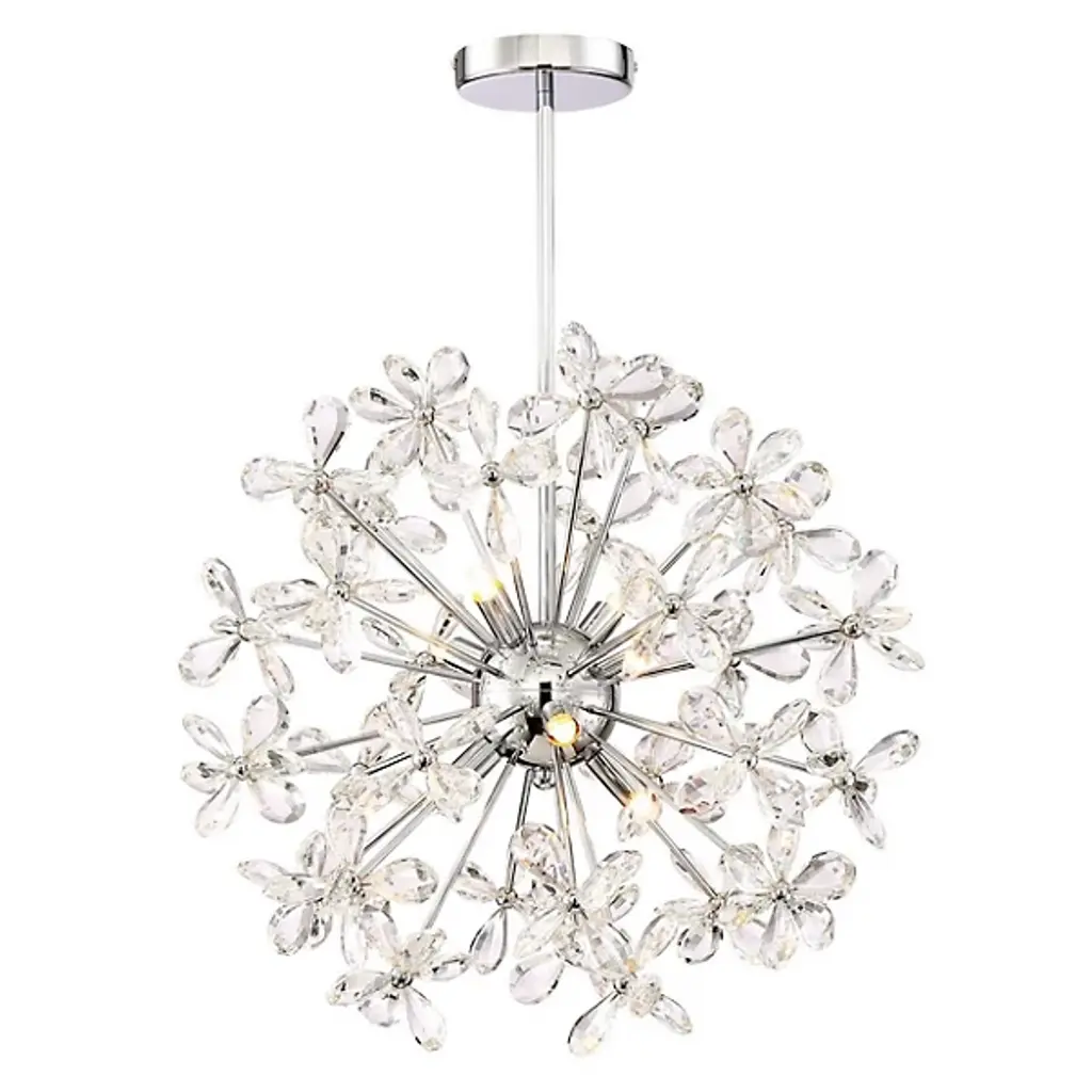 Say hello to the airy and open style of the Adelle Chandelier from Zeev Lighting. A sputnik-style fixture resembling a dangling dandelion puff, the light and well-considered design descends from a circular canopy via a thin stem. A central spherical hub extends open candelabra lamping amid a series of slim rods capped with small glass blossoms, glittering with reflected light amid a wash of even illumination cast in all directions.