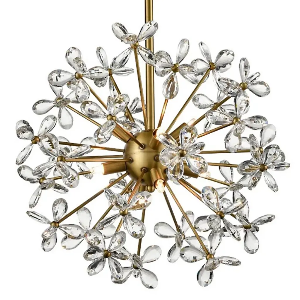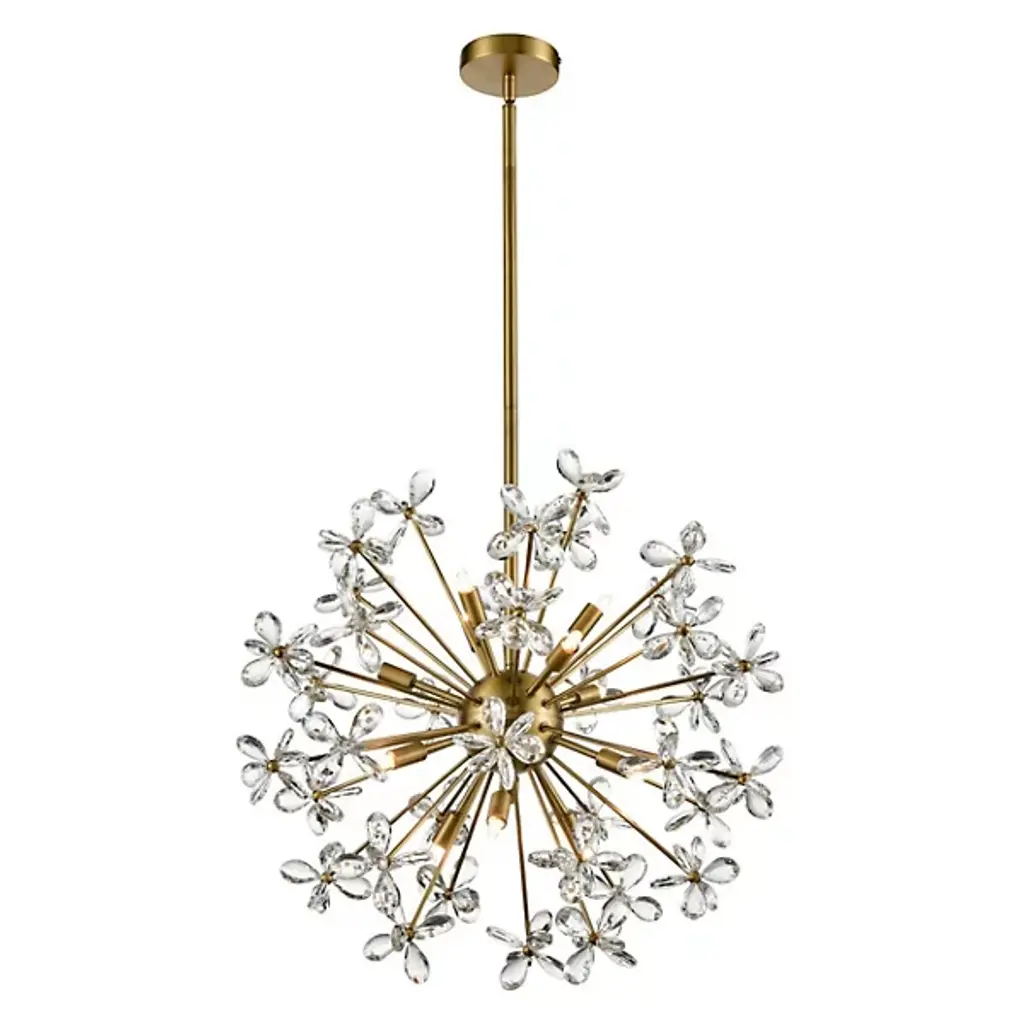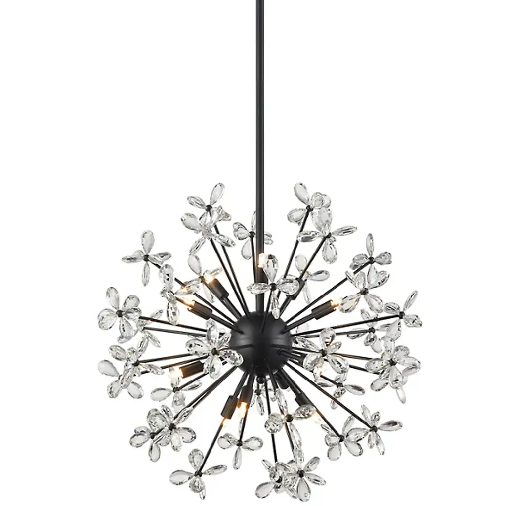 Say hello to the airy and open style of the Adelle Chandelier from Zeev Lighting. A sputnik-style fixture resembling a dangling dandelion puff, the light and well-considered design descends from a circular canopy via a thin stem. A central spherical hub extends open candelabra lamping amid a series of slim rods capped with small glass blossoms, glittering with reflected light amid a wash of even illumination cast in all directions.