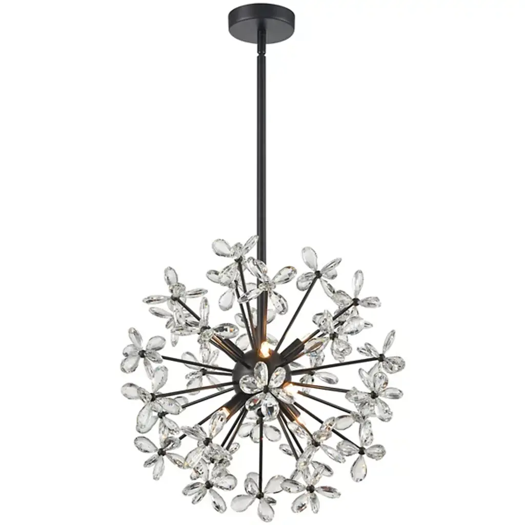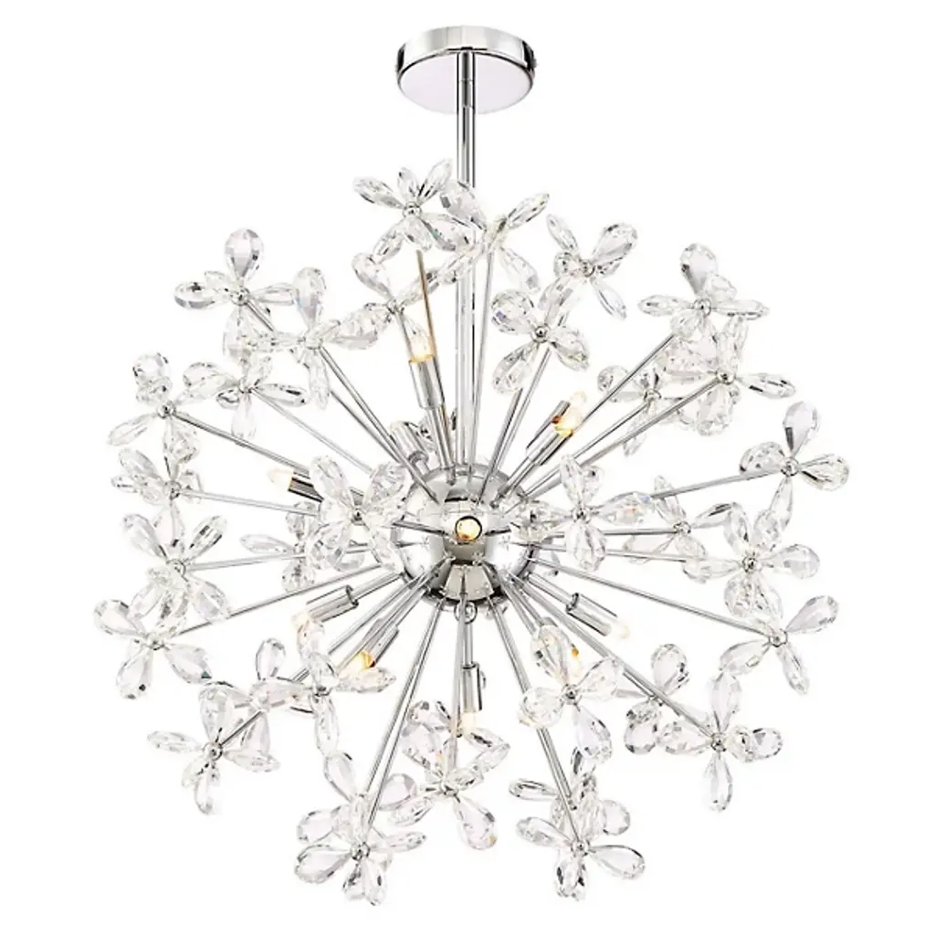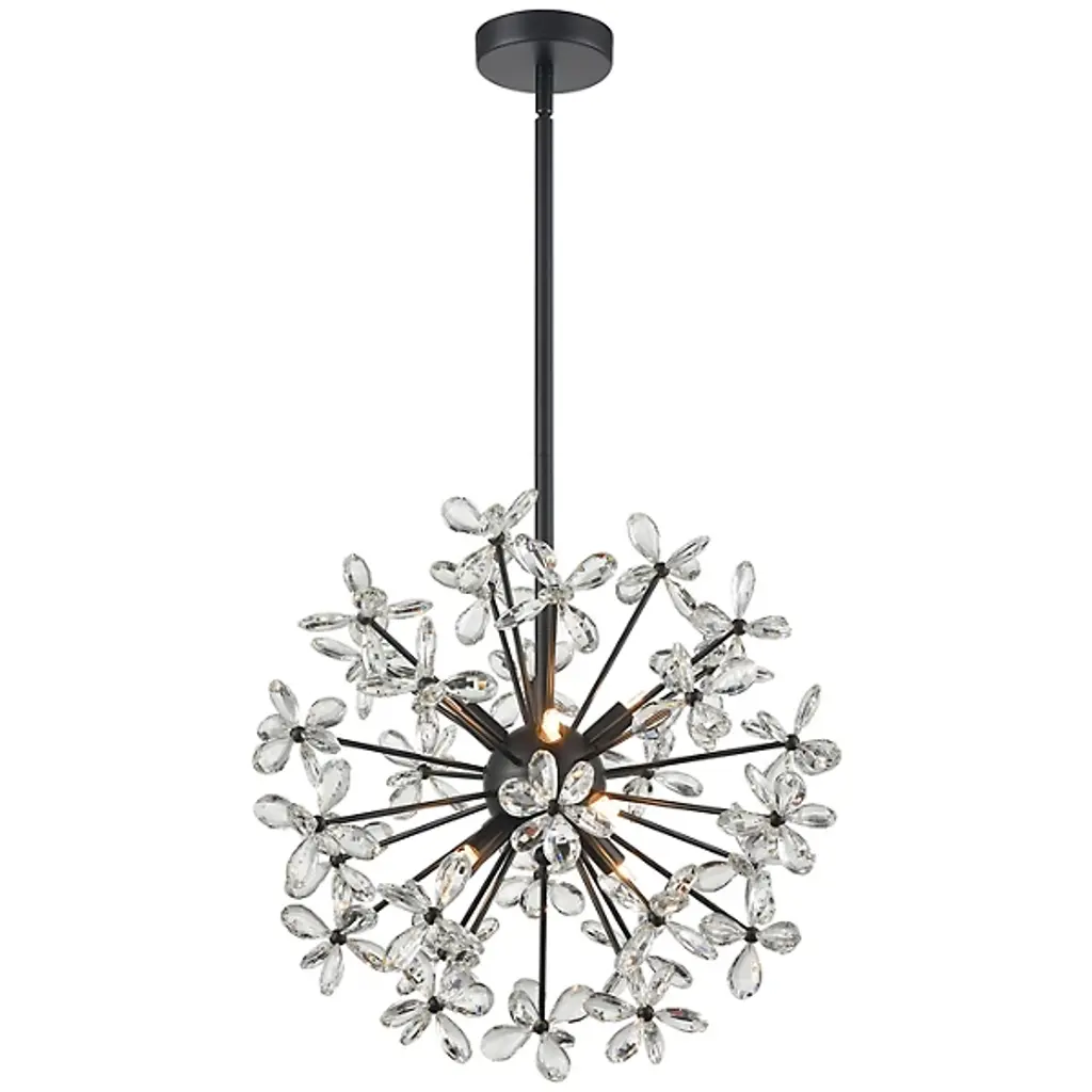 Say hello to the airy and open style of the Adelle Chandelier from Zeev Lighting. A sputnik-style fixture resembling a dangling dandelion puff, the light and well-considered design descends from a circular canopy via a thin stem. A central spherical hub extends open candelabra lamping amid a series of slim rods capped with small glass blossoms, glittering with reflected light amid a wash of even illumination cast in all directions.
