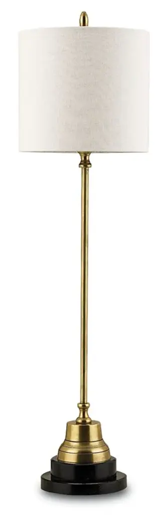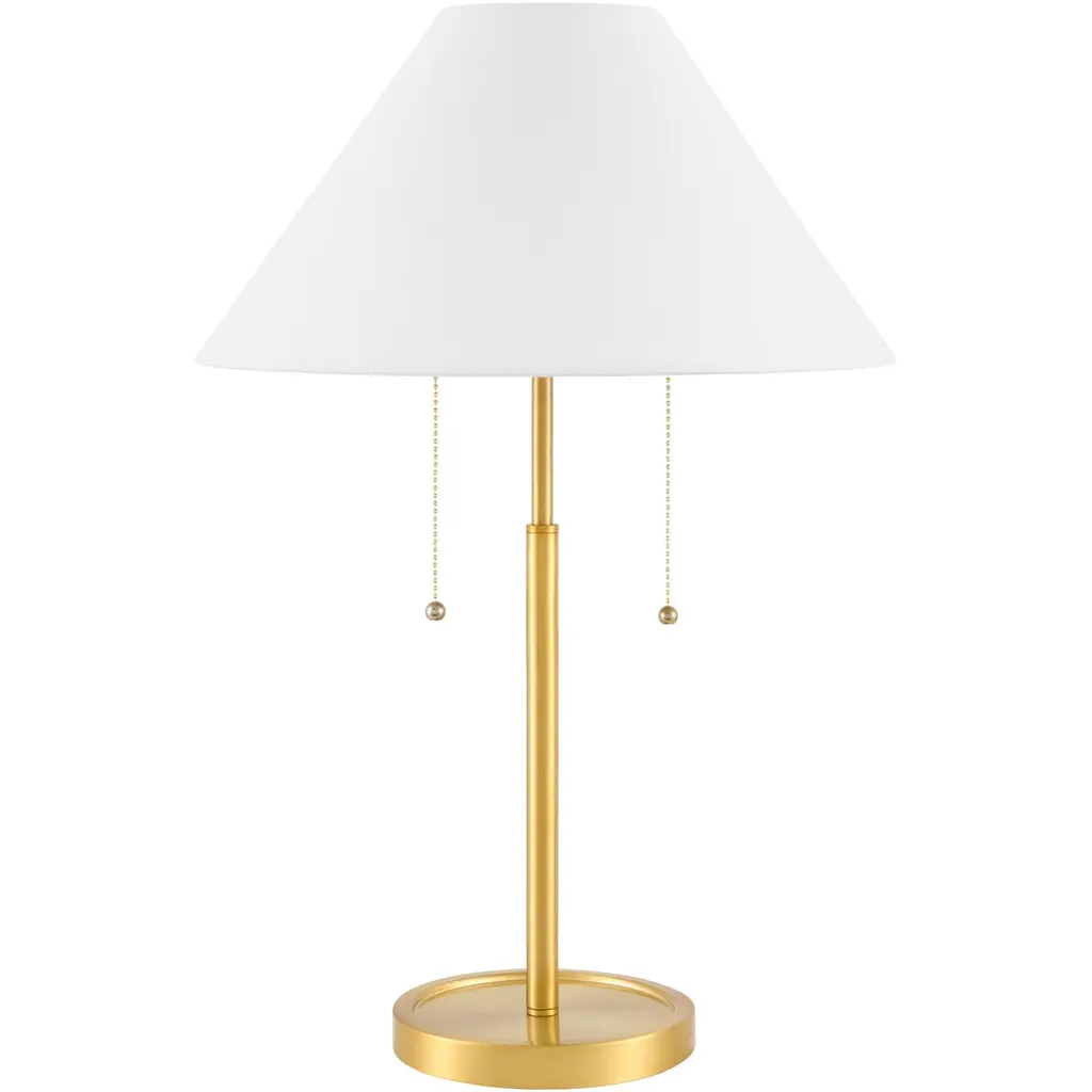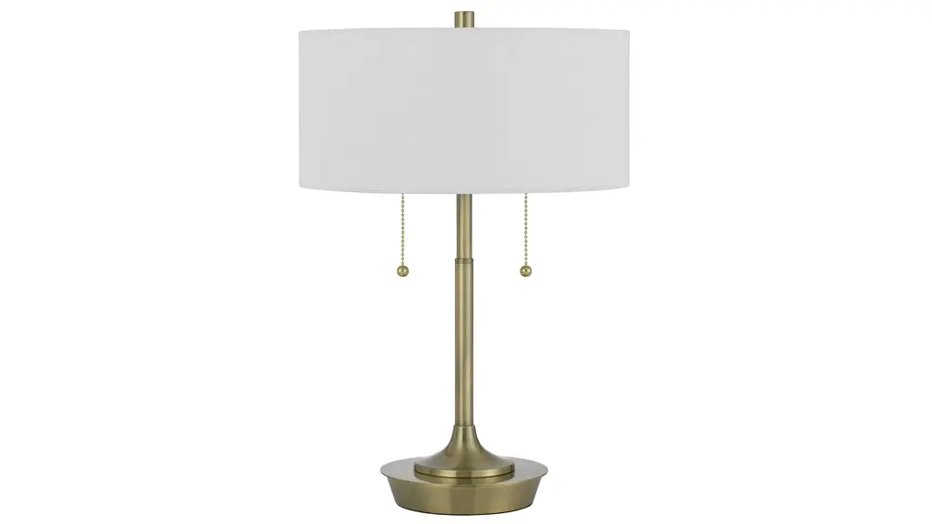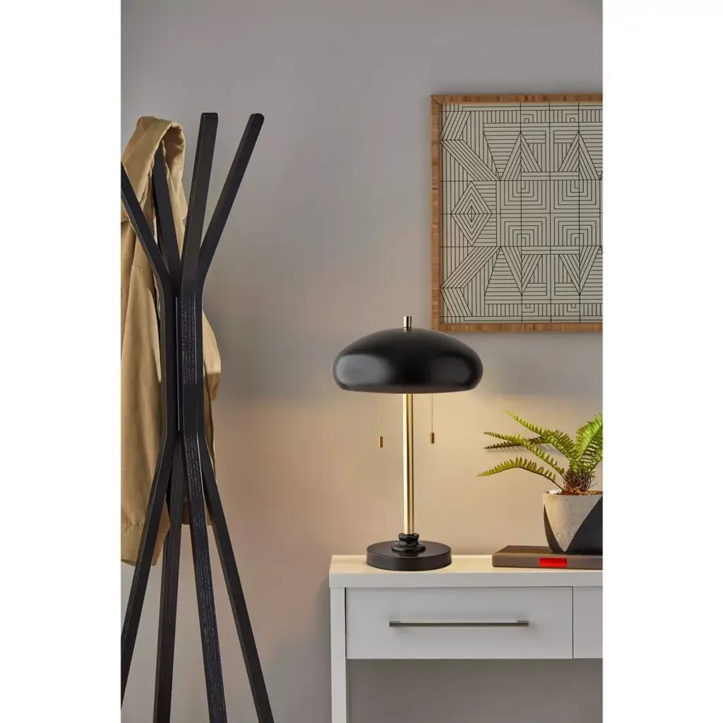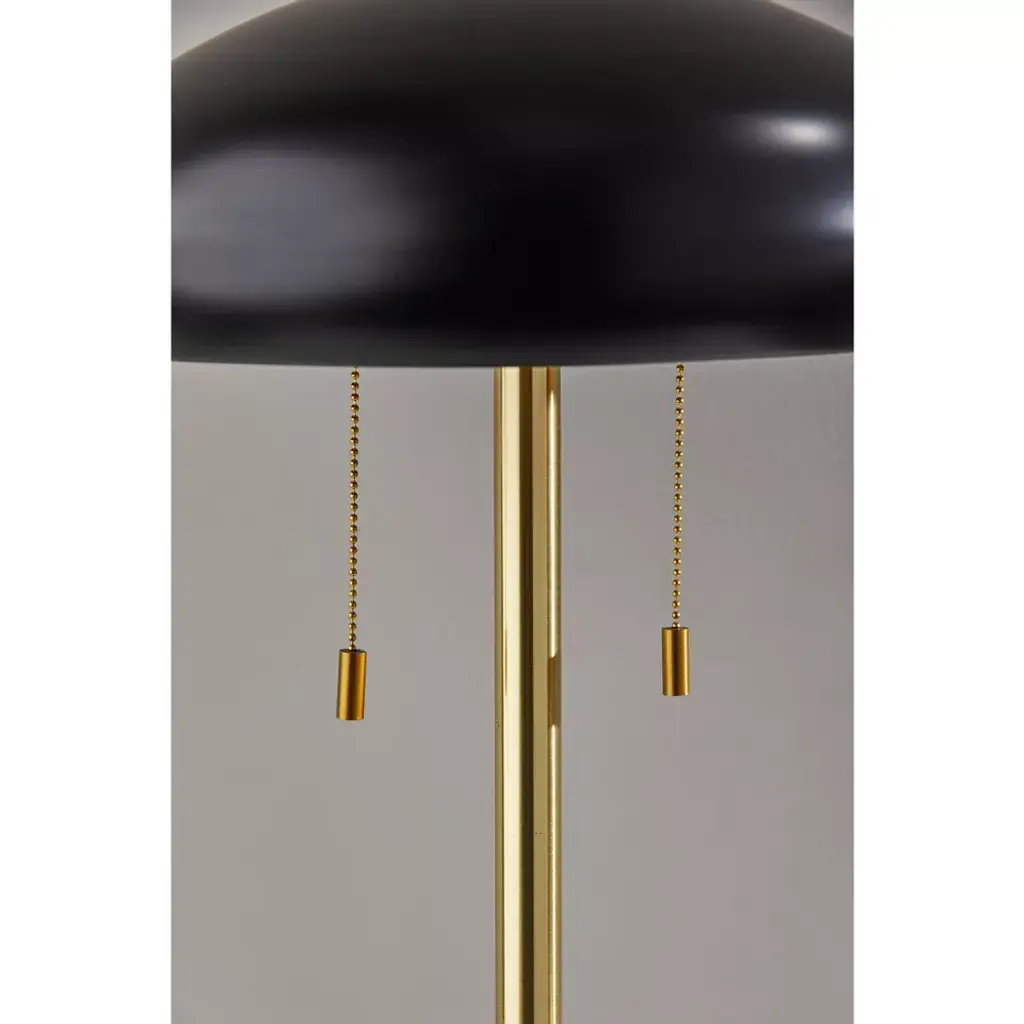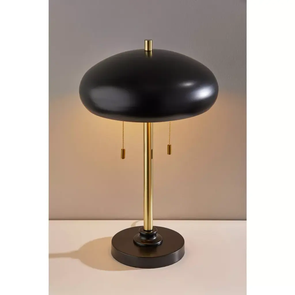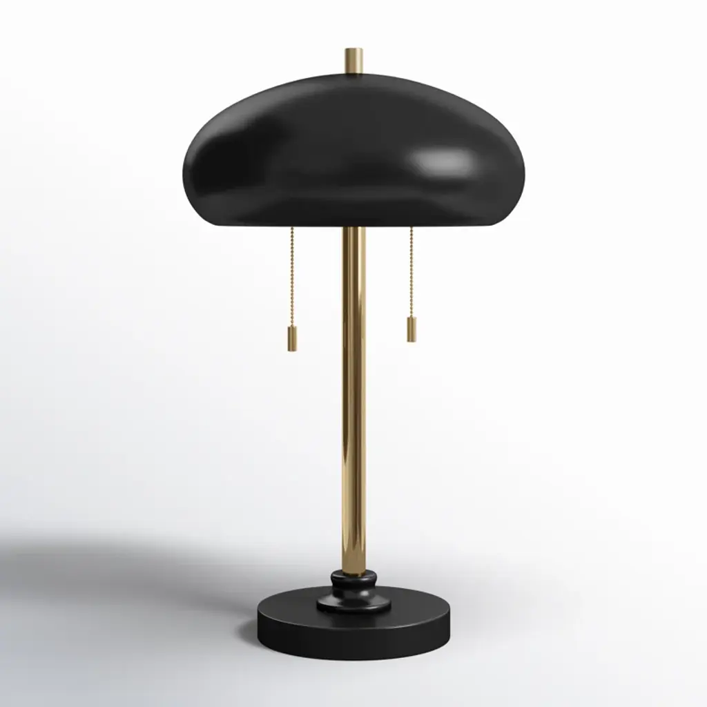 Add a mid-century accent to your bedroom, living room or office space with the Cap Table Lamp. A black metal dome shade has a gold painted inside for optimal light reflection. Two sockets each hold a standard 40W bulb, each controlled by its own pull chain switch providing 2 brightness settings. Black and antique brass finishes are mixed to create a versatile, modern look.