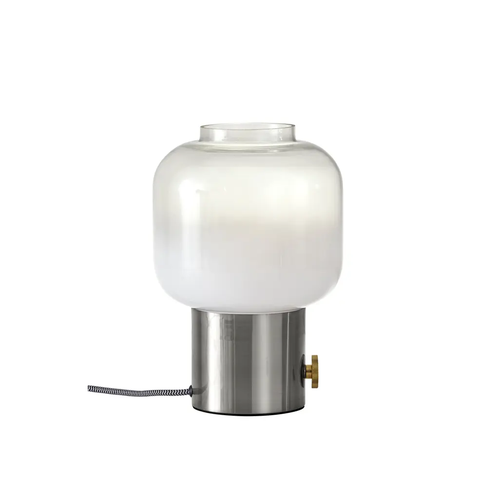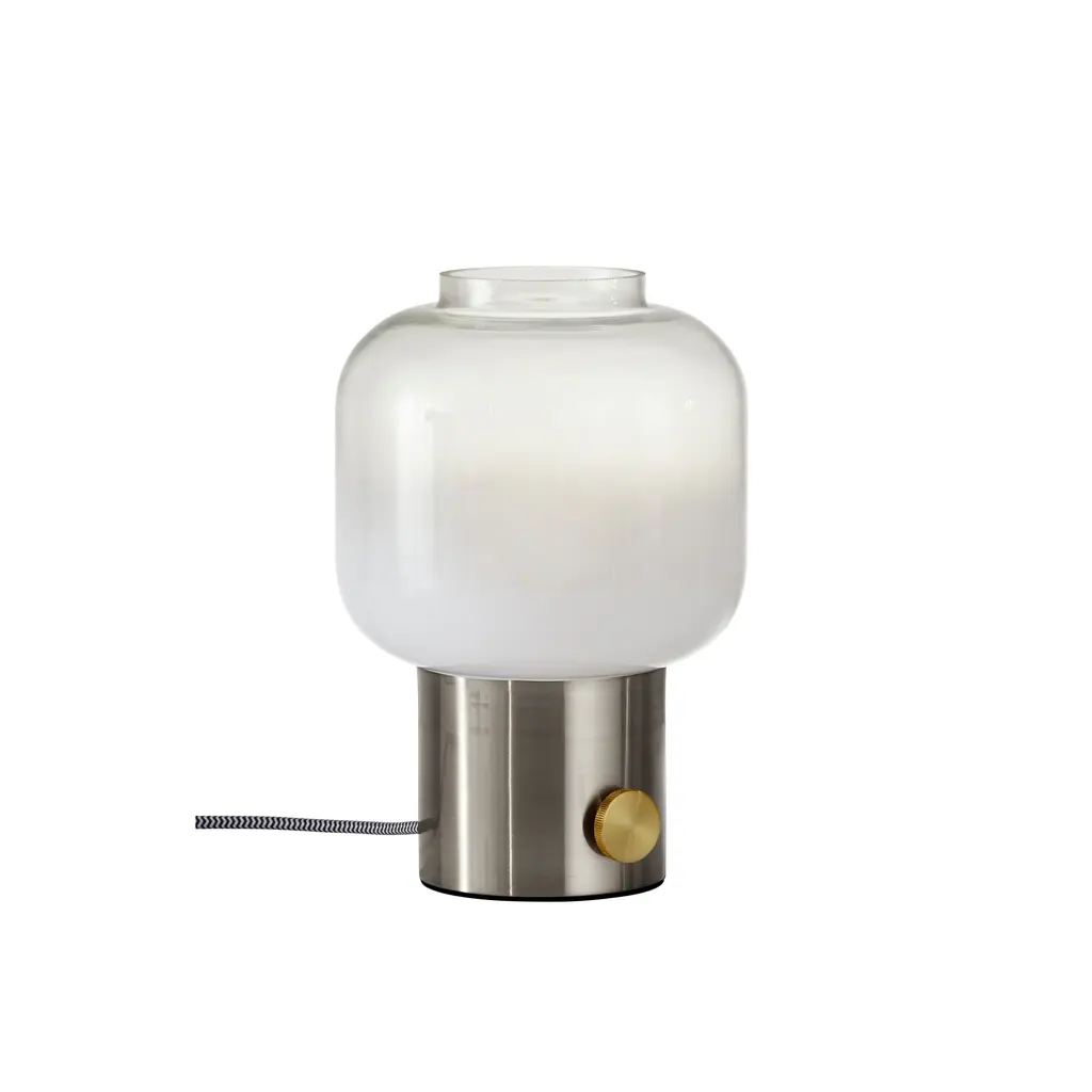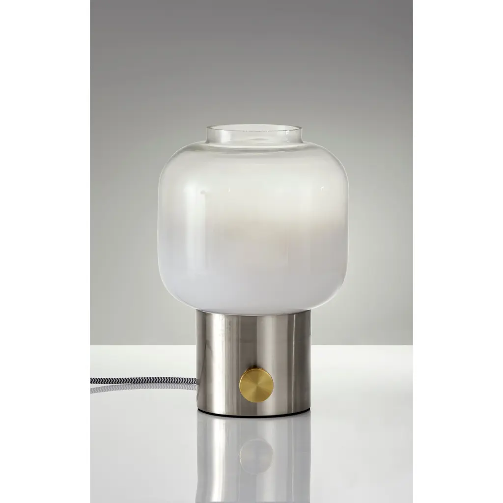 Add a touch of elegance to your living room or bedroom with the Adesso Lewis Accent Table Lamp. The beautiful glass shade fades from white to clear, and is complemented by a matte black, antique brass, or brushed steel metal base with a large round knob switch. With its compact size, this lamp is also perfect for bookcases and shelves.Features: