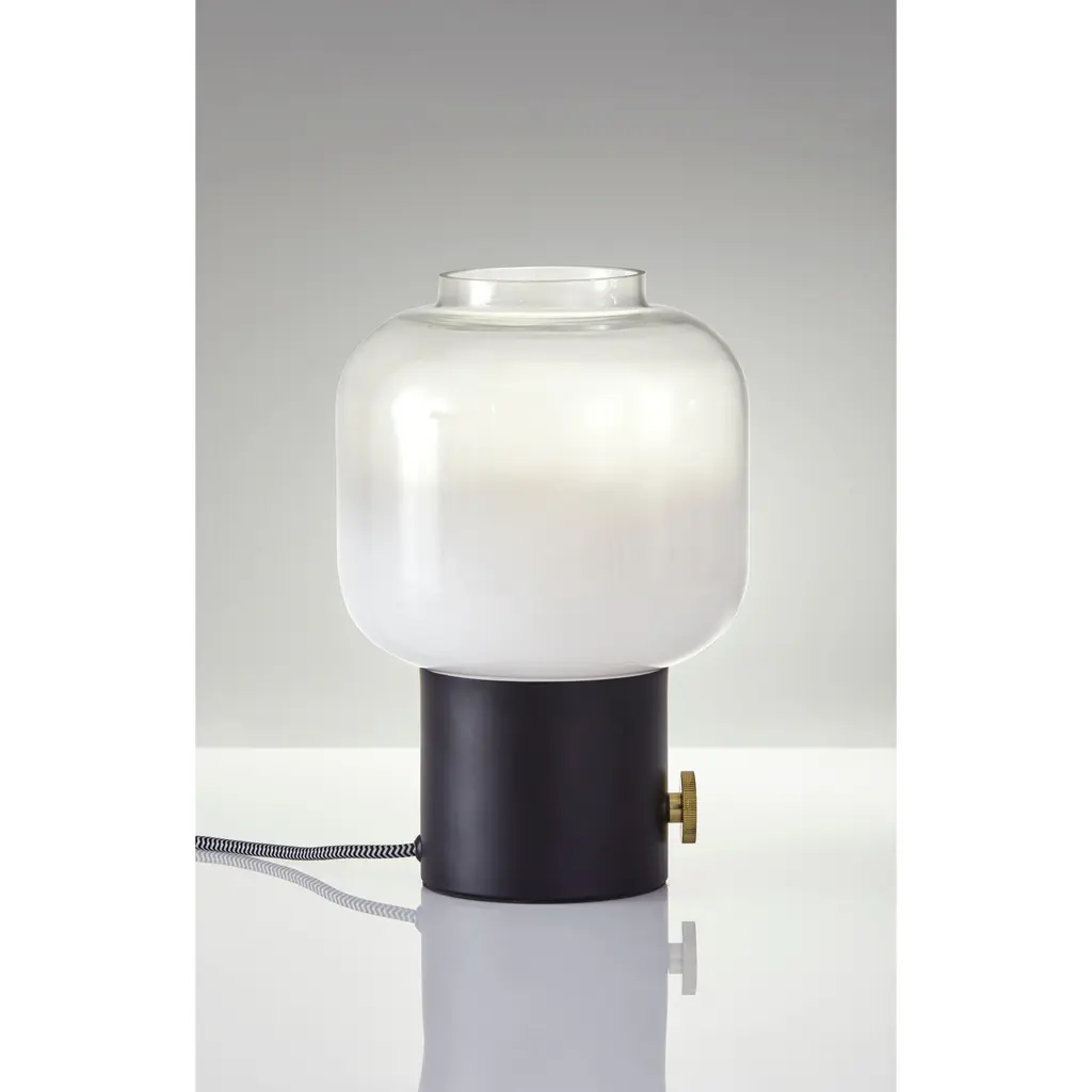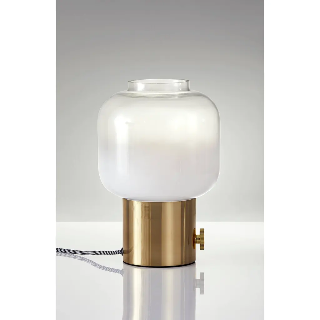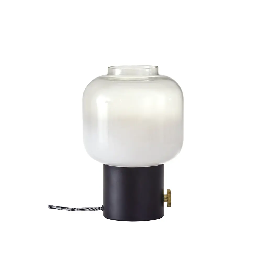 Add a touch of elegance to your living room or bedroom with the Adesso Lewis Accent Table Lamp. The beautiful glass shade fades from white to clear, and is complemented by a matte black, antique brass, or brushed steel metal base with a large round knob switch. With its compact size, this lamp is also perfect for bookcases and shelves.Features: