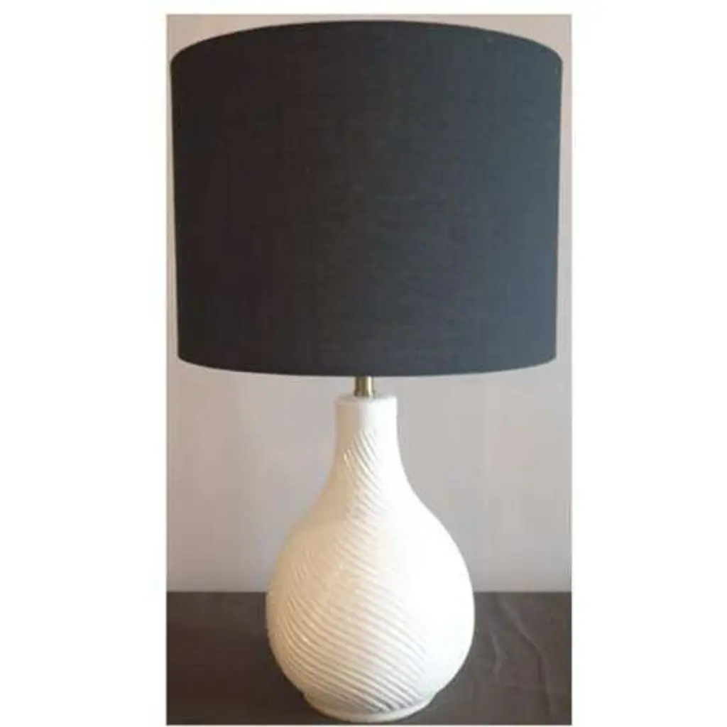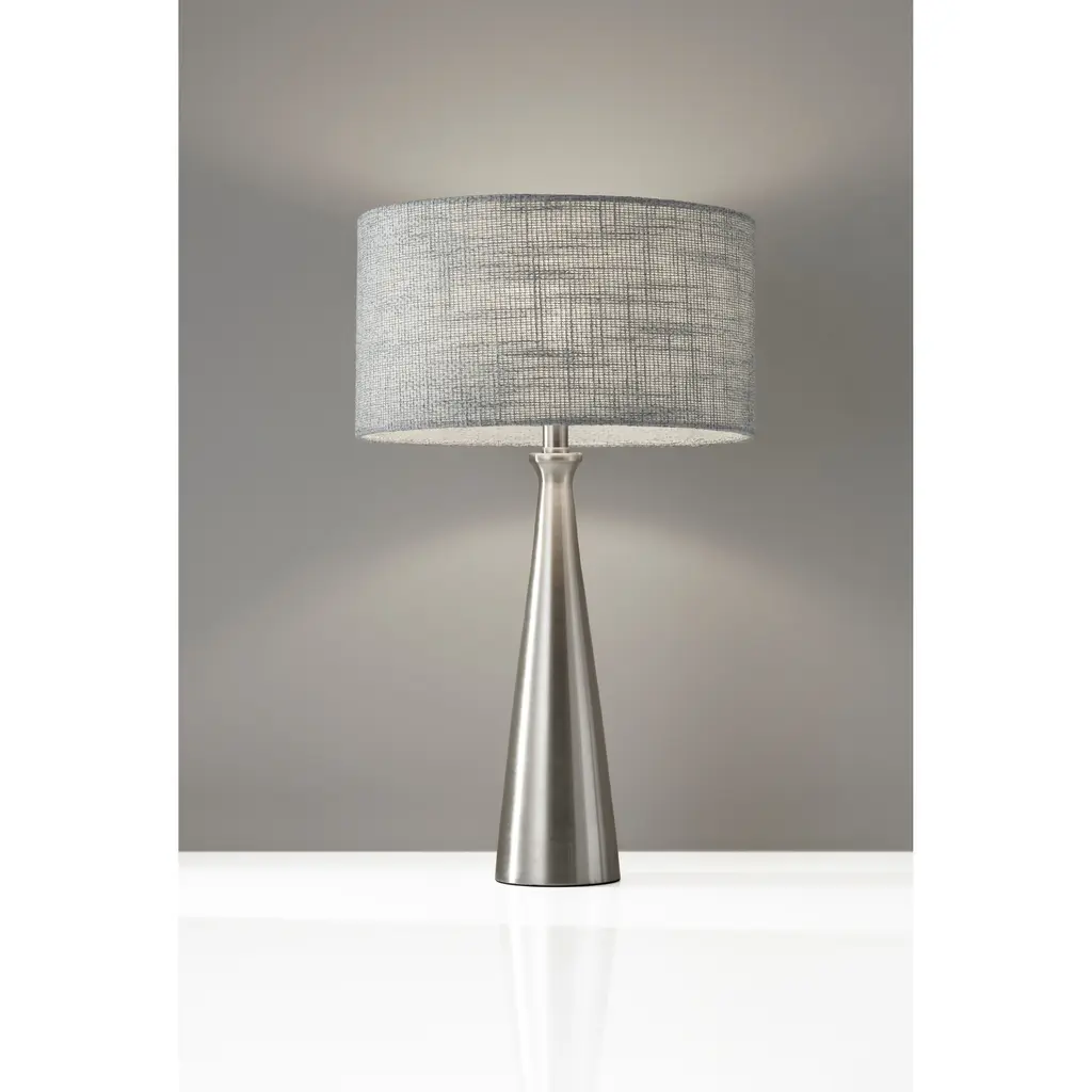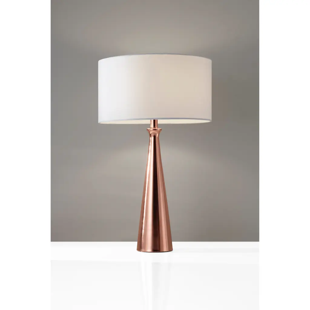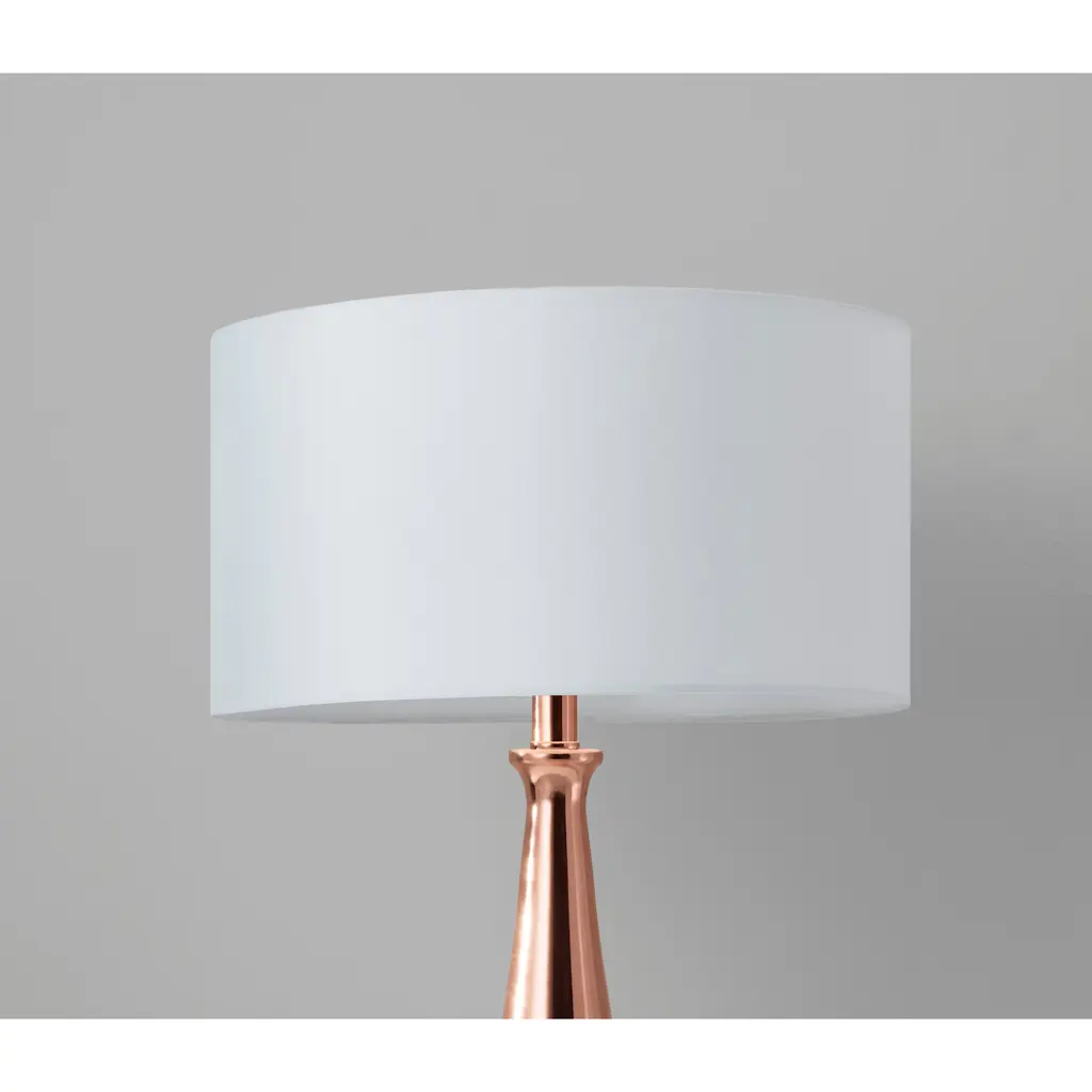 A smooth, tapered base with a shiny copper and white linen shade, brushed steel with a textured grey shade or s black finish with a textured cream shade beautifully reflects light. The Linda Table Lamp is the perfect size for a desk or side table. A 3-way rotary socket switch will only work with a 3-way light bulb, otherwise this lamp will function with simple on/off switch at its highest setting. This table lamp has a clear cord and is smart outlet compatible. Bulb is not included. Available in a black, brushed steel or shiny copper finish and coordinating shade 3-way rotary socket switch with clear 60-inch cord Requires (1) 100-Watt incandescent/ 26-Watt CFL bulb (Not included) Smart outlet compatible 21.5 in. total height Shade Dimensions: 13 Dia. X 7 H inches Base Dimensions: 4" Dia. X 14" H inches Overall Width: 13.00 in. Safety Rating: ETL Listed 1-Year Limited Manufacturer Warranty