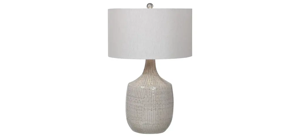 With soft curves and a warm, coastal design, the Sheffield table lamp makes a stylish addition to nightstands, end tables, or accent tables. The 22" tall lamp features a short, round base crafted of white ceramic leading to a short natural rattan drum shade. The woven rattan shade softly disperses light from a 100W bulb and is trimmed in beige fabric along the top and bottom, complementing the white base. Operated by a 3-way rotary switch, you can easily adjust the brightness between low, medium, and high to suit your lighting needs. For a contrasting color scheme, the Sheffield table lamp is also available with a black ceramic base, while the turquoise ceramic base option adds a vibrant pop of color. Complete your décor with the coordinating Sheffield table lantern, featuring a short ceramic base and tall rattan drum shade.