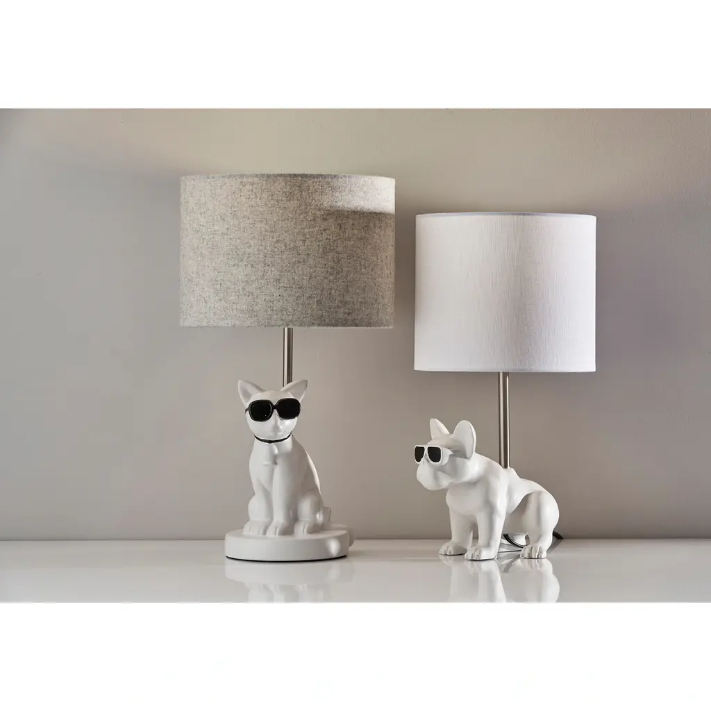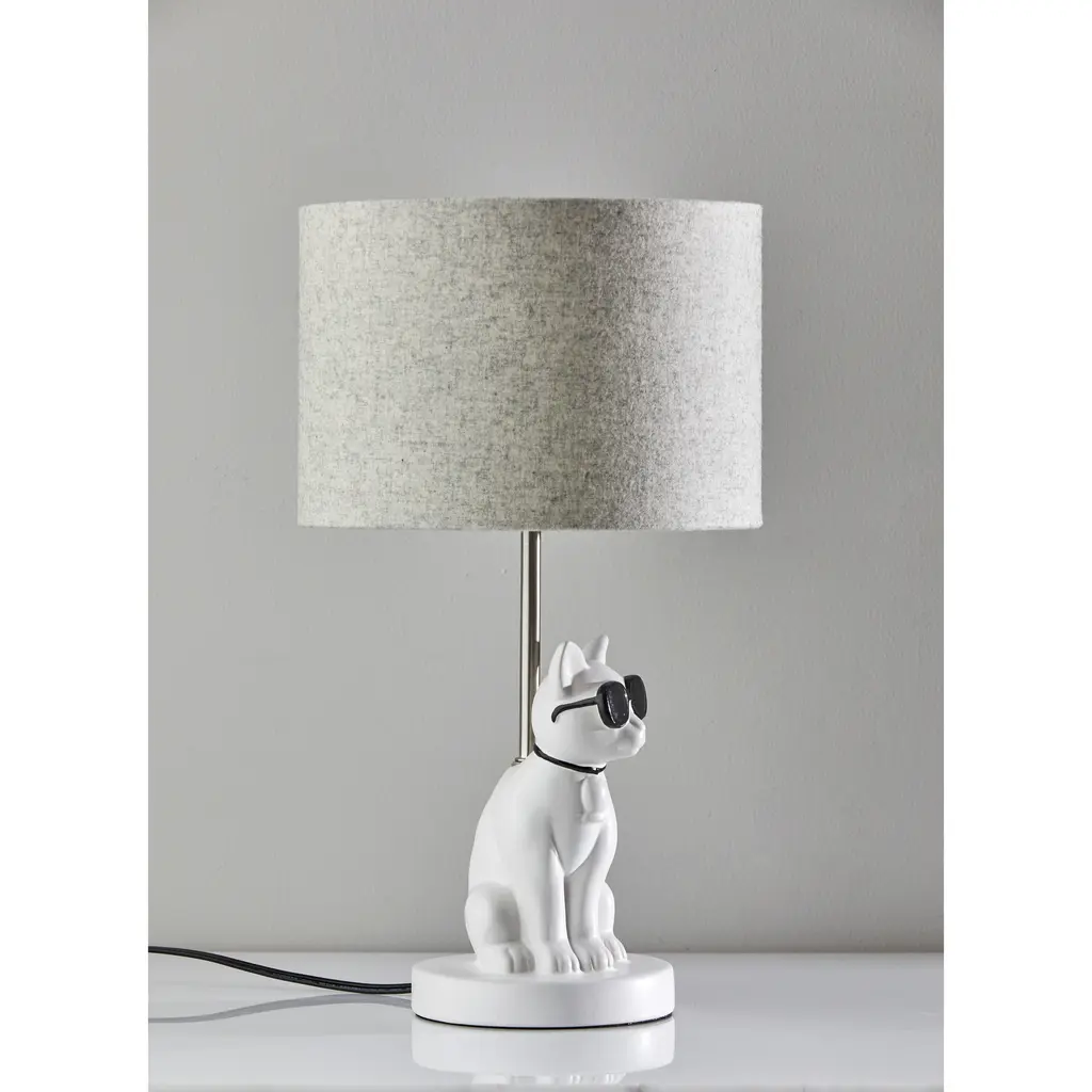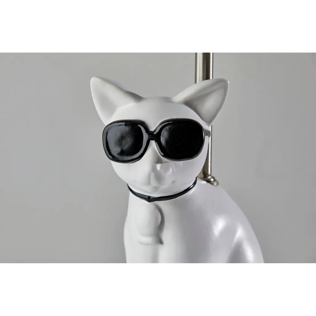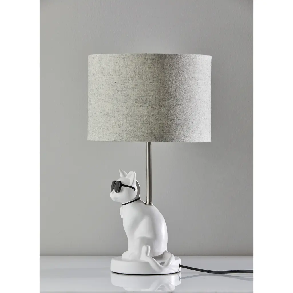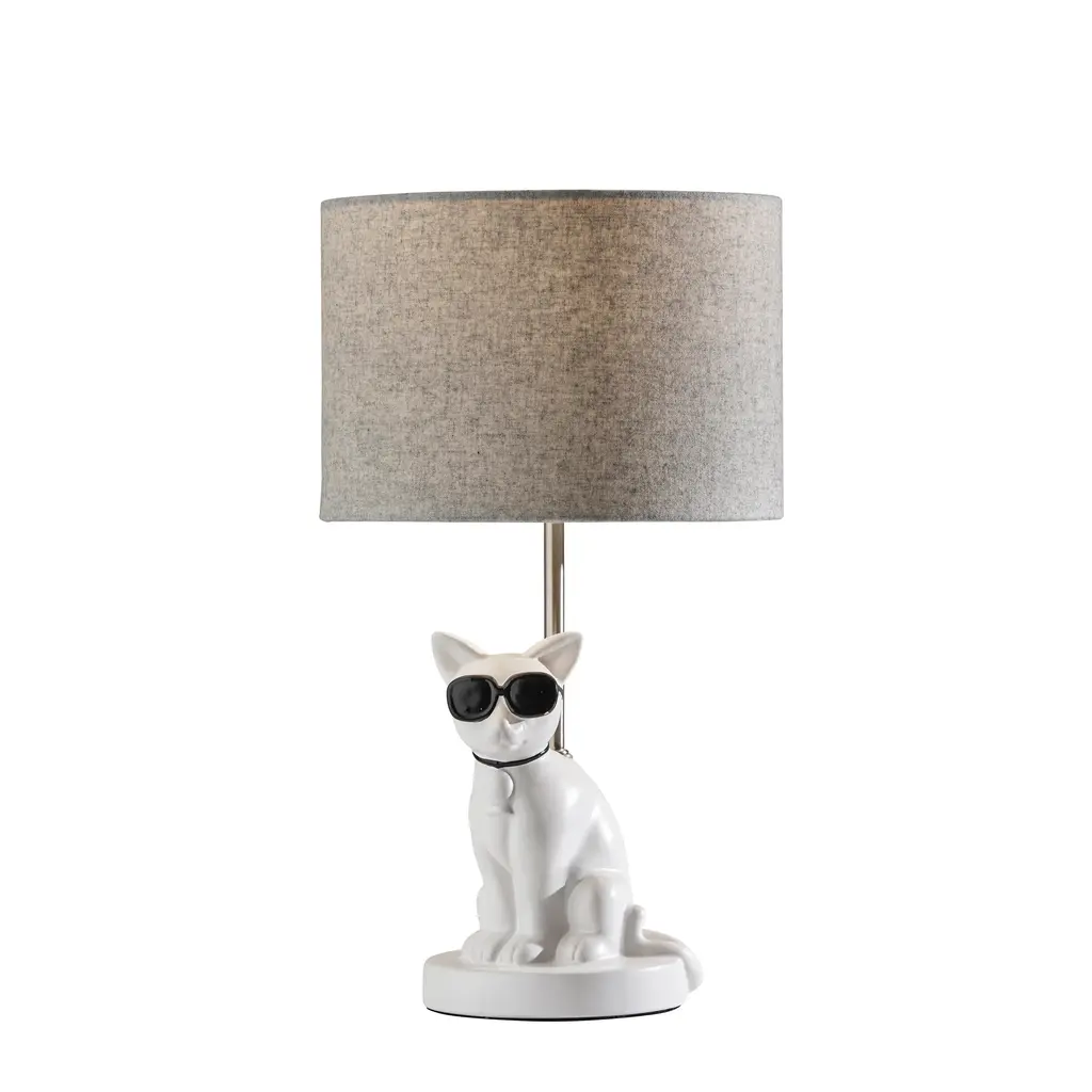 Add a pop of playful décor to your bedside or living room with the Sunny Cat Table Lamp. Matte white resin is crafted into the shape of a cute kitten. The black sunglasses age the lamp up a bit and add the necessary cool factor to the look. Topped with a light grey soft touch fabric shade, this is the perfect addition to any space. Turn the lamp on and off with a simple rotary switch on the socket. Features: White ceramic with brushed steel neck Light Grey Soft Touch Fabric Shade 60W Type A (not included) Rotary Socket switch E26 Medium Base White Ceramic Dog Shaped Base Clear 65-inch Cord UL Listed Some Assembly Required 1-Year Limited Manufacturer Warranty Measurements: Height: 18-inches Width: 10-inch Extension/Depth: 10-inch Weight: 3.01lbs Tube diameter is .5-inch Shade Dimensions: 10-inch Dia. X 7-inchH Base Dimensions: 6.5-inch Diameter