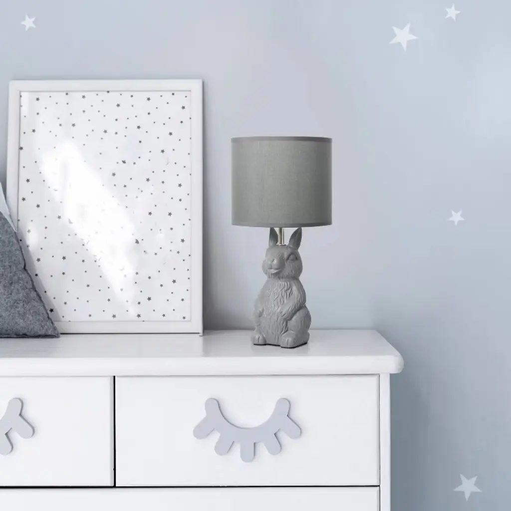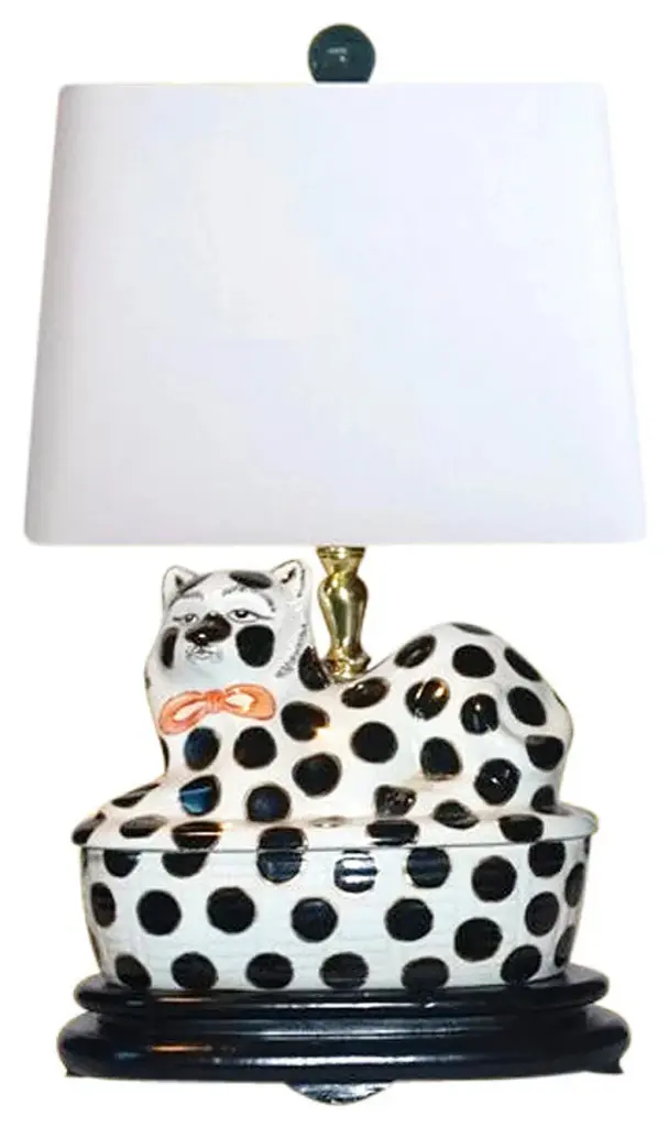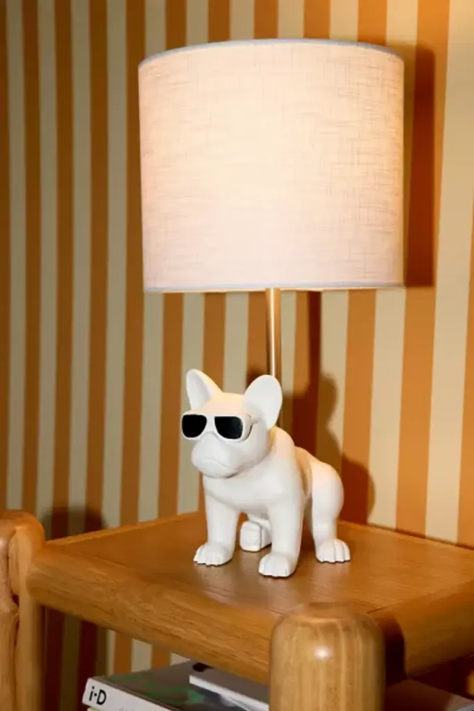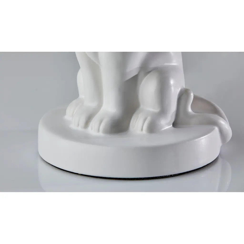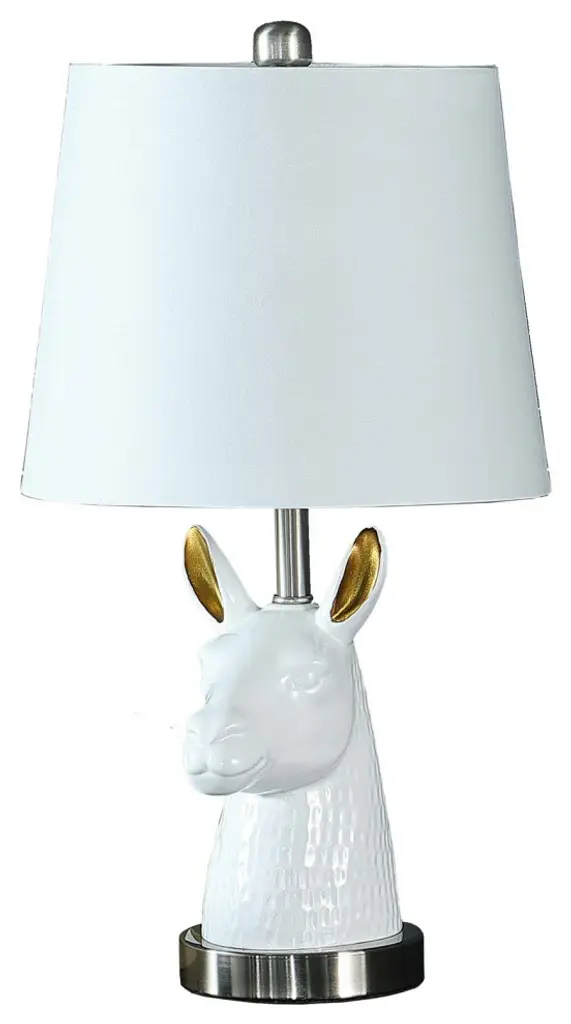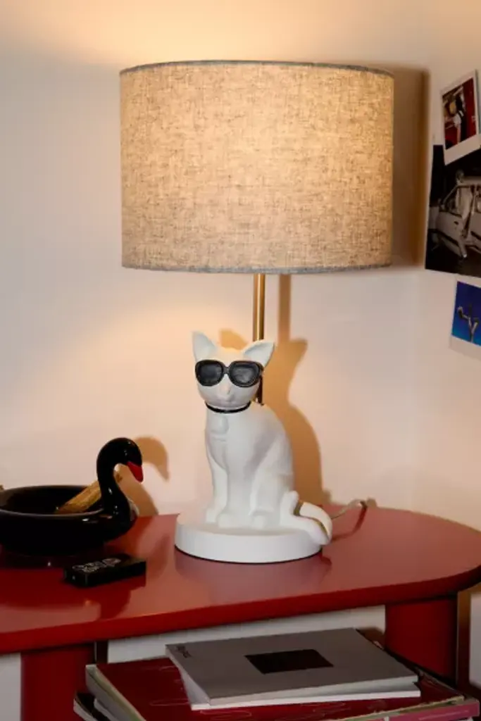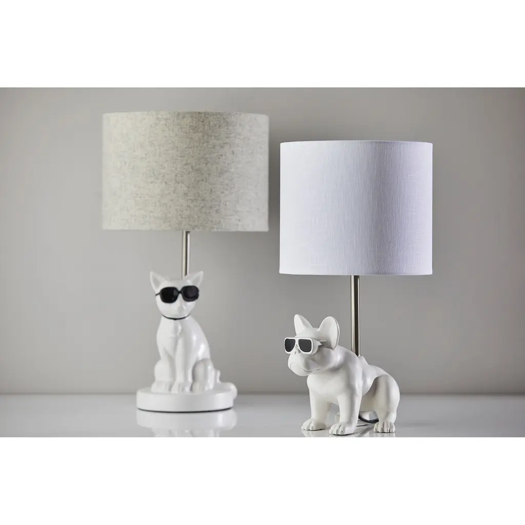 Add a pop of playful décor to your bedside or living room with the Sunny Cat Table Lamp. Matte white resin is crafted into the shape of a cute kitten. The black sunglasses age the lamp up a bit and add the necessary cool factor to the look. Topped with a light grey soft touch fabric shade, this is the perfect addition to any space. Turn the lamp on and off with a simple rotary switch on the socket. Features: White ceramic with brushed steel neck Light Grey Soft Touch Fabric Shade 60W Type A (not included) Rotary Socket switch E26 Medium Base White Ceramic Dog Shaped Base Clear 65-inch Cord UL Listed Some Assembly Required 1-Year Limited Manufacturer Warranty Measurements: Height: 18-inches Width: 10-inch Extension/Depth: 10-inch Weight: 3.01lbs Tube diameter is .5-inch Shade Dimensions: 10-inch Dia. X 7-inchH Base Dimensions: 6.5-inch Diameter