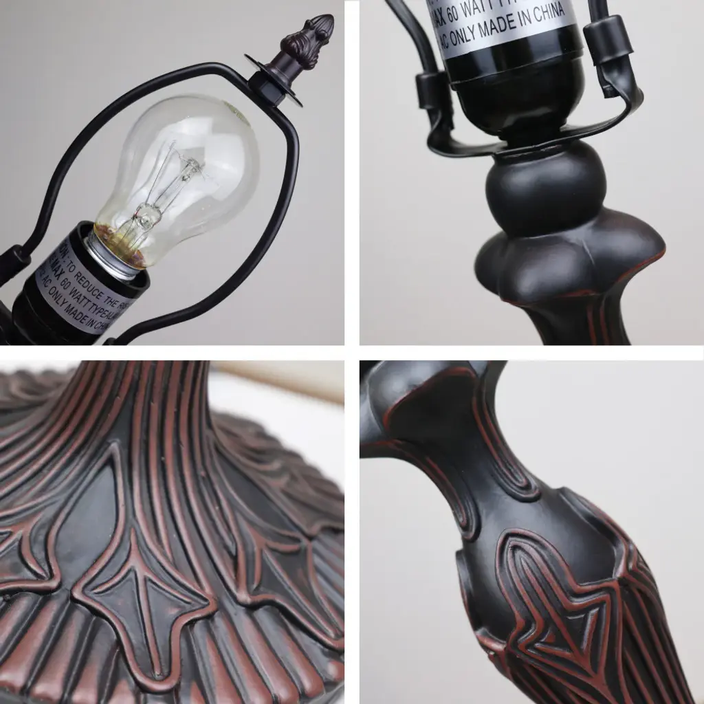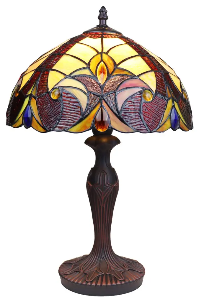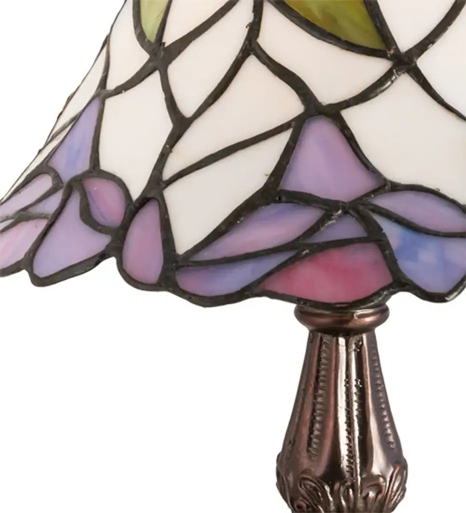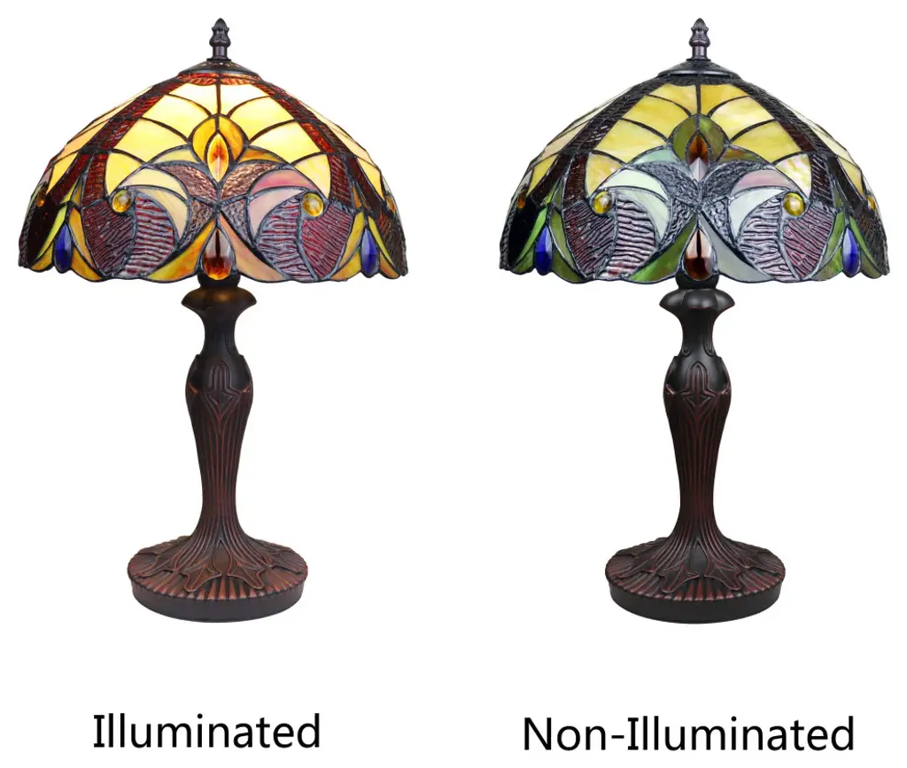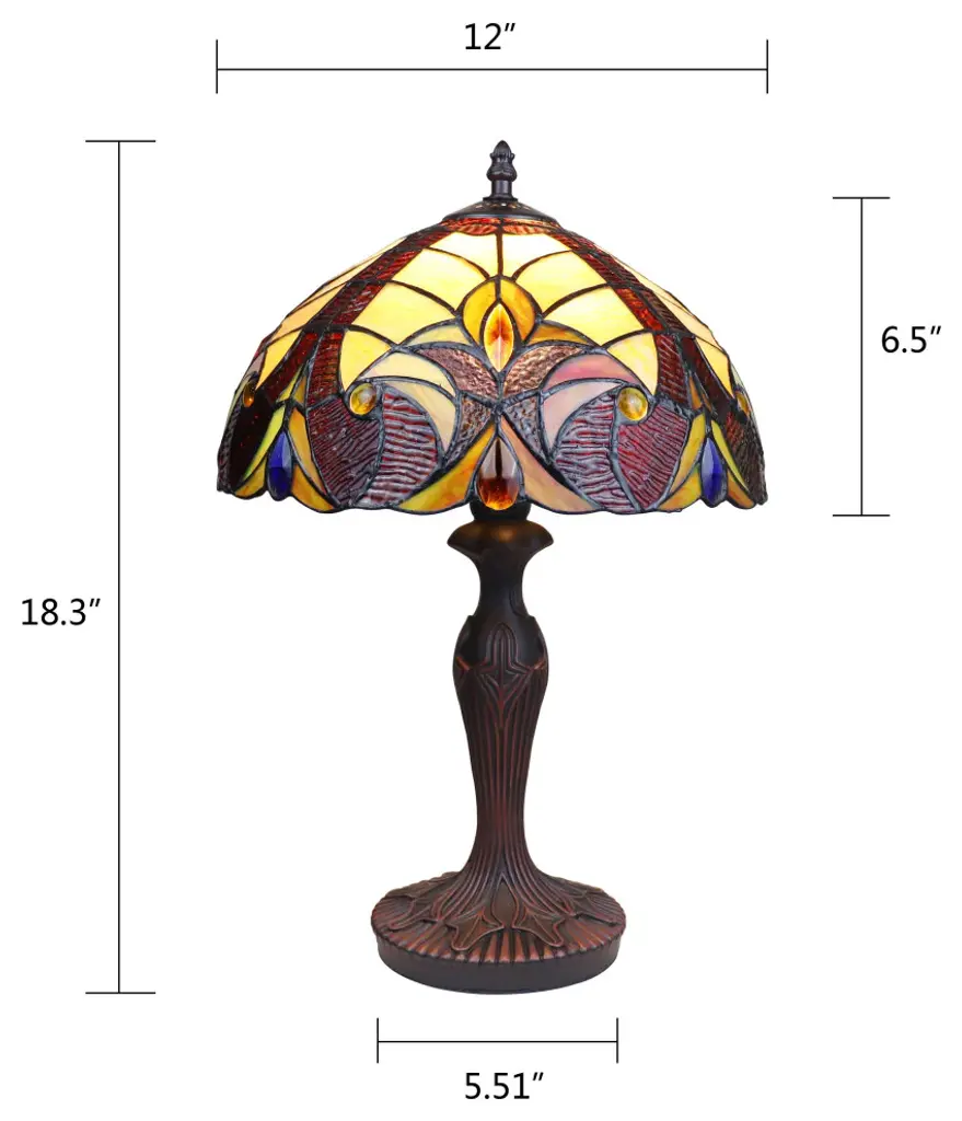 Adia is a beautiful, stained glass table lamp in a traditional Victorian style, featuring a dark bronze base and an on-cord rotary switch. This lamp would be perfect in a bedroom, living room, and dining room. The shade is hand-crafted, using the same methods developed by Louis Comfort Tiffany in the early 1900''s. This process entails using 176 hand cut stained art glass pieces and 20 glass beads, each wrapped in fine copper foil and soldered together at extremely high temperatures to form each unique piece. Exact size to the nearest inch may vary, and exact color of each glass piece may vary due to each piece being hand crafted. First image is with the light shining through, second image is with no light. Dry listed and recommended for an indoor setting.