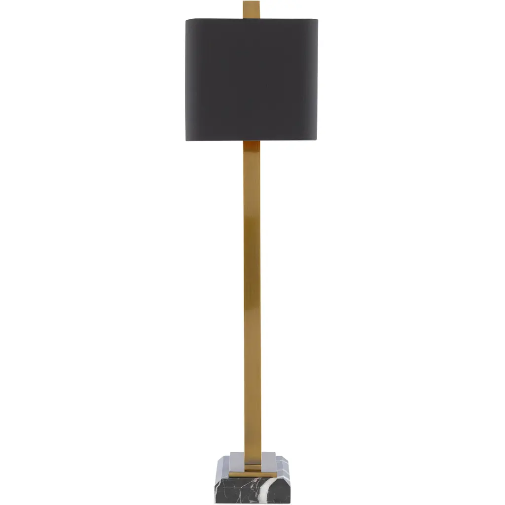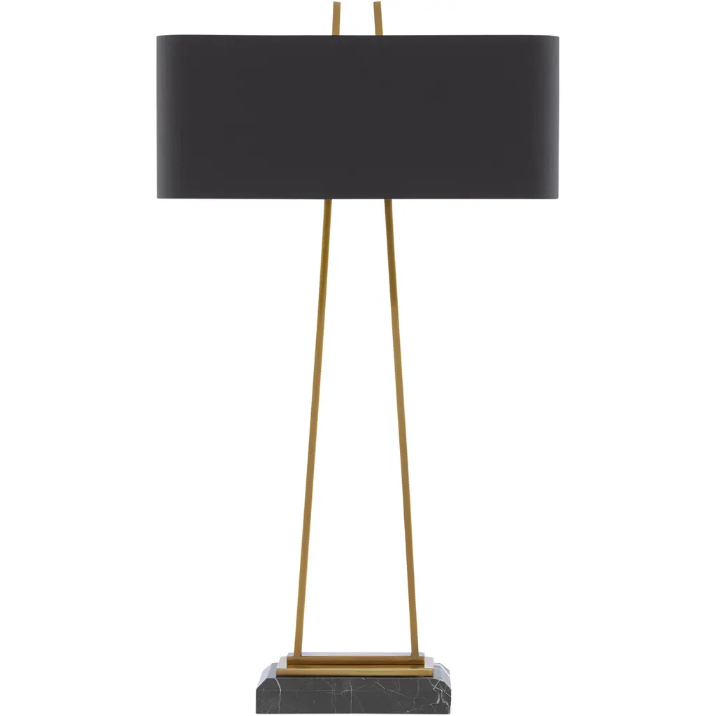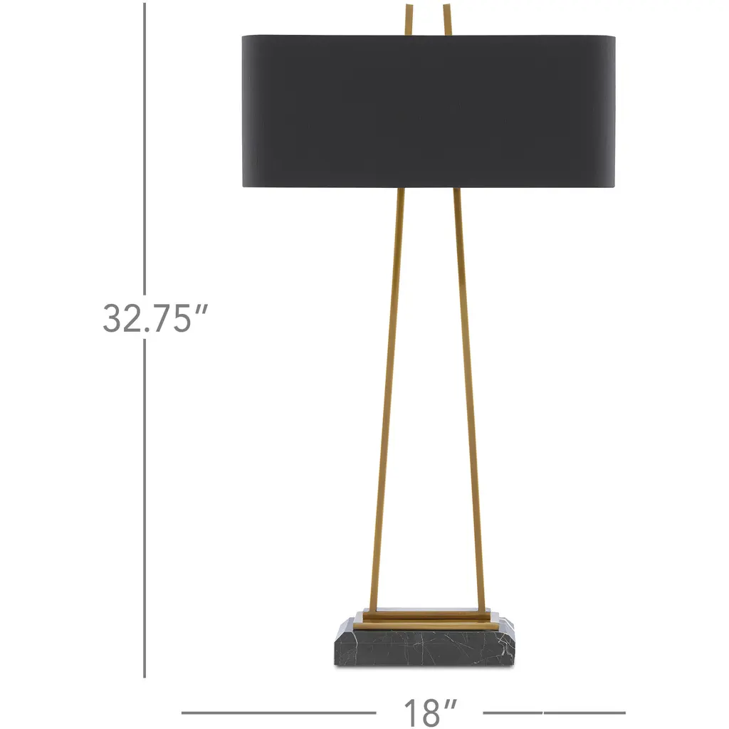 A contradiction in terms, our Adorn Large Table Lamp is ornamented but only with the cleanest of lines. The metal frame in an antique brass finish leaves the pyramid shape it is reaching toward unfinished as it rises to the matching finial. The black marble base is a luxurious touch, though it, too, is minimal in its makeup. The black shantung shade with its gold lining represents the culmination of stylistic brilliance for this gold lamp. We also offer the Adorn in a smaller size.