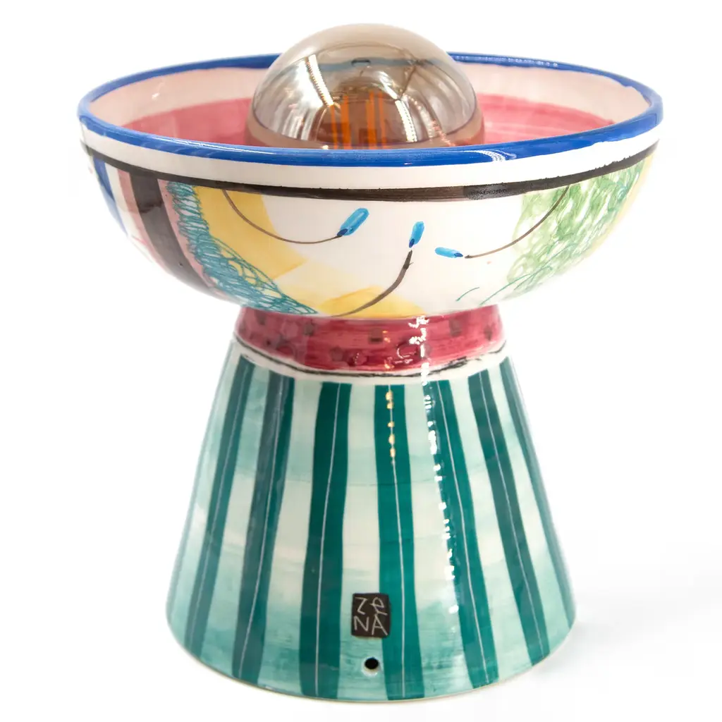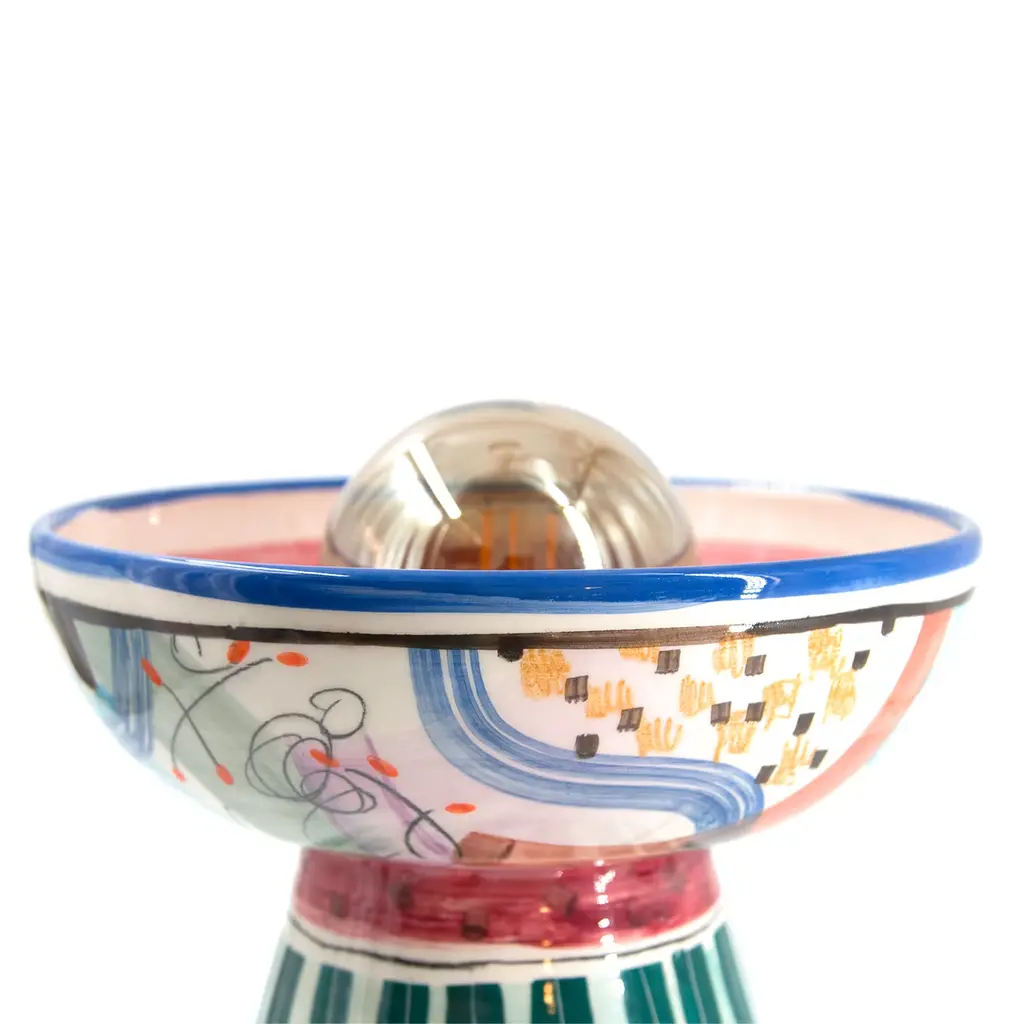 A synthesis between the strong simplicity of Hellenic culture and the intriguing arabesques typical of Islamic visual tradition inspired this superb ceramic table lamp. Minutely painted by hand with secure and vibrant brushstrokes, each piece flaunts unpredictable and unrepeatable traits owed to its precious artisan quality. Please contact the Concierge for details about technical specs.