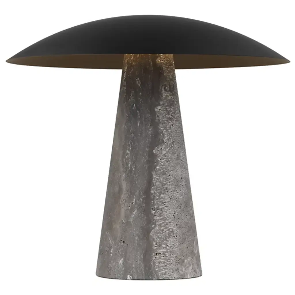 The Aegis Travertine LED Table Lamp from Visual Comfort Modern combines sculptural form with natural character. Designed by Sean Lavin, this table lamp features a solid travertine base—each with its own unique texture and tone—paired with a brass shade that directs warm, focused light. The minimalist profile draws from mid-century modern influences while offering refined functionality, including a convenient cord button dimmer and brightening tables with its grounded architectural presence.