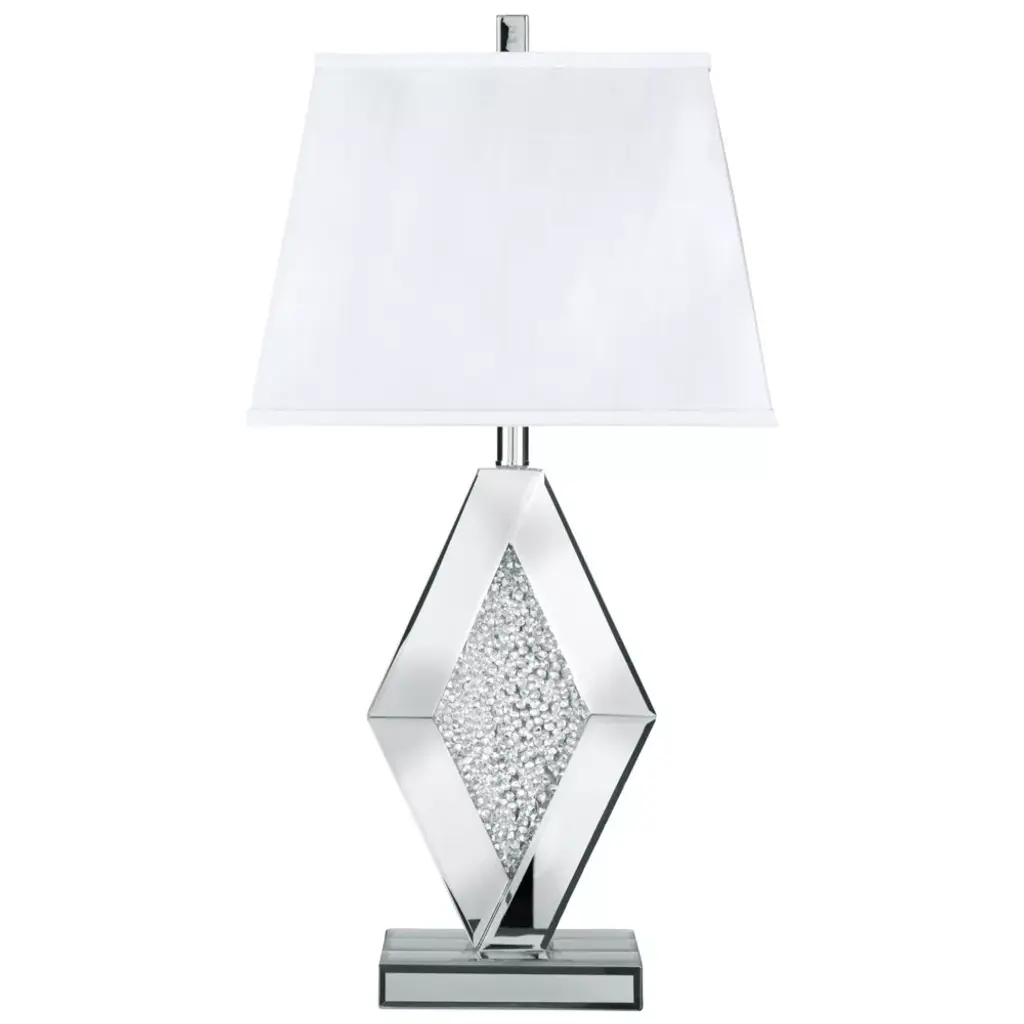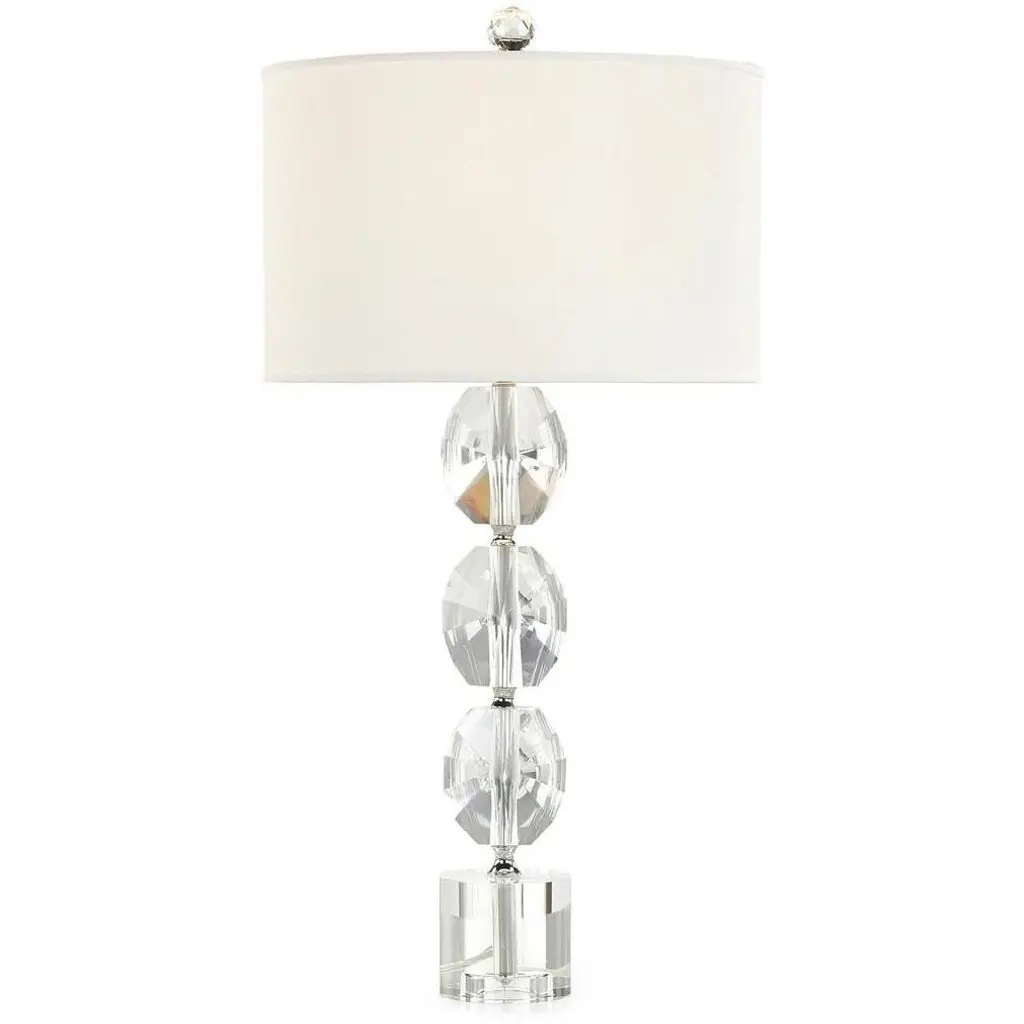 The Afiado Table Lamp features an ornate, hand-carved crystal centerpiece that resembles a faceted spear tip. The gorgeous motif on a round crystal base is emphasized by faceted ball accents on the body, matched by the finial. This three-way turnkey lamp features metal hardware in a Polished Nickel finish, complementing the clear tones.