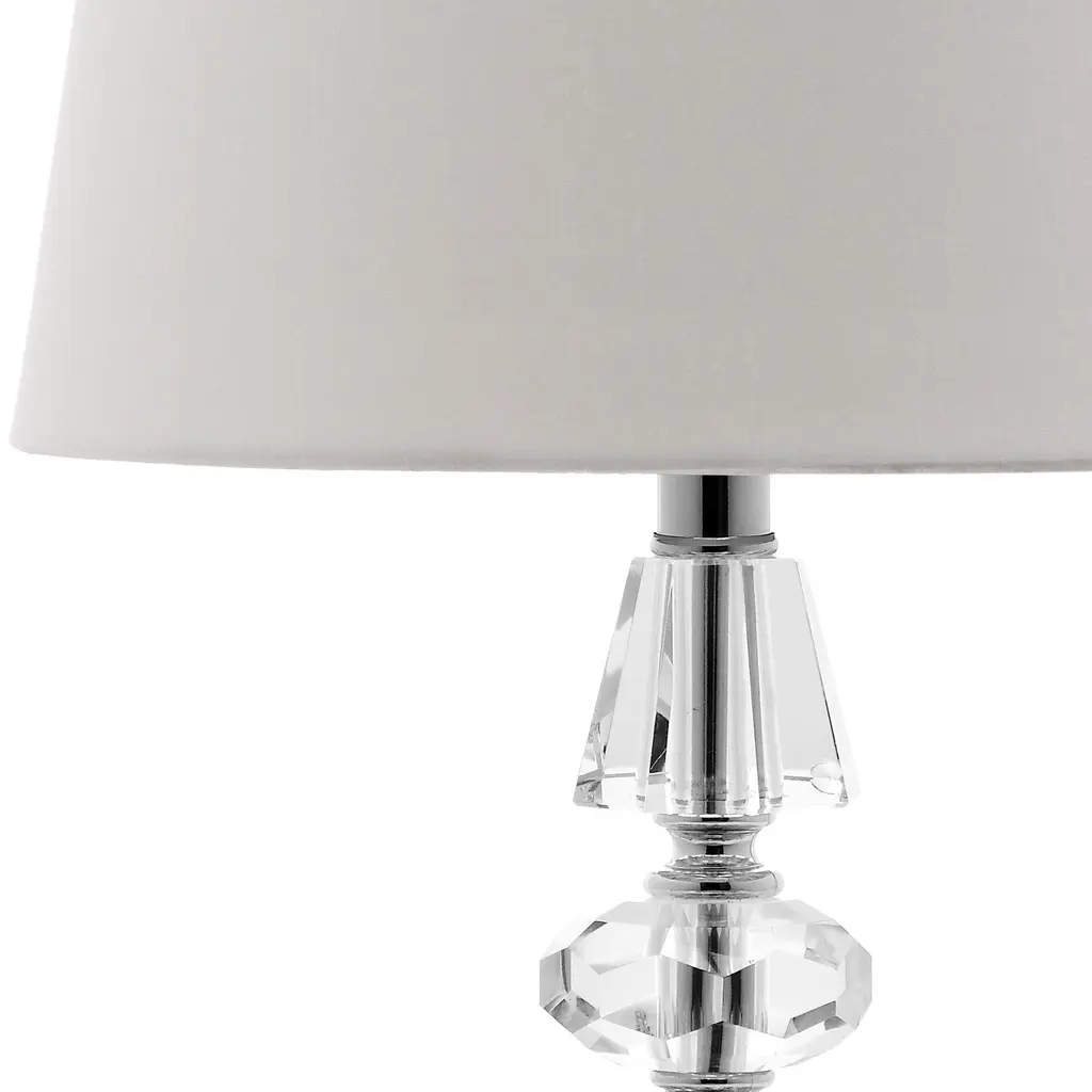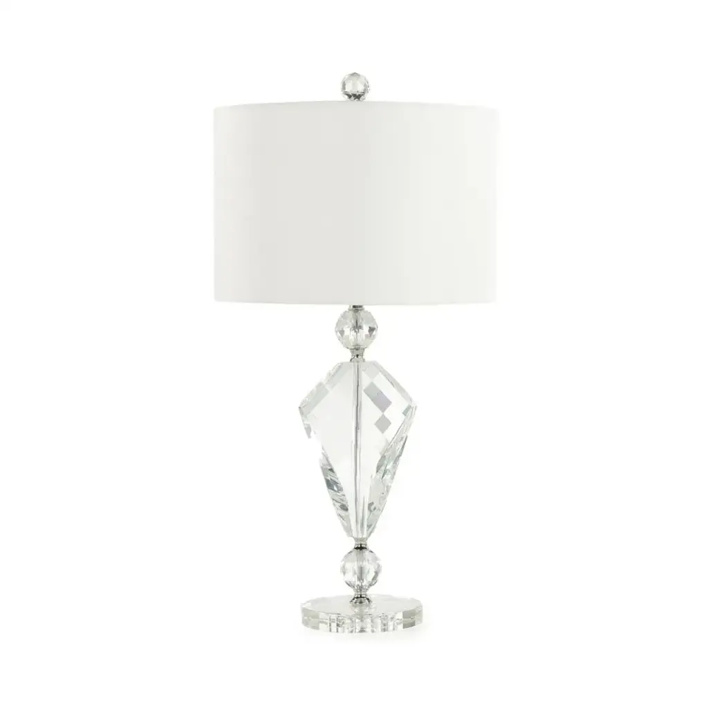 The Afiado Table Lamp features an ornate, hand-carved crystal centerpiece that resembles a faceted spear tip. The gorgeous motif on a round crystal base is emphasized by faceted ball accents on the body, matched by the finial. This three-way turnkey lamp features metal hardware in a Polished Nickel finish, complementing the clear tones.