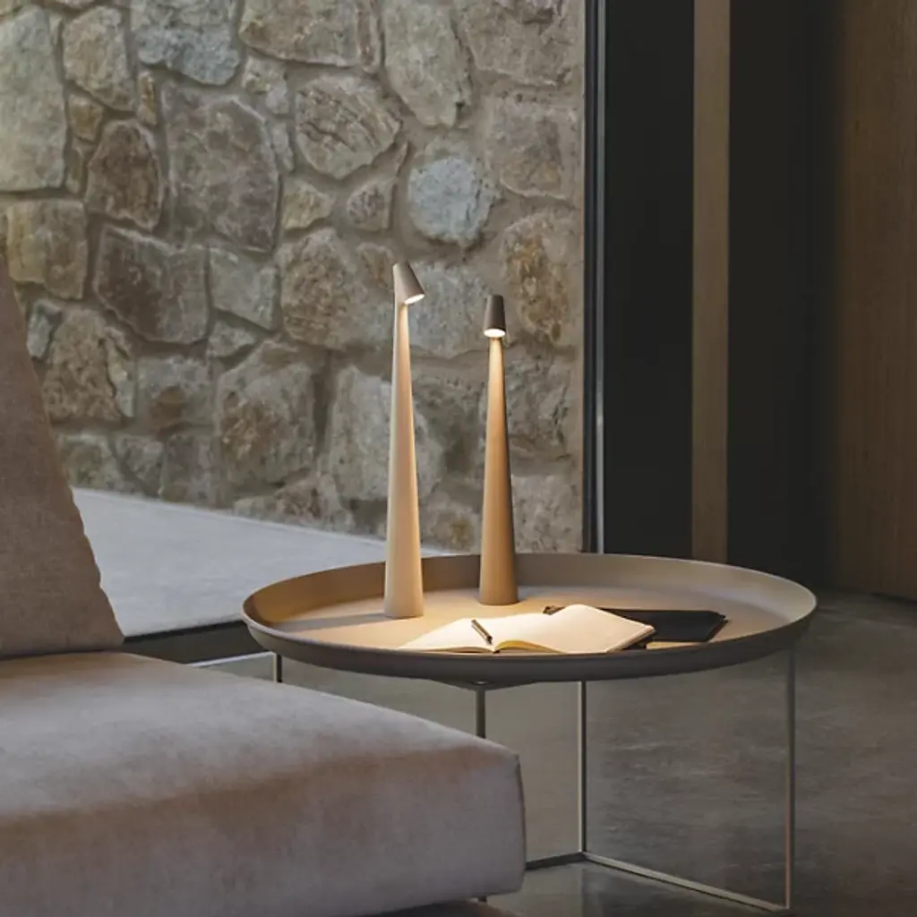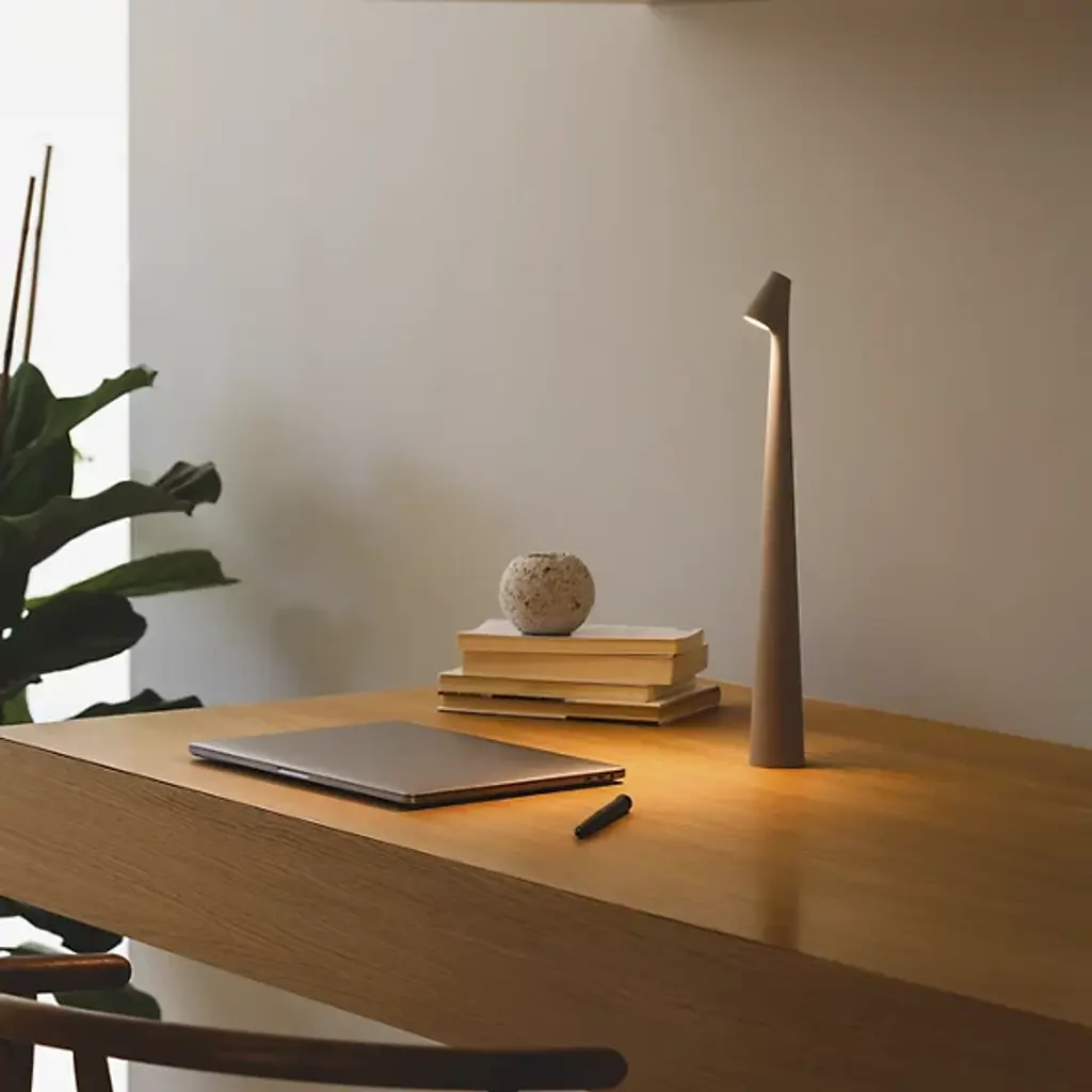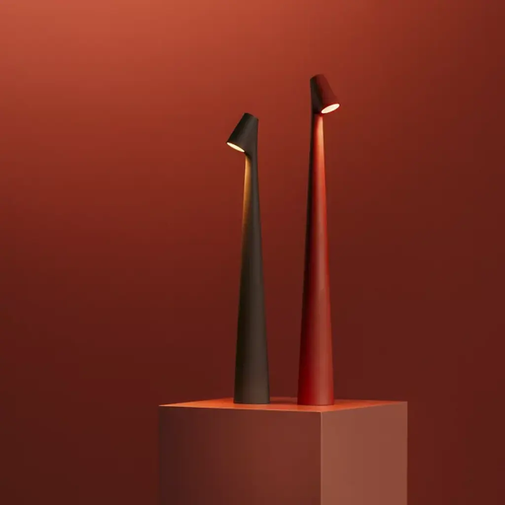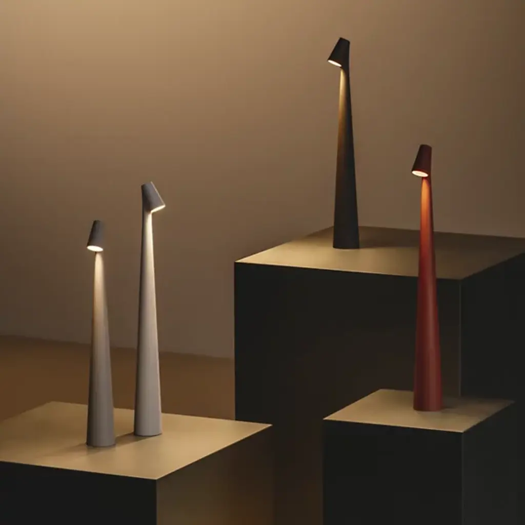 The Africa LED Rechargeable Table Lamp from Vibia blends thoughtful form with portable functionality. Designed by Francisco Gomez Paz and made in Spain, its slim, conical body and compact head give it a sculptural feel that’s easy to move and use. A push-button dimmer at the head controls three light levels powered by a rechargeable LED. Finished in a matte lacquer and available in four earthy tones, this aluminum and polycarbonate lamp brings warmth and character to any setting.